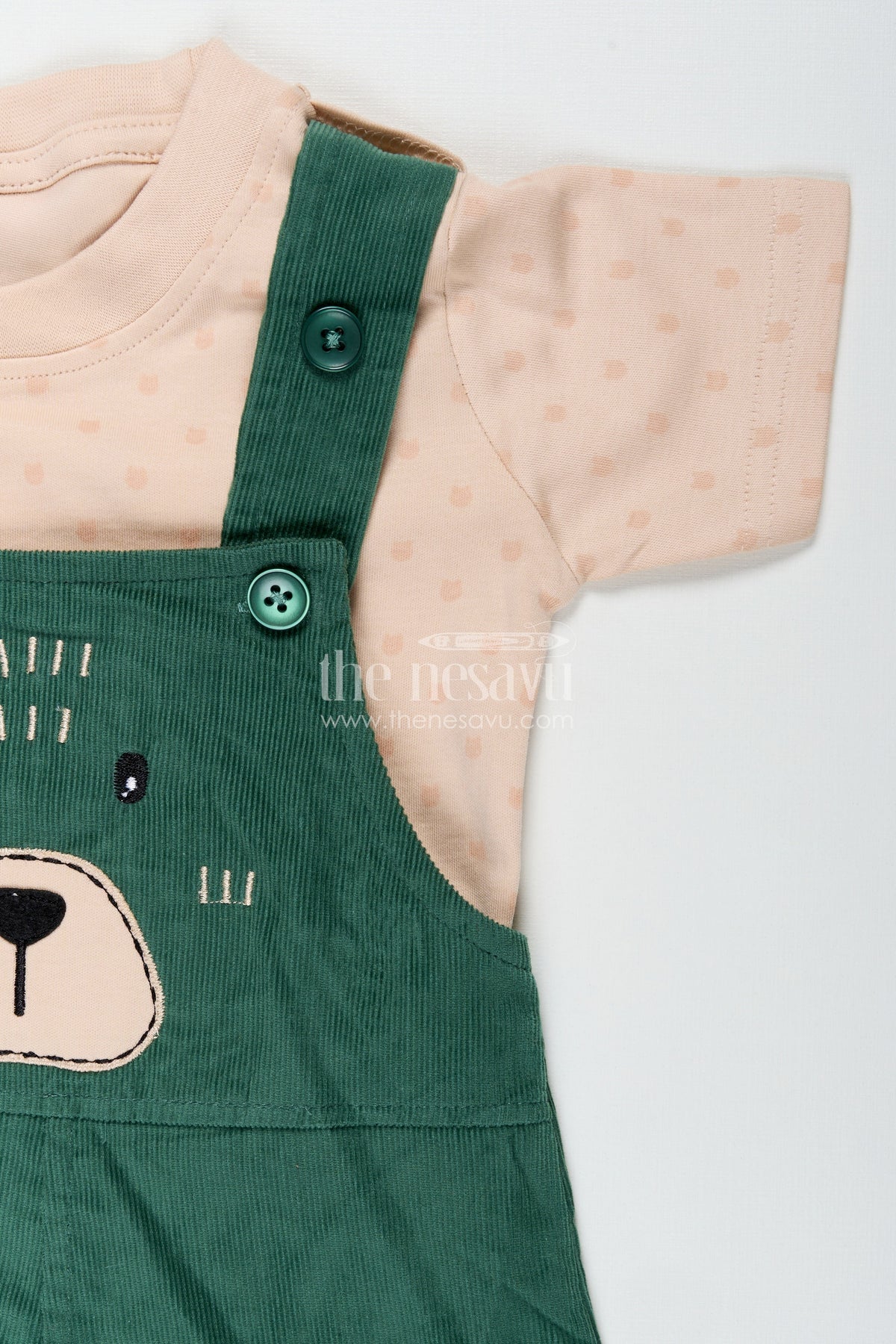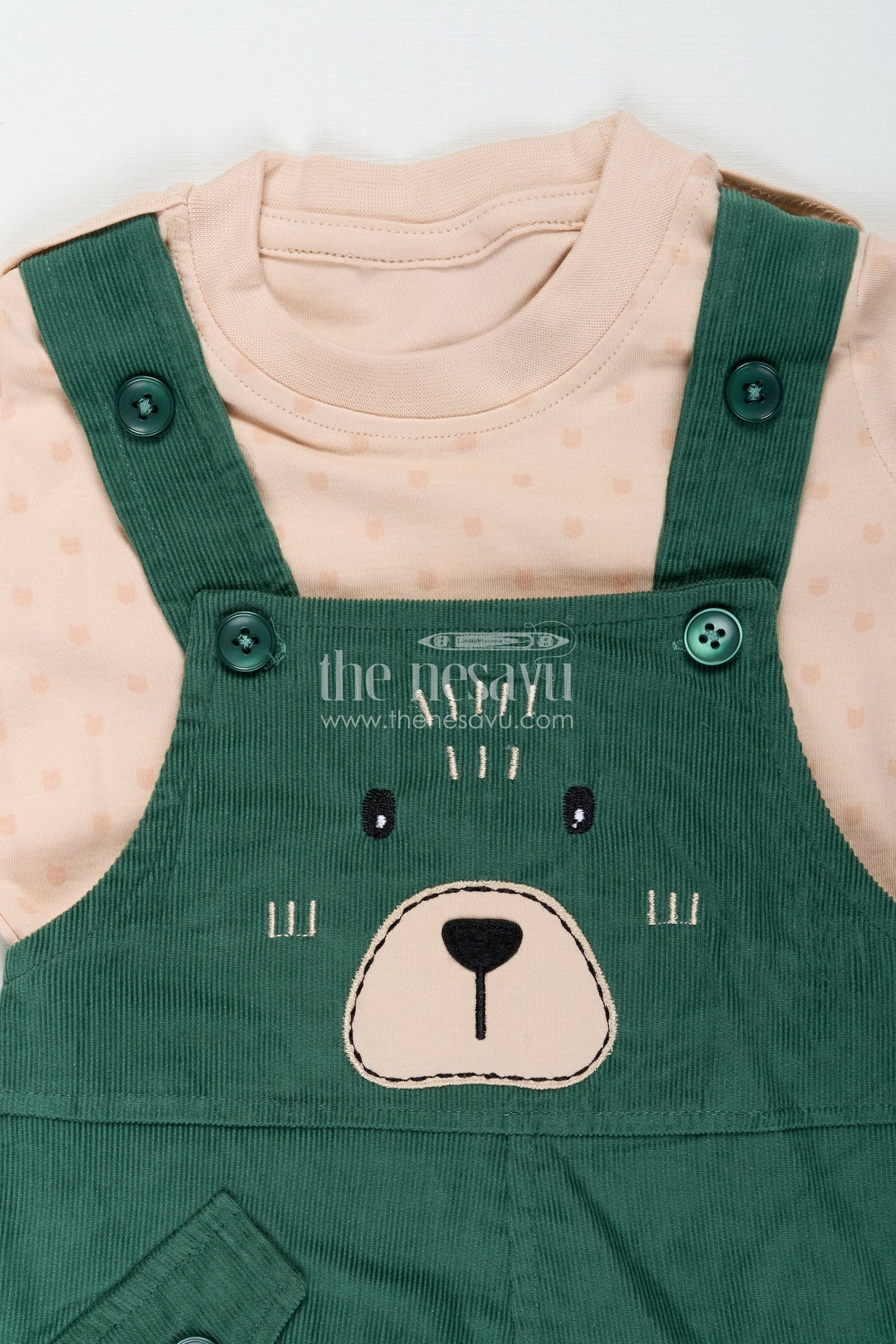 Your little one will look irresistibly cute and feel ultra-comfy in this charming green dungaree set for babies from Nesavu. The outfit features a soft beige printed T-shirt made from breathable knitted cotton jersey paired with green corduroy dungarees that sport a sweet bear face embroidery and buttoned pocket detail. Designed with gentle stretch and a relaxed fit, this set ensures comfort throughout the day—perfect for playdates or everyday outings. Easy-to-fasten shoulder buttons and fuss-free care make it a parent-approved choice. The classic color combo and adorable design offer timeless style for your baby boy.
