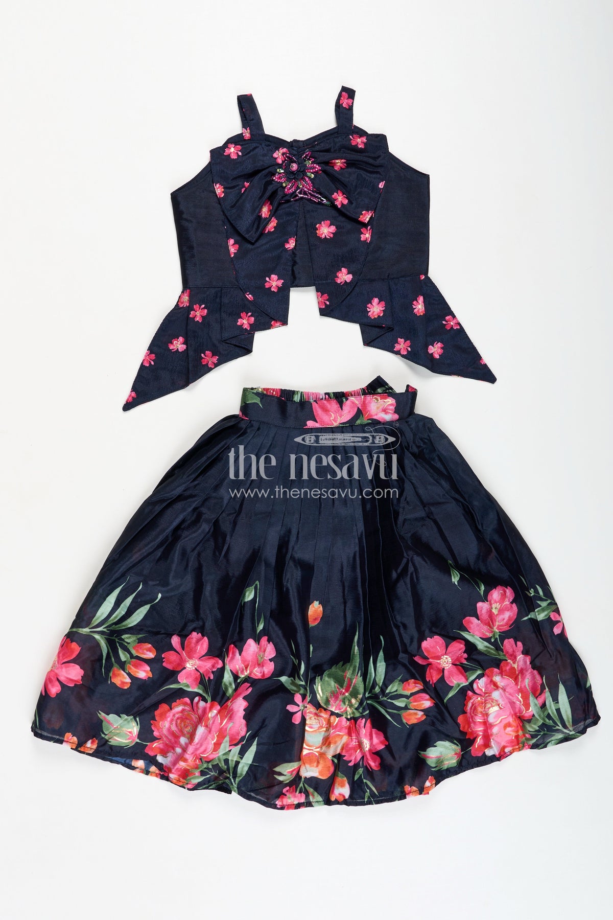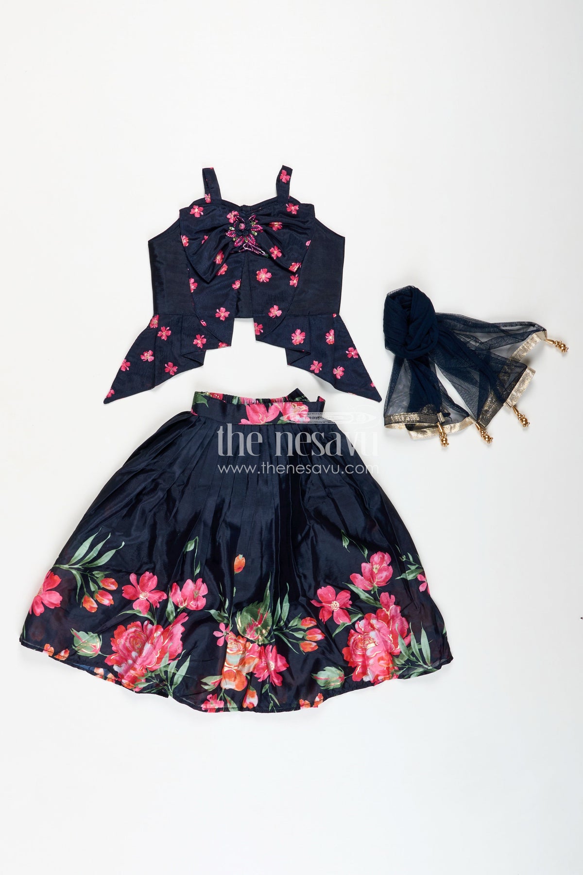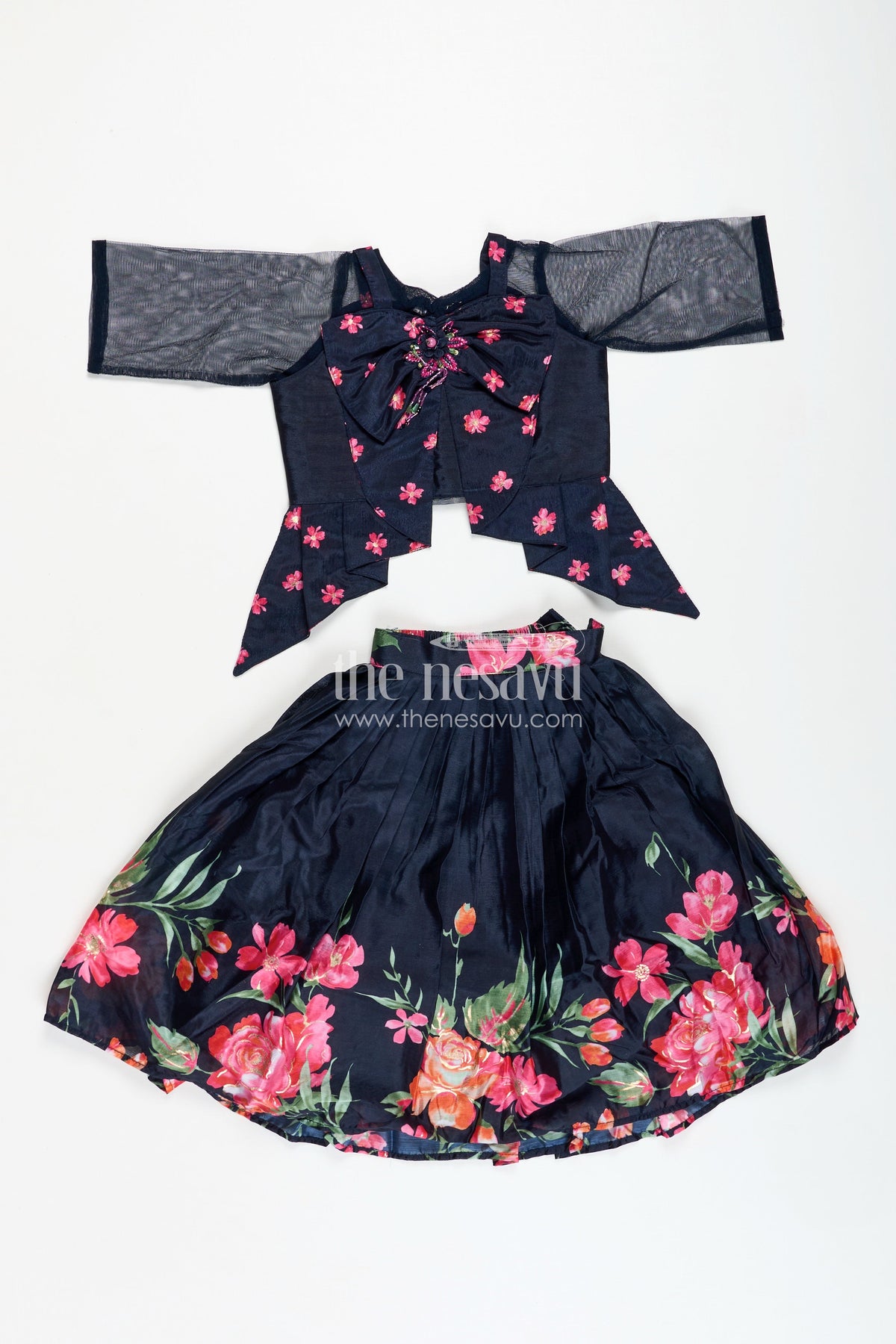 Indowestern Lehenga brings a modern fusion twist to traditional wear with its chic design and elegant finish. Made from soft muslin silk, the jet-black base features vivid digital floral prints that pop with contrast and charm. The asymmetrical draped silhouette with bow detailing on the bodice adds a touch of drama, making this outfit a perfect pick for modern celebrations or fashion-forward family functions. The lightweight fabric ensures comfort, while the unique styling provides a runway-ready vibe for your little one.