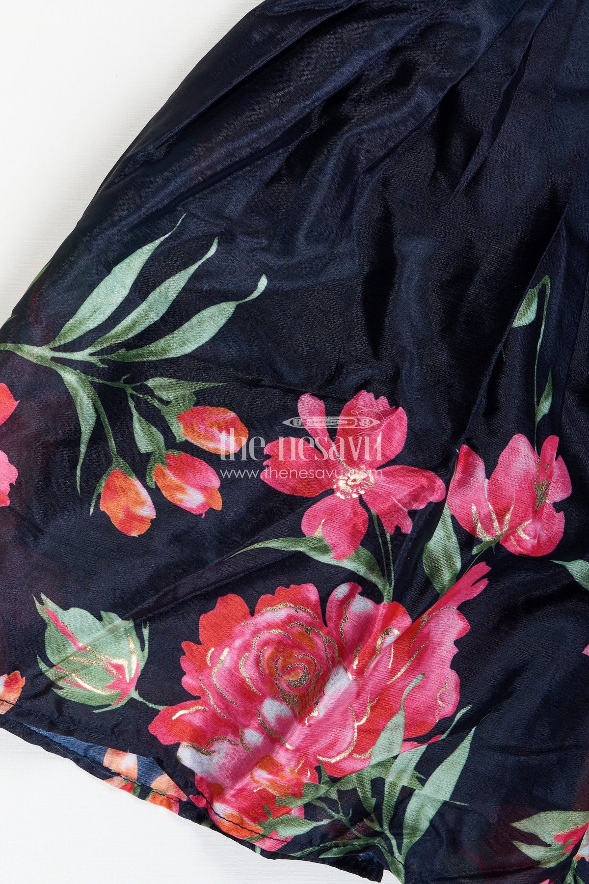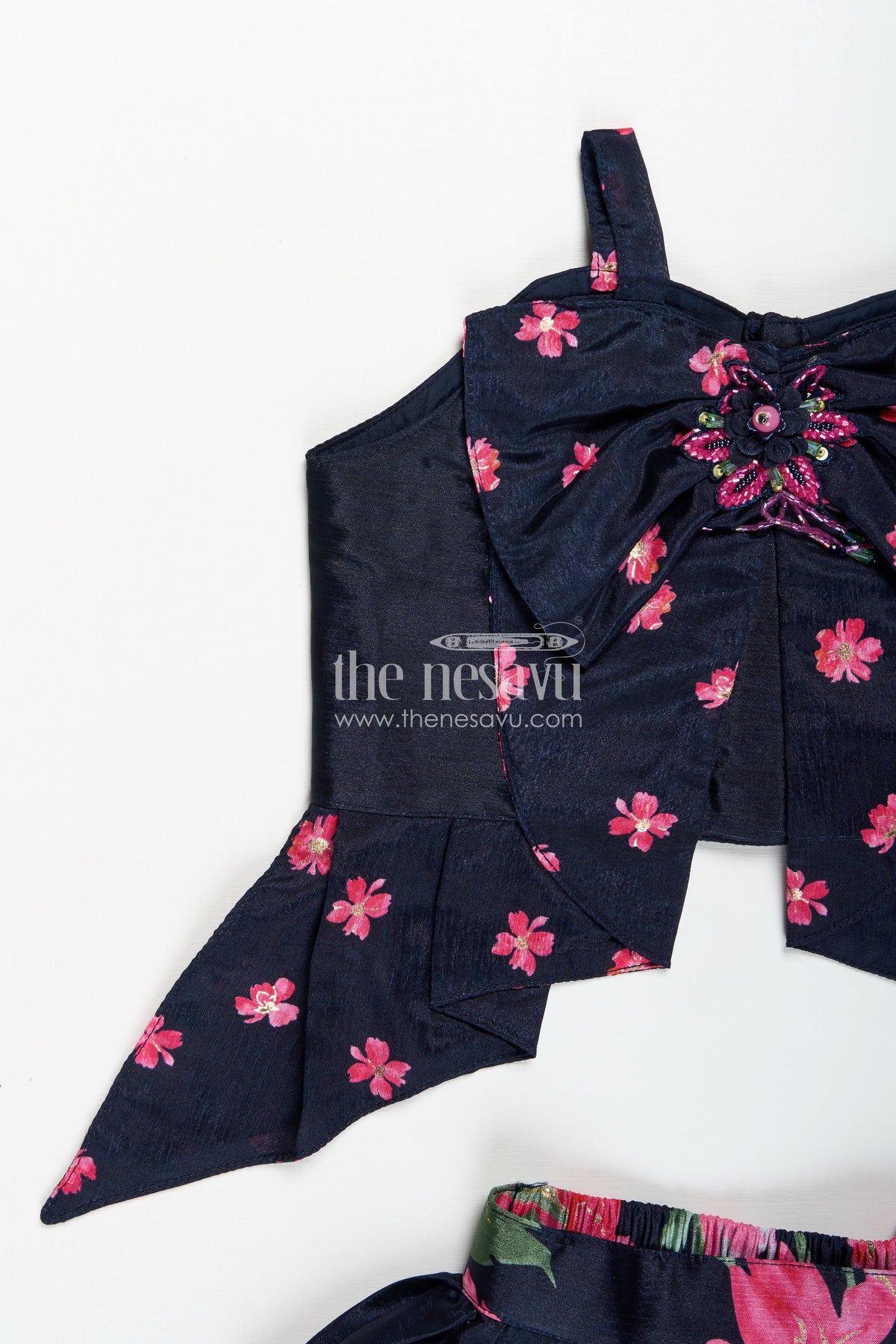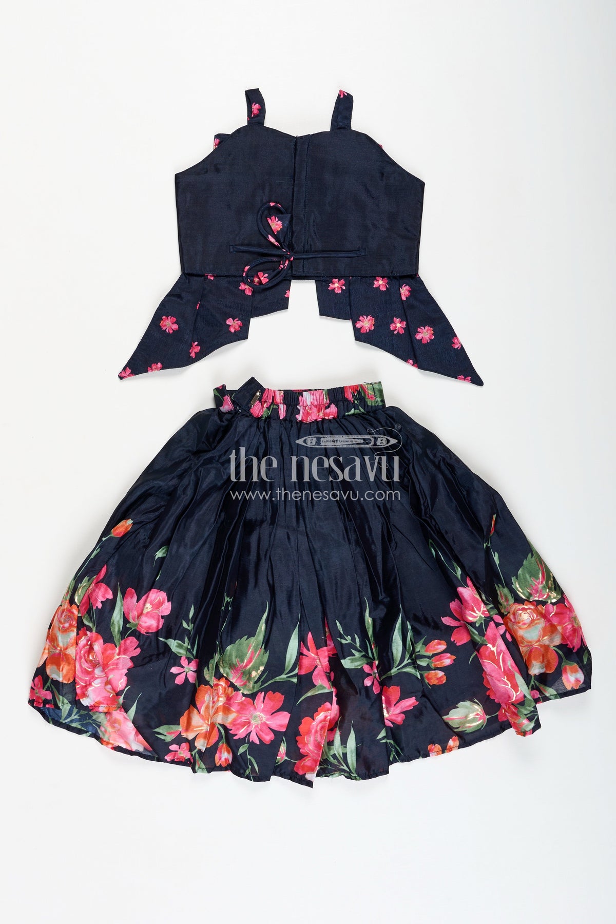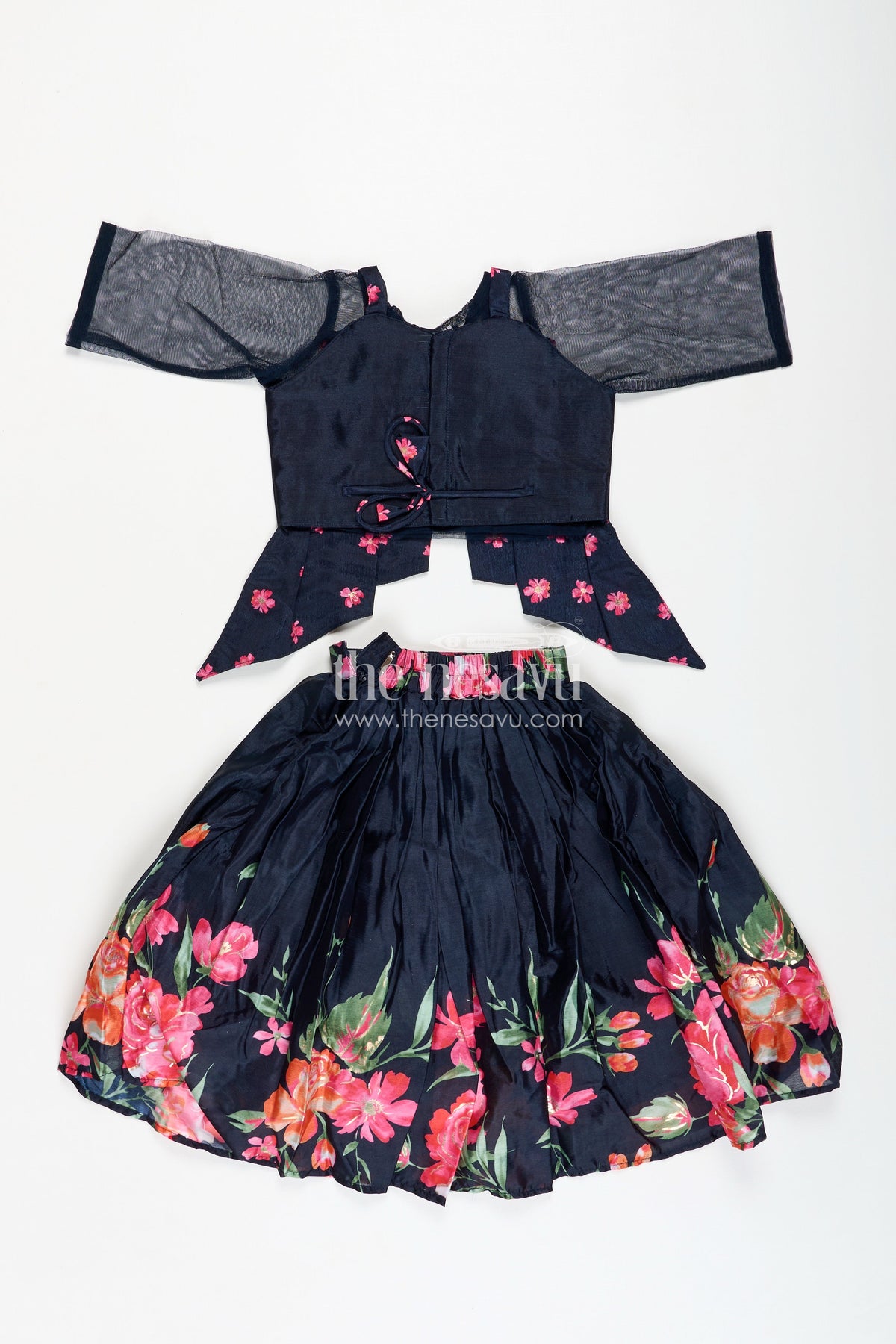 Indowestern Lehenga brings a modern fusion twist to traditional wear with its chic design and elegant finish. Made from soft muslin silk, the jet-black base features vivid digital floral prints that pop with contrast and charm. The asymmetrical draped silhouette with bow detailing on the bodice adds a touch of drama, making this outfit a perfect pick for modern celebrations or fashion-forward family functions. The lightweight fabric ensures comfort, while the unique styling provides a runway-ready vibe for your little one.