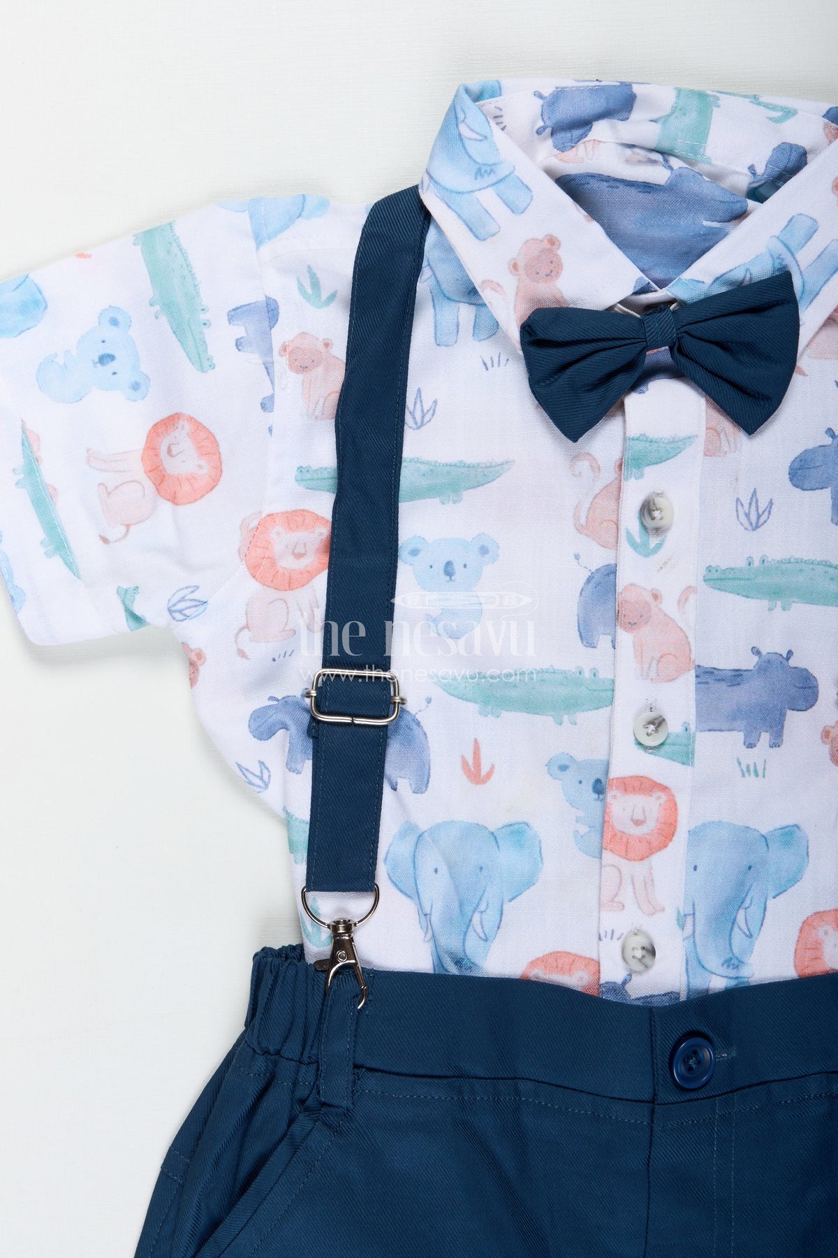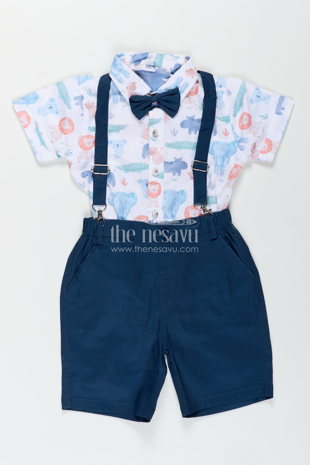 Add fun to your baby boy’s wardrobe with the infant navy blue dress set by Nesavu, featuring a playful digital print shirt and matching navy blue shorts. Made from lightweight cotton, the shirt is adorned with a safari of adorable animals including lions, elephants, crocodiles, and more, making it a delightful pick for daytime outings or playdates. A navy blue bow tie adds a smart finishing touch to the button-down shirt. The shorts are crafted from soft, durable cotton with suspenders for extra charm and a secure fit. Designed for both comfort and mobility, this two-piece set is perfect for your infant’s first steps into style and adventure.