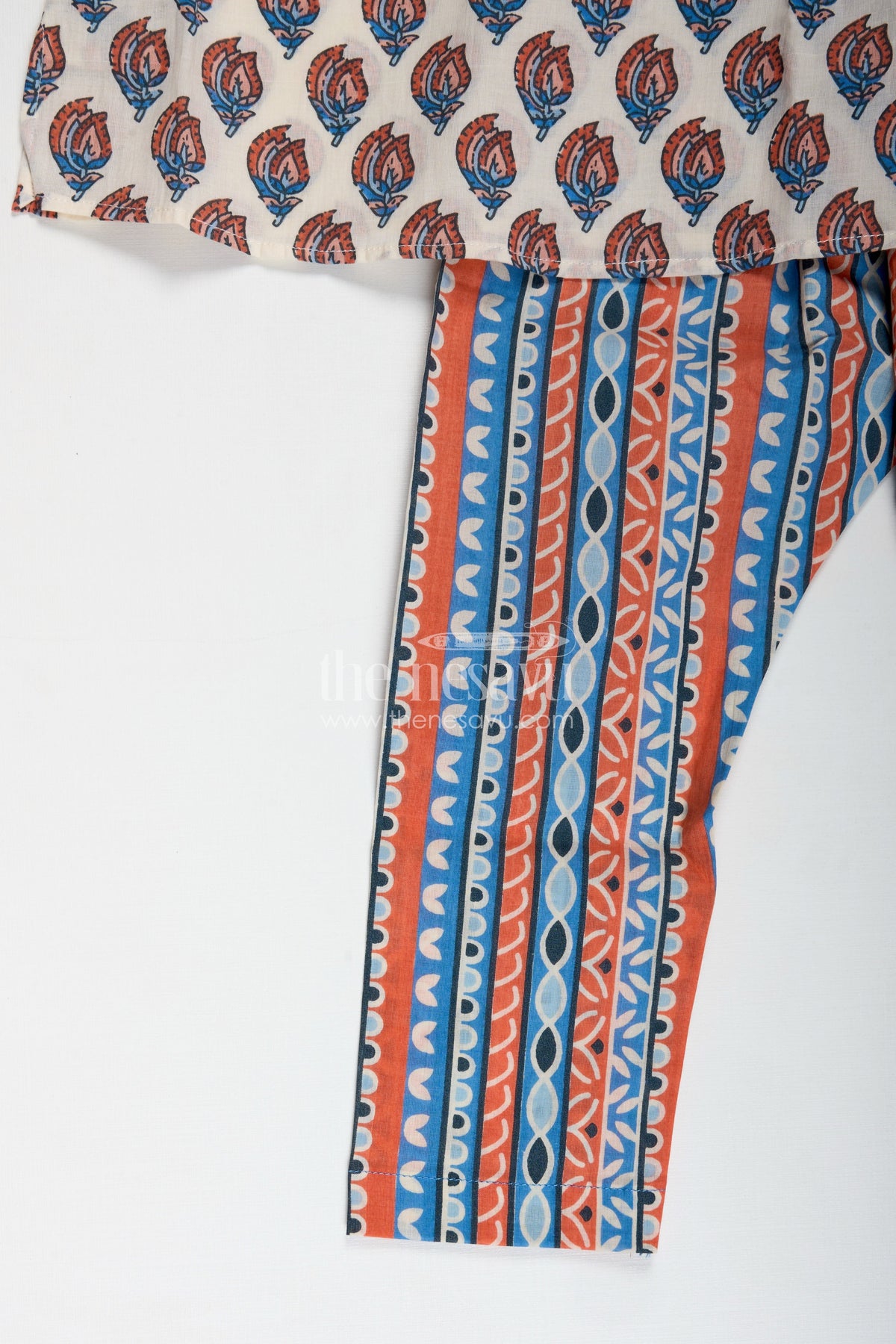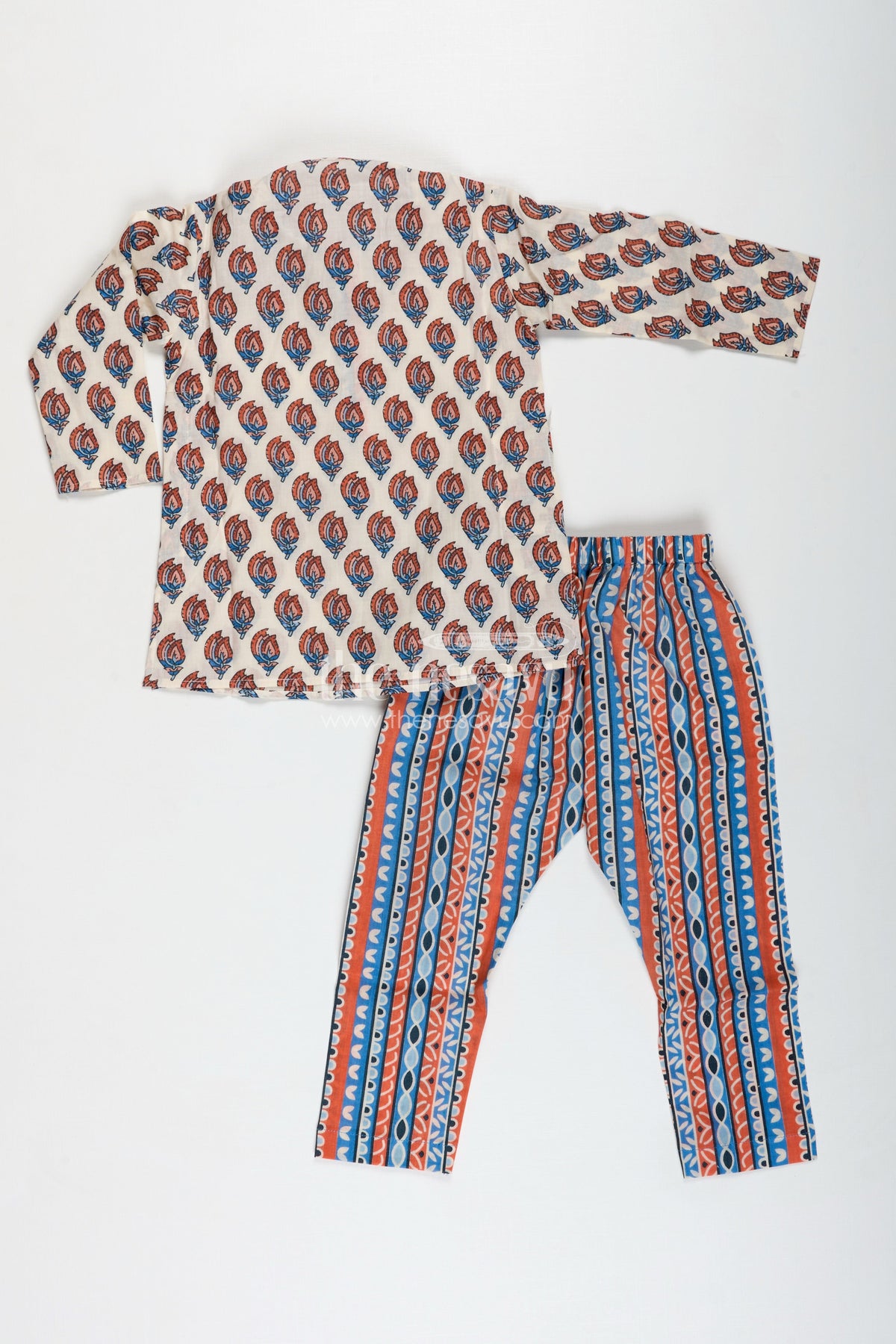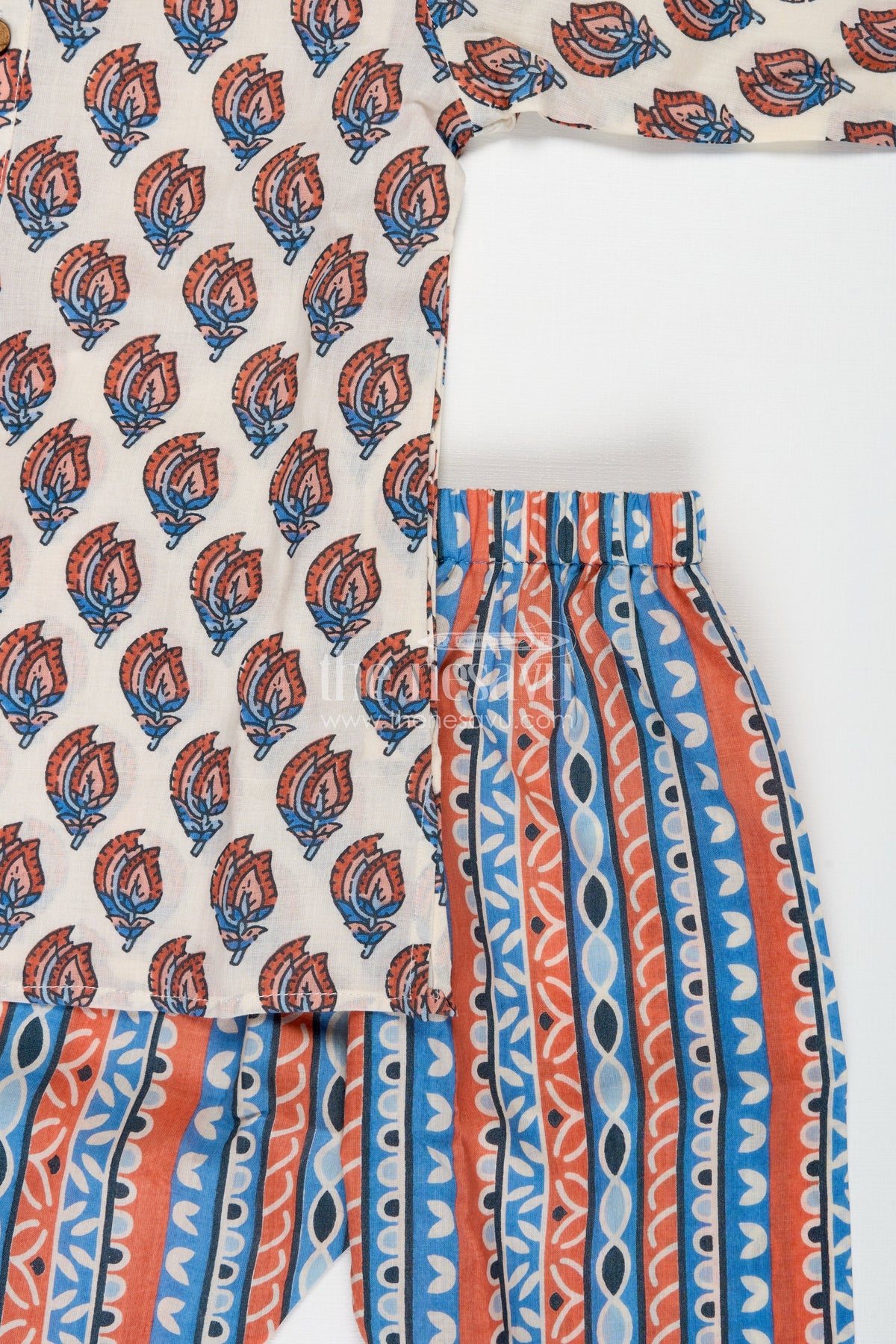 Kids Kurta Set for Festivals and Family Gatherings is a vibrant blend of comfort and culture. The cream kurta is decorated with eye-catching block-printed motifs in traditional red and blue, paired with contrast striped pants in bold ethnic patterns. Made from breathable cotton, this outfit is ideal for lively family events and festive days. The full-sleeve kurta ensures coverage while the lightweight pants offer ease of movement, making it perfect for playful occasions. The mix of classic prints and contemporary comfort makes this a delightful ethnic choice for kids.