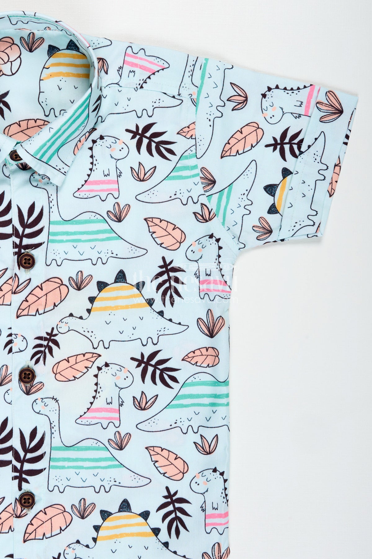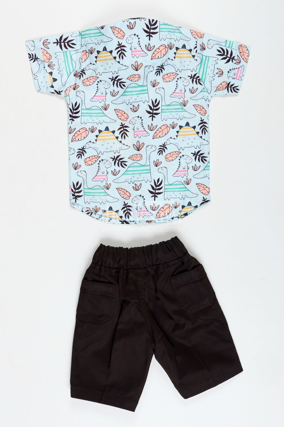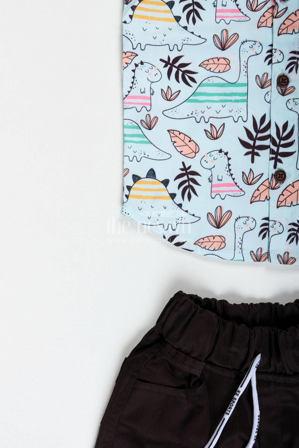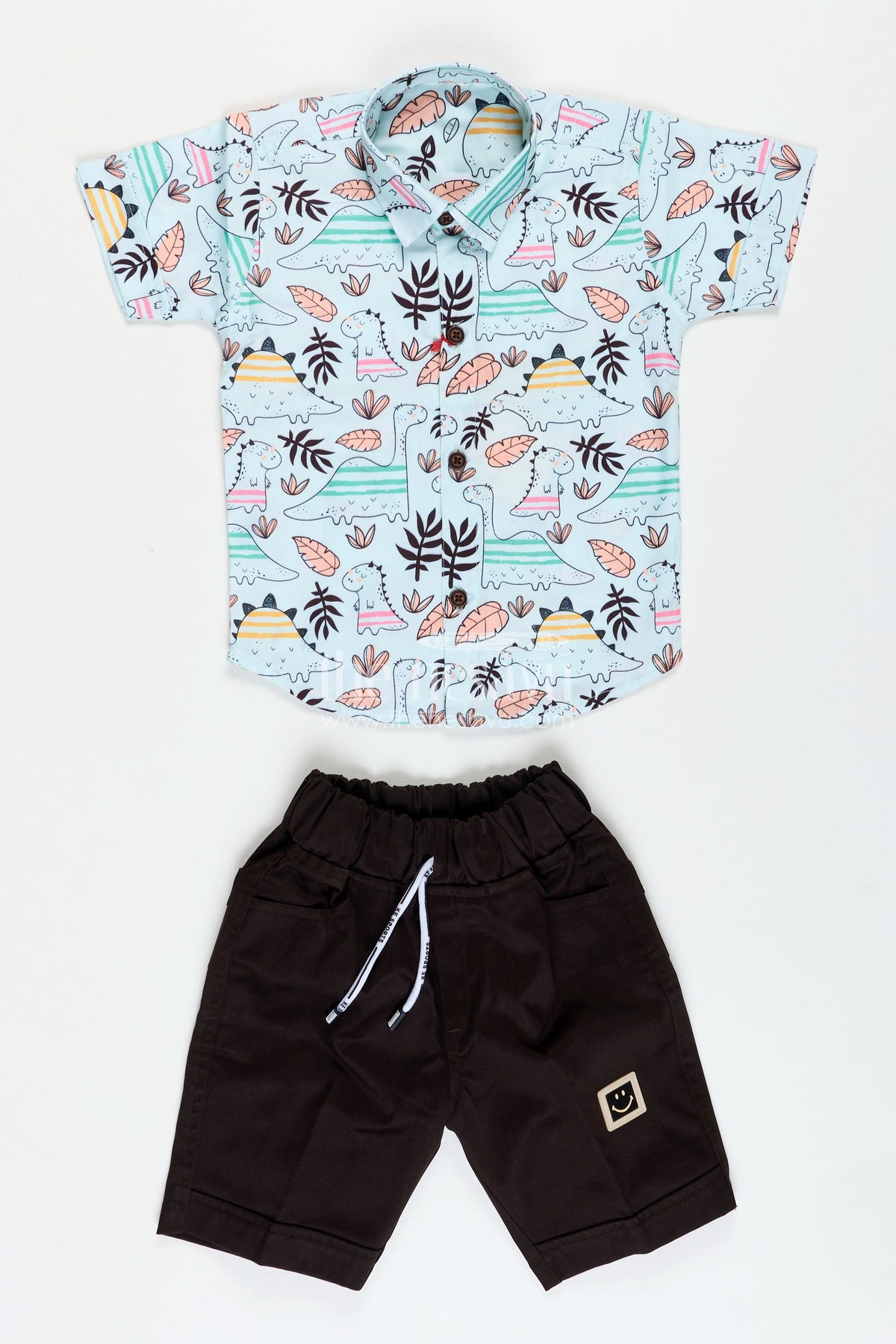 Mint green jungle print shirt and shorts for toddler boys adds a dash of prehistoric fun to your child’s casual wardrobe. The cotton shirt features adorable dinosaur illustrations surrounded by jungle leaves and playful color tones. This set comes with deep black shorts featuring a cute smiley patch and soft elastic waistband for a secure, flexible fit. Lightweight and breathable, this outfit is perfect for both indoor and outdoor play, offering a fun look while ensuring comfort. Whether it’s a day at the park or a family visit, your little one will love wearing this cheerful combo.