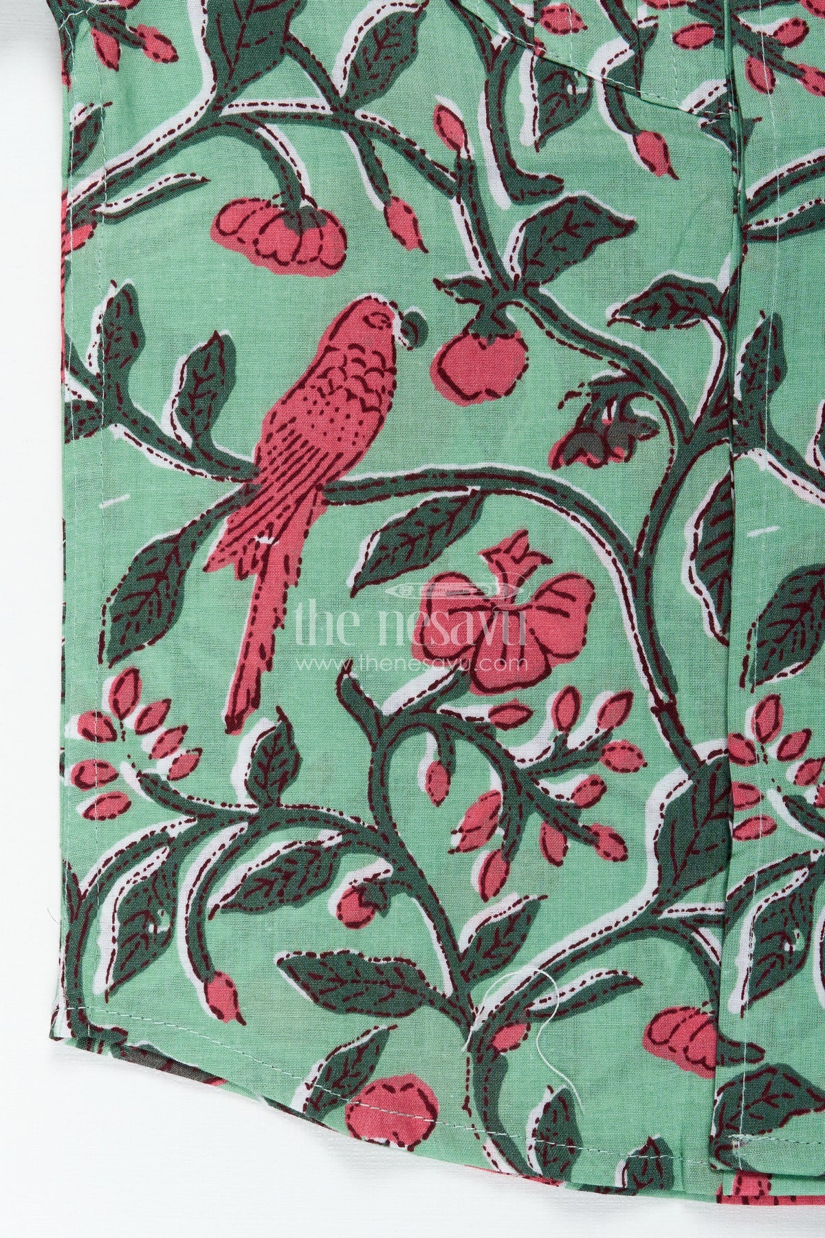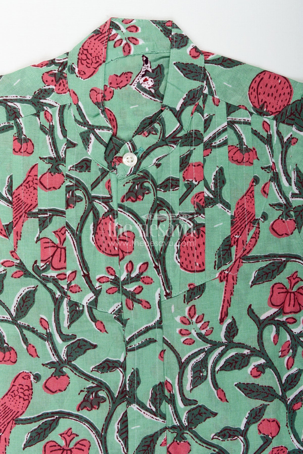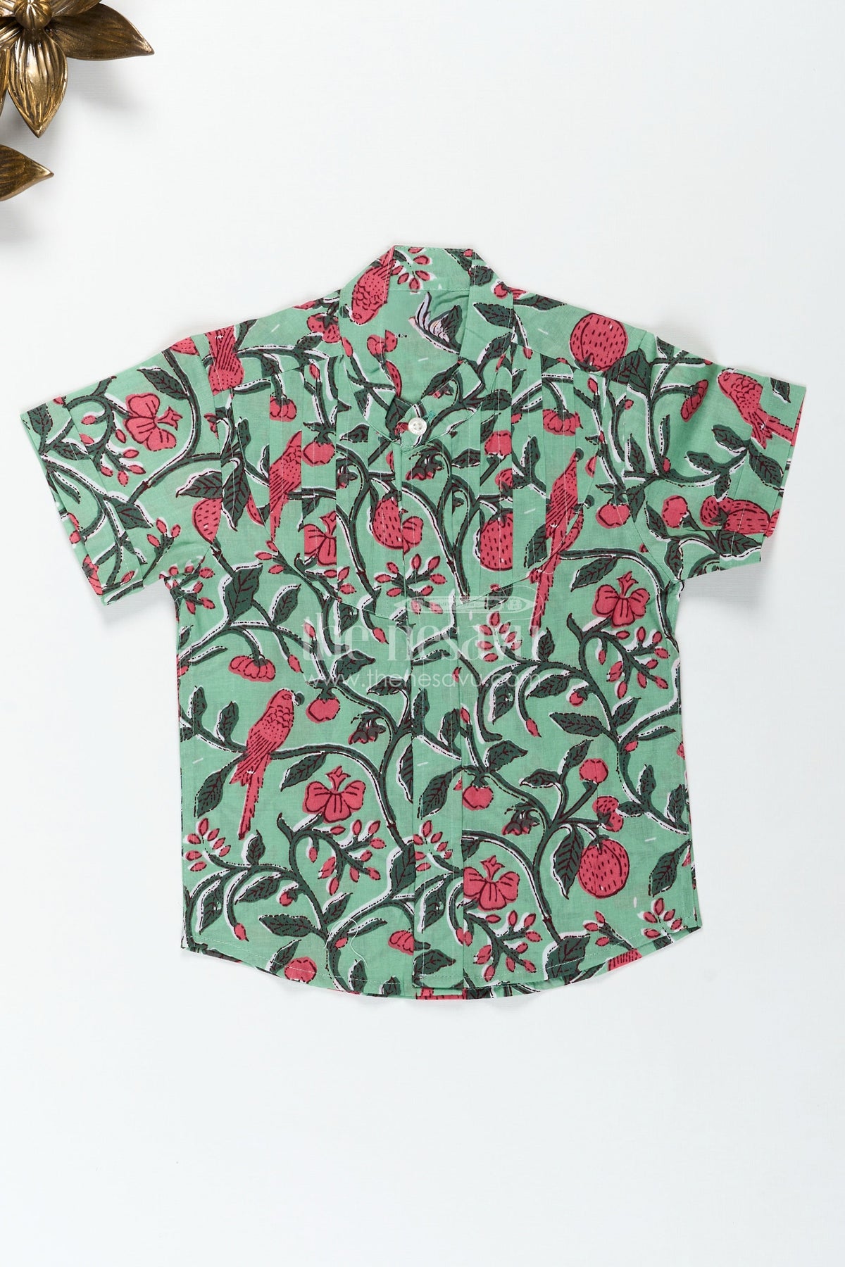 Nature inspired cotton shirt for boys India brings together the freshness of nature and comfort of cotton in a playful, breathable design. Showcasing vivid red parrots, strawberries, and leafy vines against a soothing green backdrop, this shirt offers a vibrant, botanical aesthetic that boys will love. Crafted in soft digital-printed cotton, it ensures all-day breathability and ease of movement. The pleated front and mandarin collar lend a tailored charm, while the short sleeves make it ideal for warm weather. Whether it's for a casual day out or a themed school day, this nature-inspired piece stands out with its lively colors and comfortable fit.