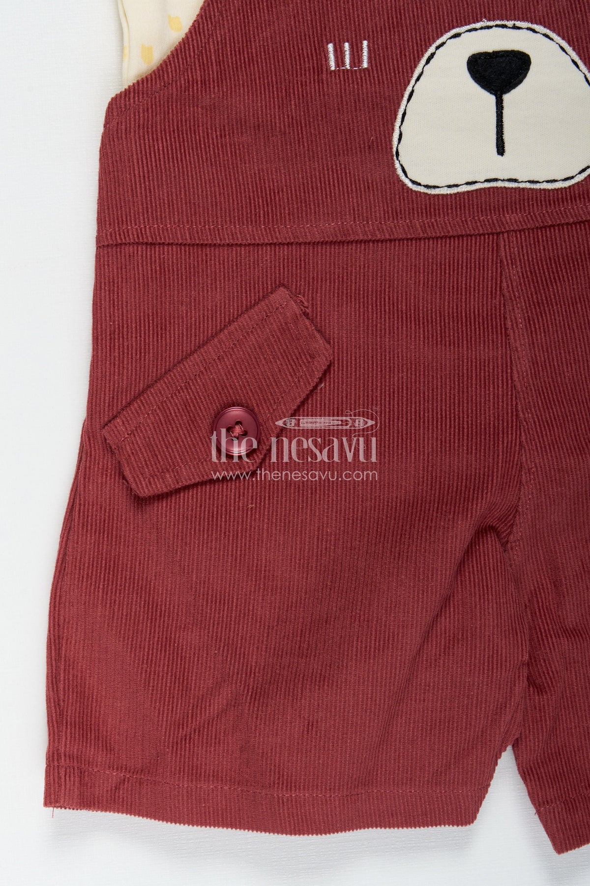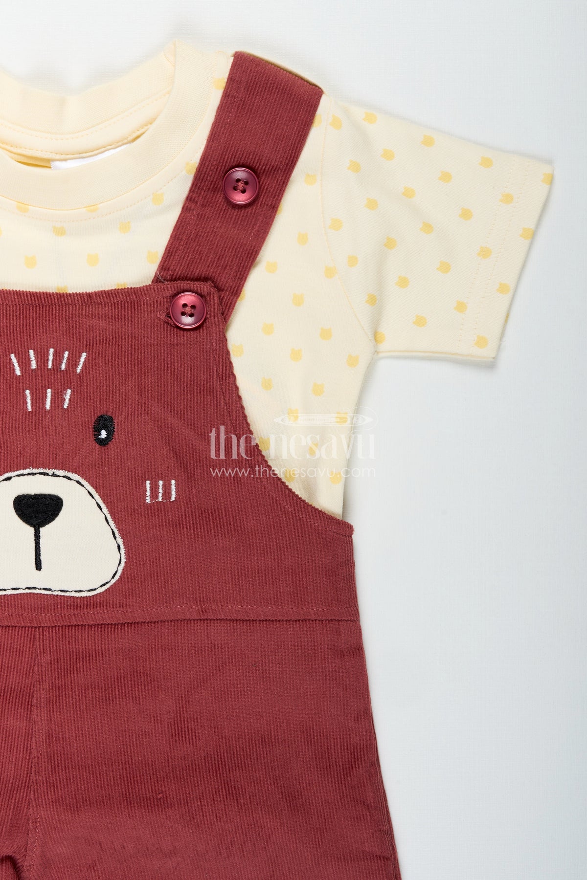Add charm and cheer to your child's wardrobe with this playful toddler dress from Nesavu. This set features a pale yellow polka-dotted cotton jersey T-shirt and rust-toned corduroy dungarees embroidered with an endearing bear face. The overall design offers practicality with a buttoned pocket detail and adjustable shoulder straps for the perfect fit. Crafted from soft, breathable fabrics, it keeps your toddler comfortable during play or rest. The earthy tones, cozy textures, and animal-themed accents make it a delightful pick for casual outings, daycare days, or simply lounging in adorable style.