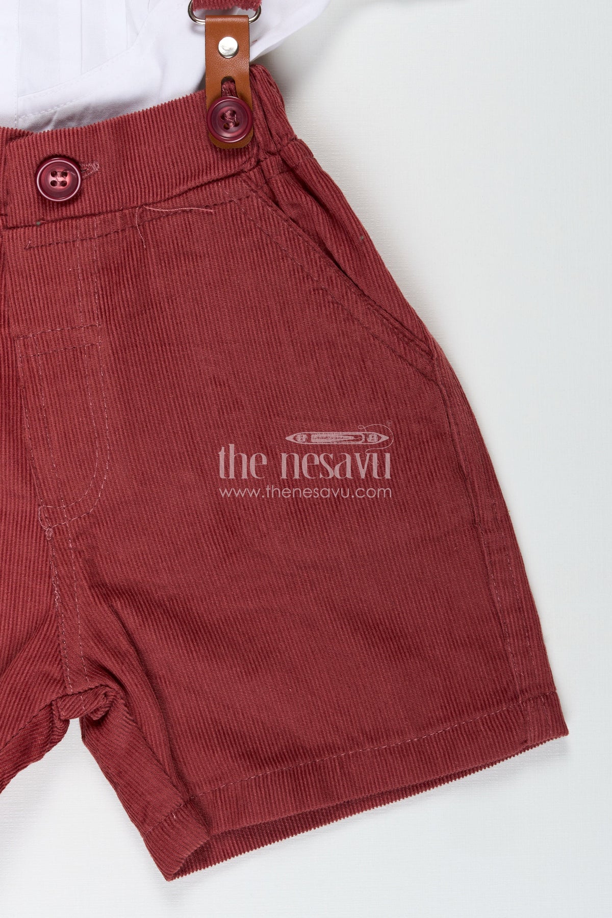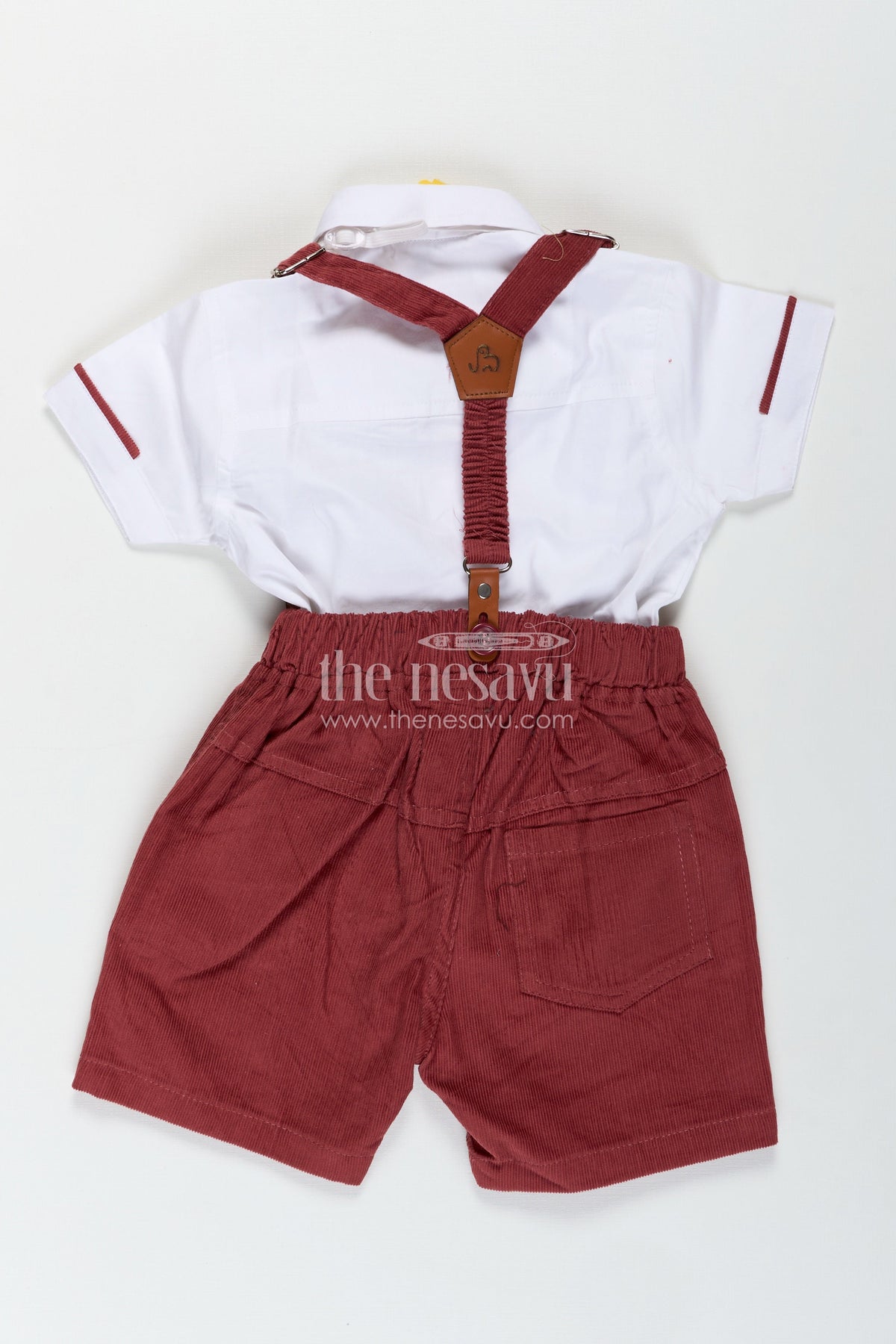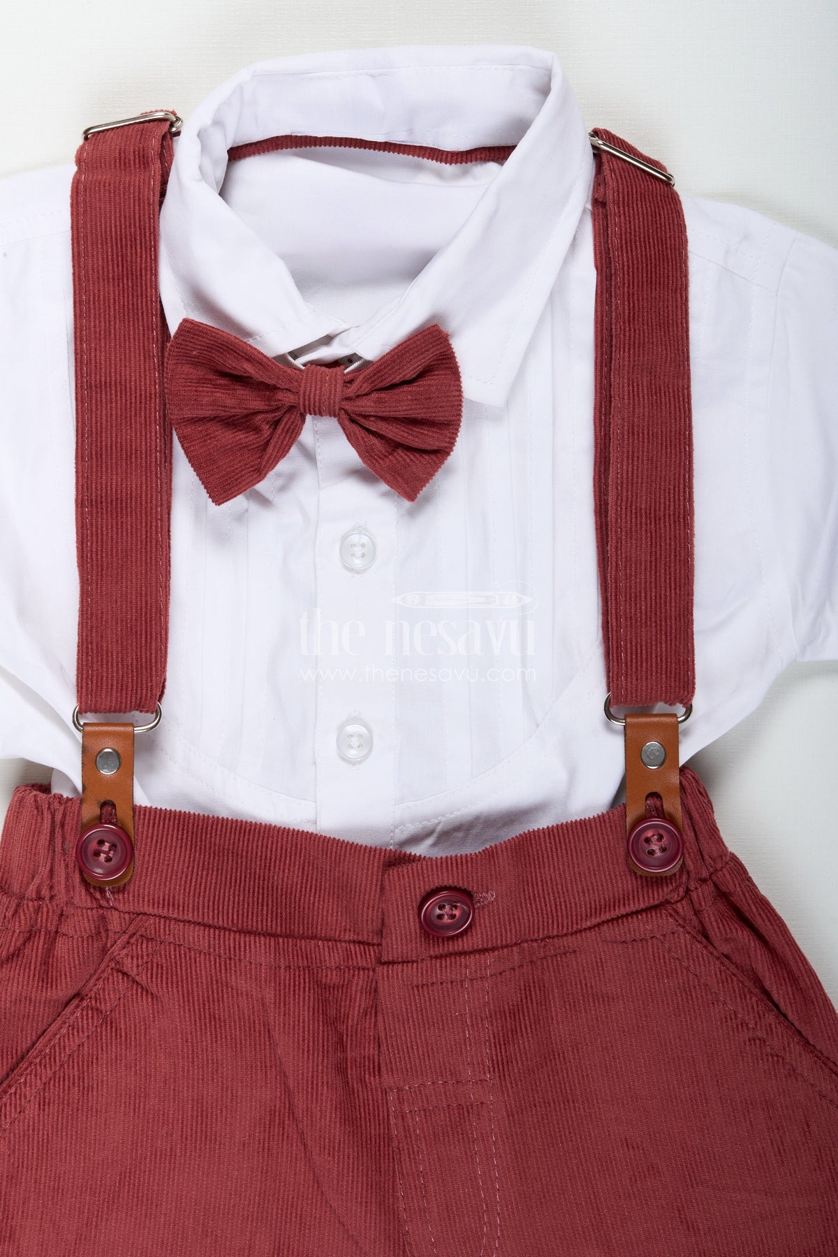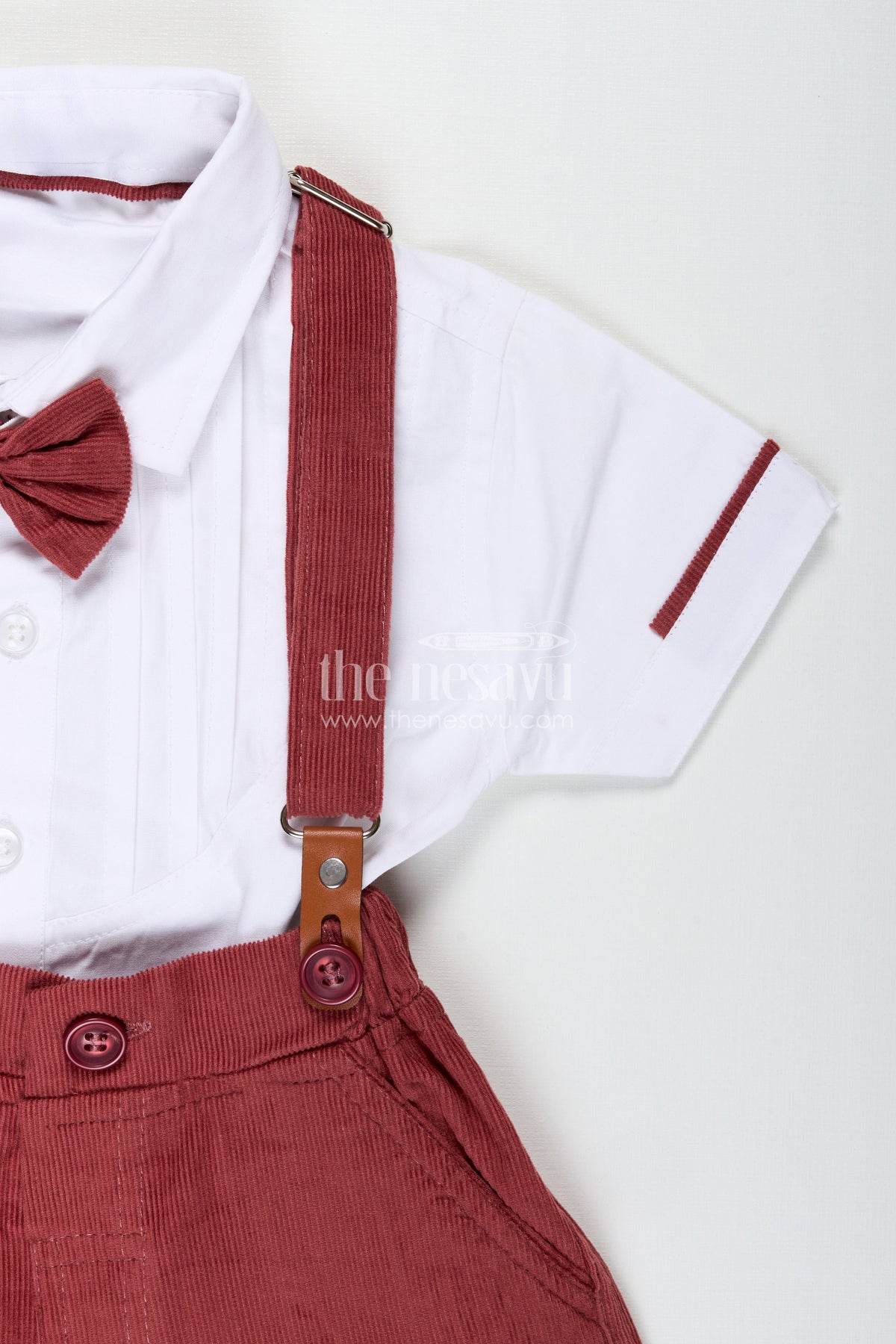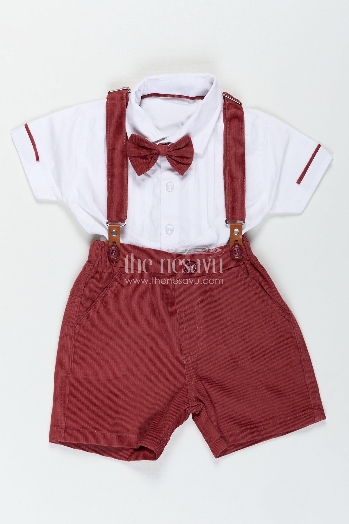 This red shirt and shorts set from Nesavu is the perfect outfit to dress your little boy in classic elegance with a modern twist. The crisp white cotton shirt features a stylish pleated front, structured collar, and rolled-up sleeves with red piping that matches the coordinated bow tie. The deep red corduroy shorts are soft to the touch and come with suspenders for a polished look. Designed to provide both comfort and sophistication, this outfit is ideal for festive occasions, family functions, or photo sessions. The breathable cotton top and textured corduroy bottom ensure durability and comfort for active toddlers. With functional details like button closures and adjustable waistband, this set effortlessly combines style and practicality.