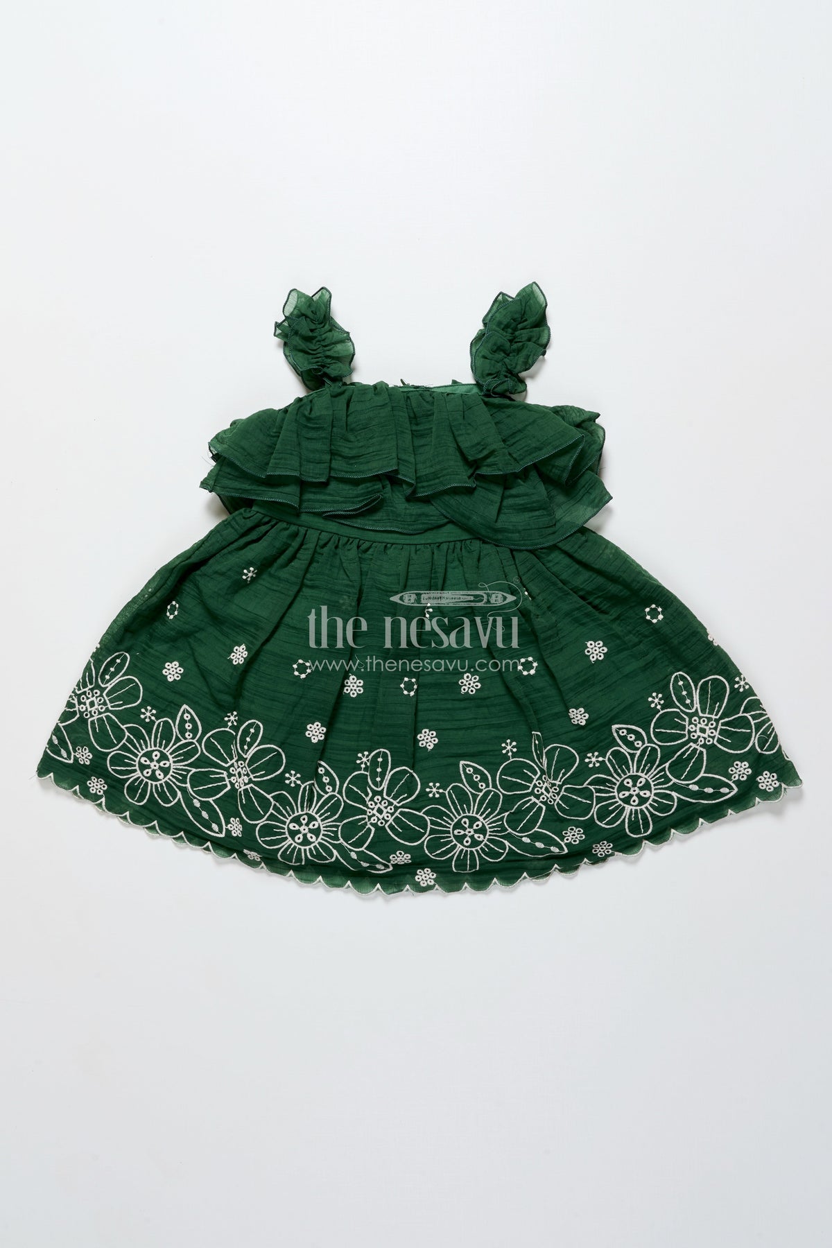 The Nesavu Girls Shorts Temple Visit Baby Frock in Traditional Green with Soft Cotton Fabric and Intricate Floral Lace Accents Nesavu Nesavu traditional green baby cotton frock floral lace temple visits cultural celebrations