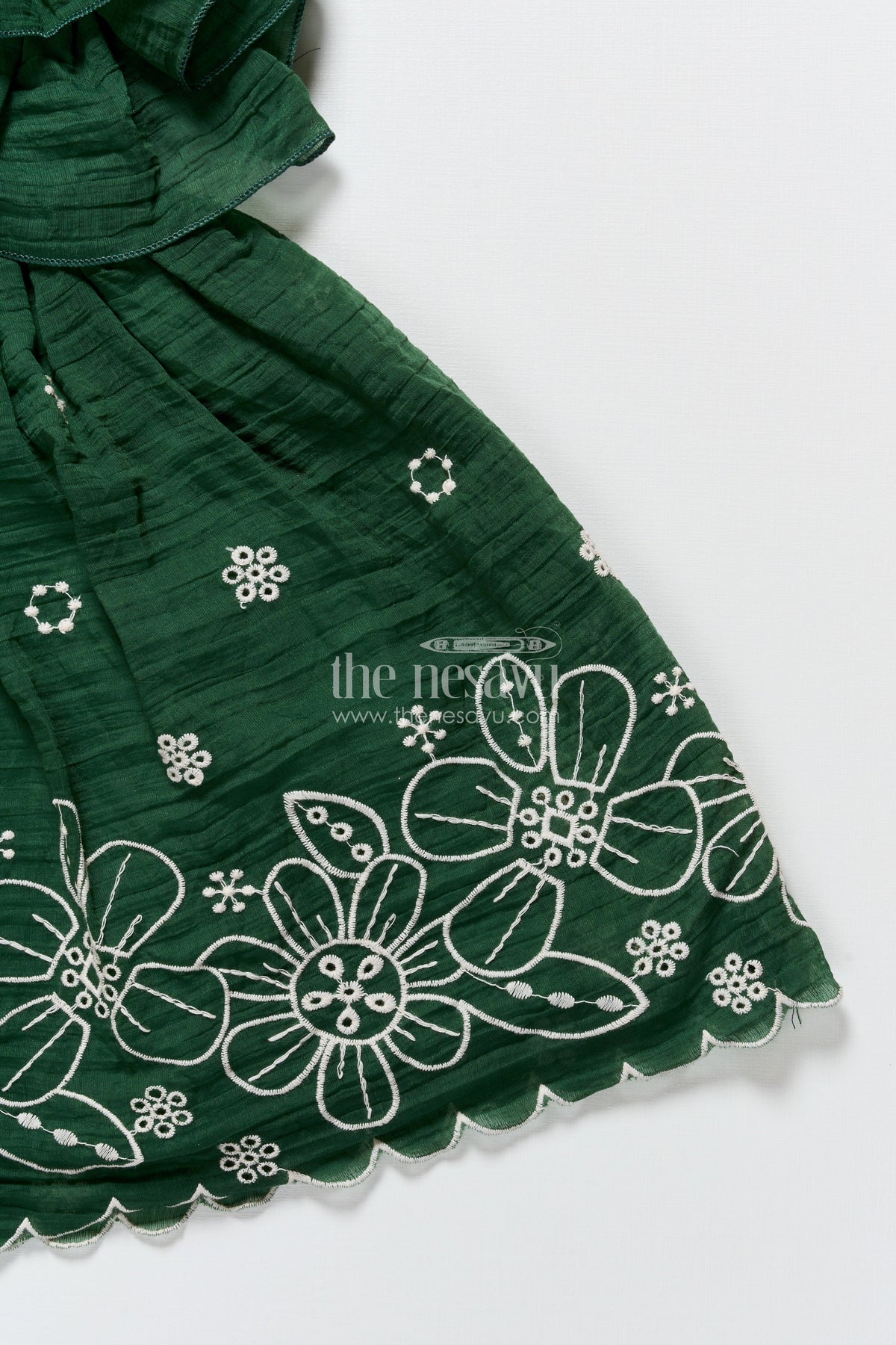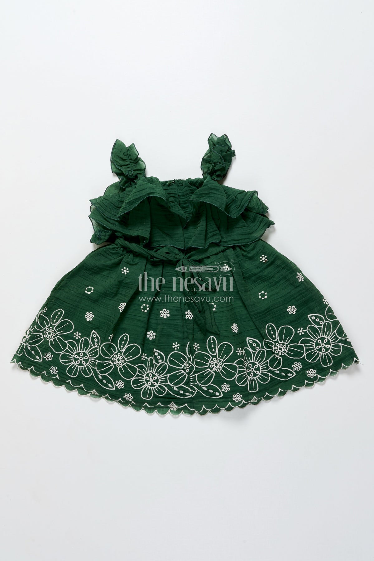 Temple Visit Baby Frock in Traditional Green with Soft Cotton Fabric and Intricate Floral Lace Accents
