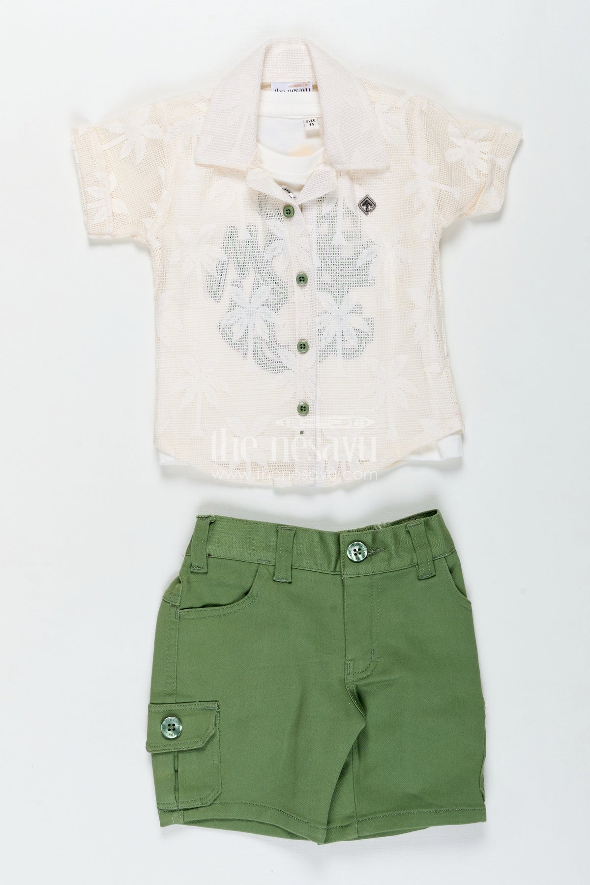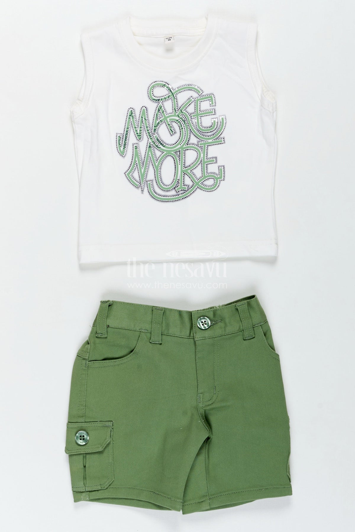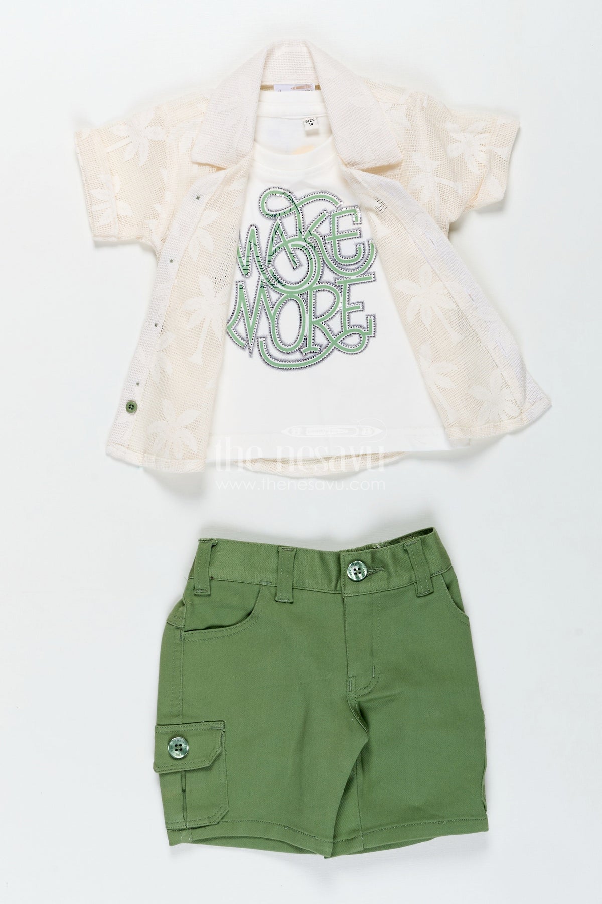 Nesavu’s boys outfits set combines comfort and cool for boys who love playful fashion. This three-piece ensemble includes a stylish off-white embroidered cotton shirt, a white t-shirt with bold "Make More" lettering in green, and soft green shorts with side cargo pockets. The relaxed silhouette and breathable cotton fabric make this outfit perfect for warm days, while the layered look keeps it fashion-forward. Whether for school, casual playdates, or travel, this set ensures your little guy steps out in both comfort and confidence.