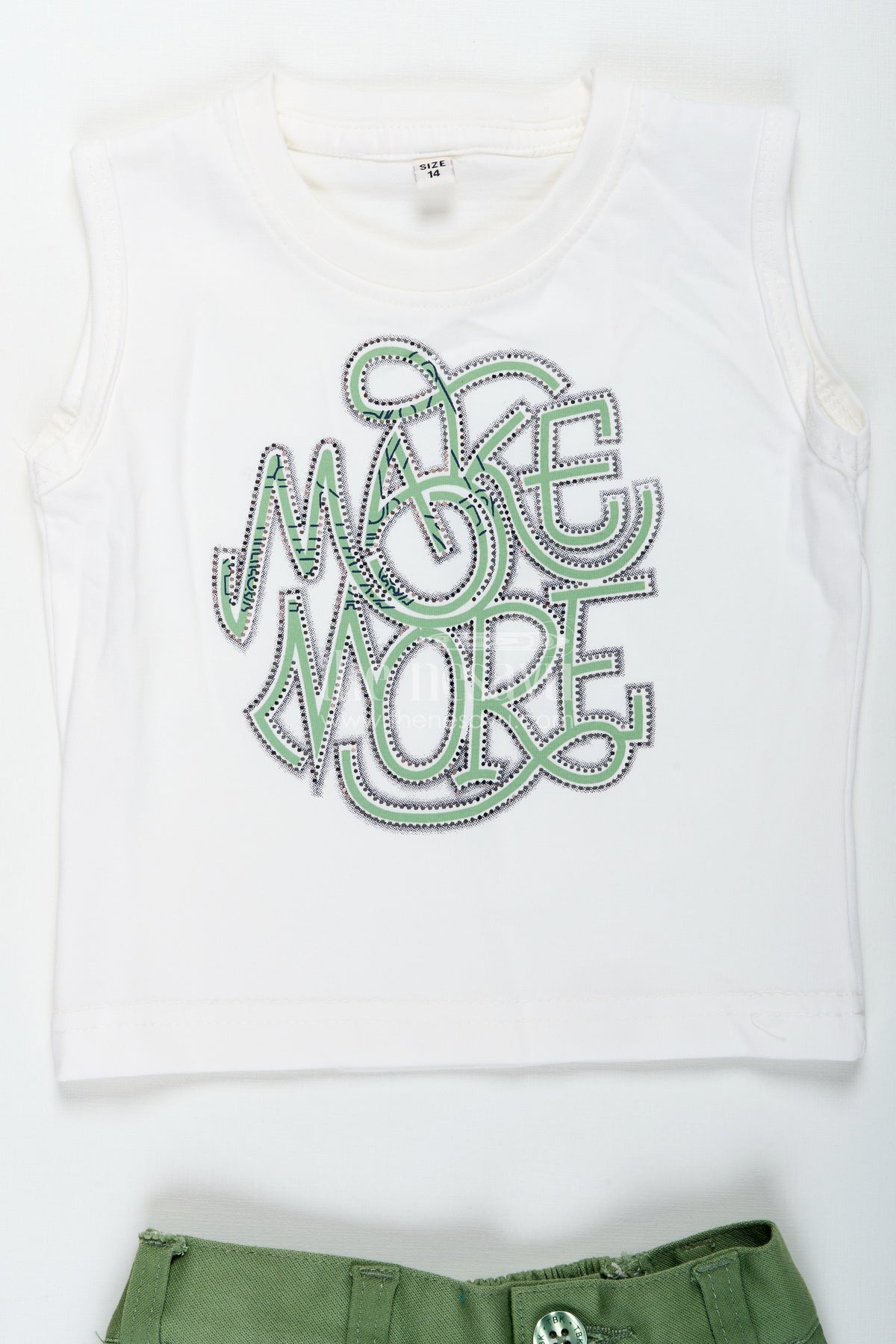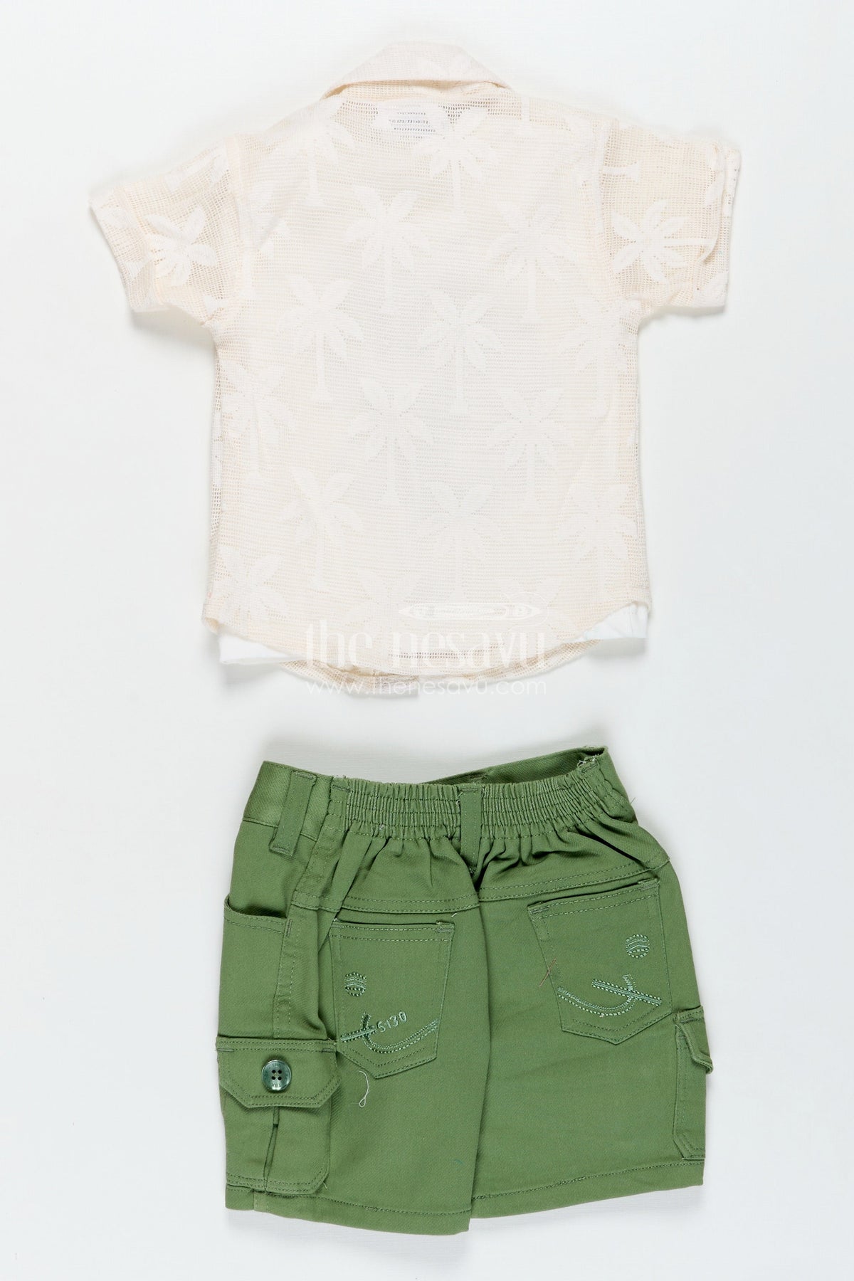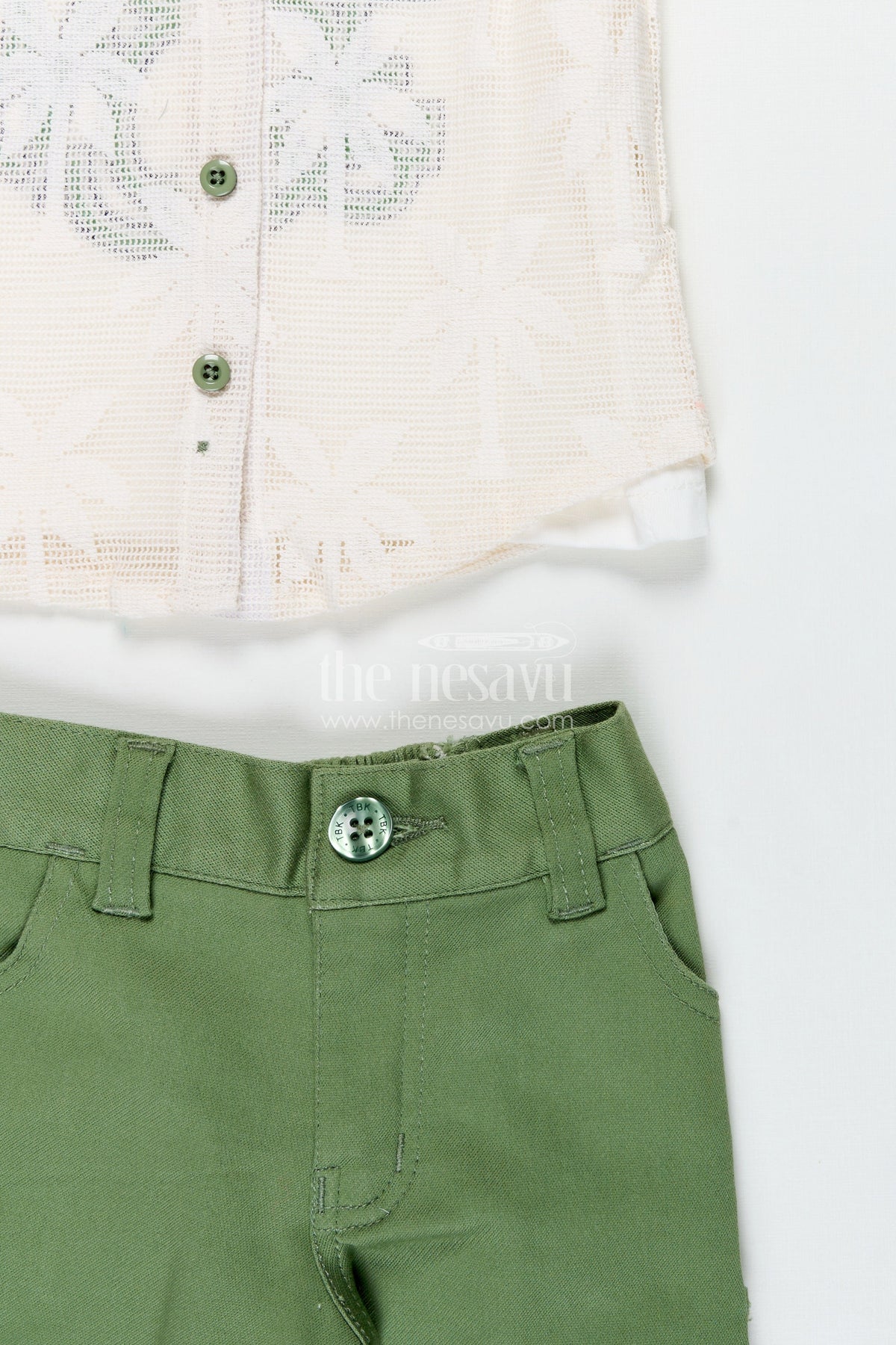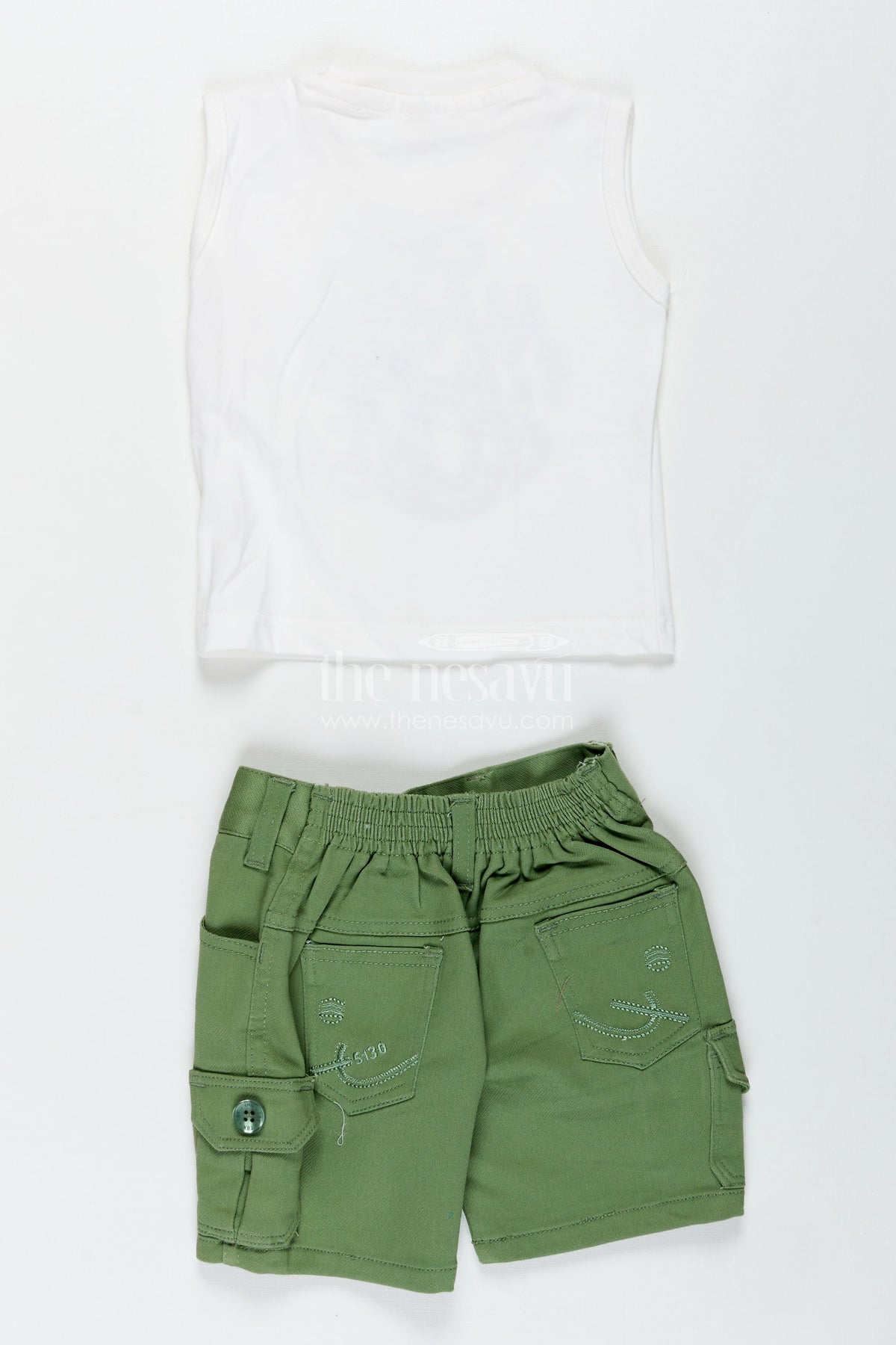 Nesavu’s boys outfits set combines comfort and cool for boys who love playful fashion. This three-piece ensemble includes a stylish off-white embroidered cotton shirt, a white t-shirt with bold "Make More" lettering in green, and soft green shorts with side cargo pockets. The relaxed silhouette and breathable cotton fabric make this outfit perfect for warm days, while the layered look keeps it fashion-forward. Whether for school, casual playdates, or travel, this set ensures your little guy steps out in both comfort and confidence.