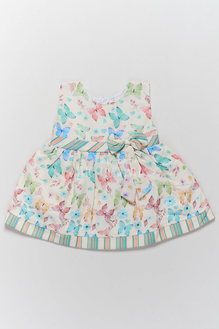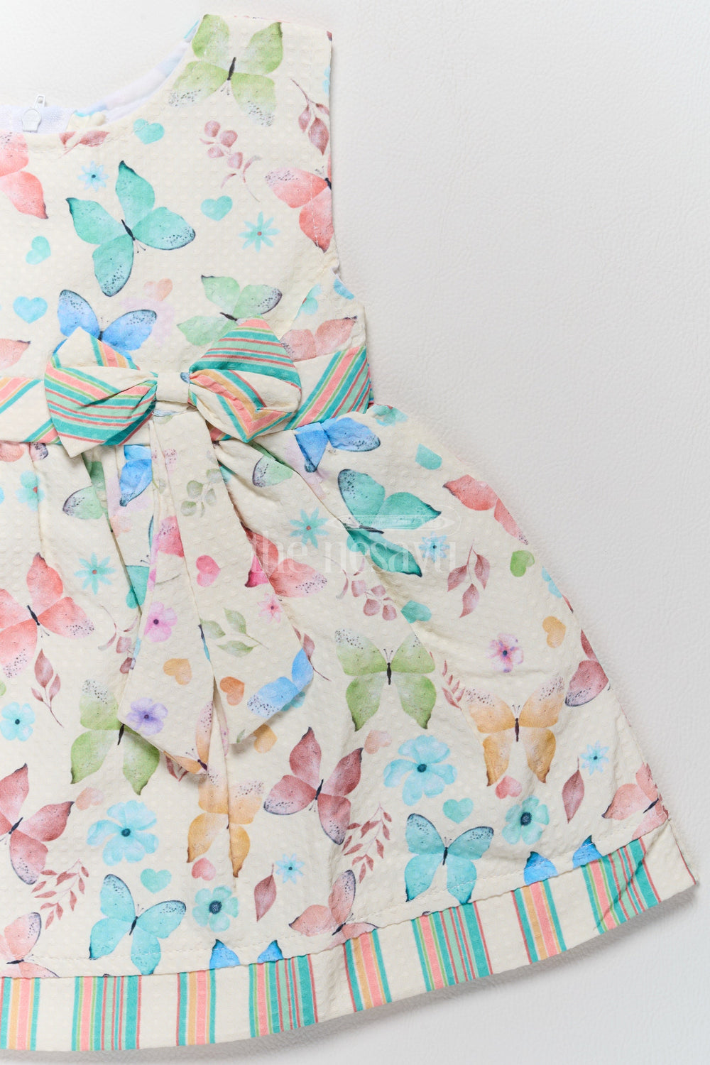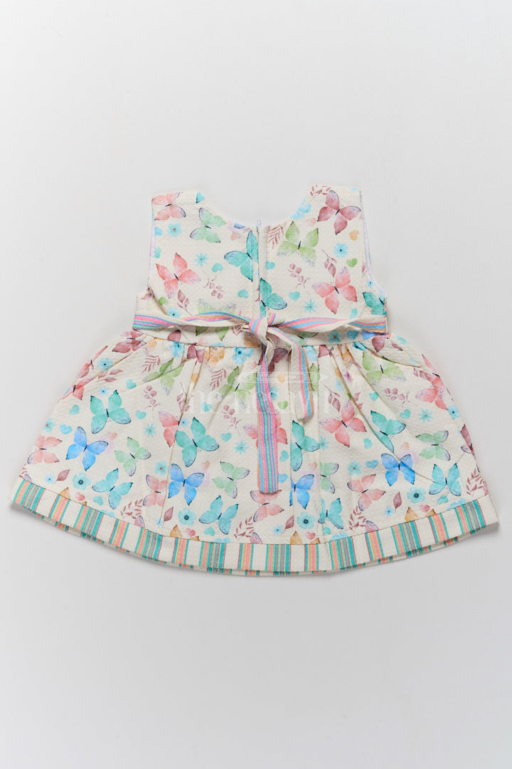 Baby Polysilk Cotton Frock Dress with Butterfly Prints and Striped Bow Accent