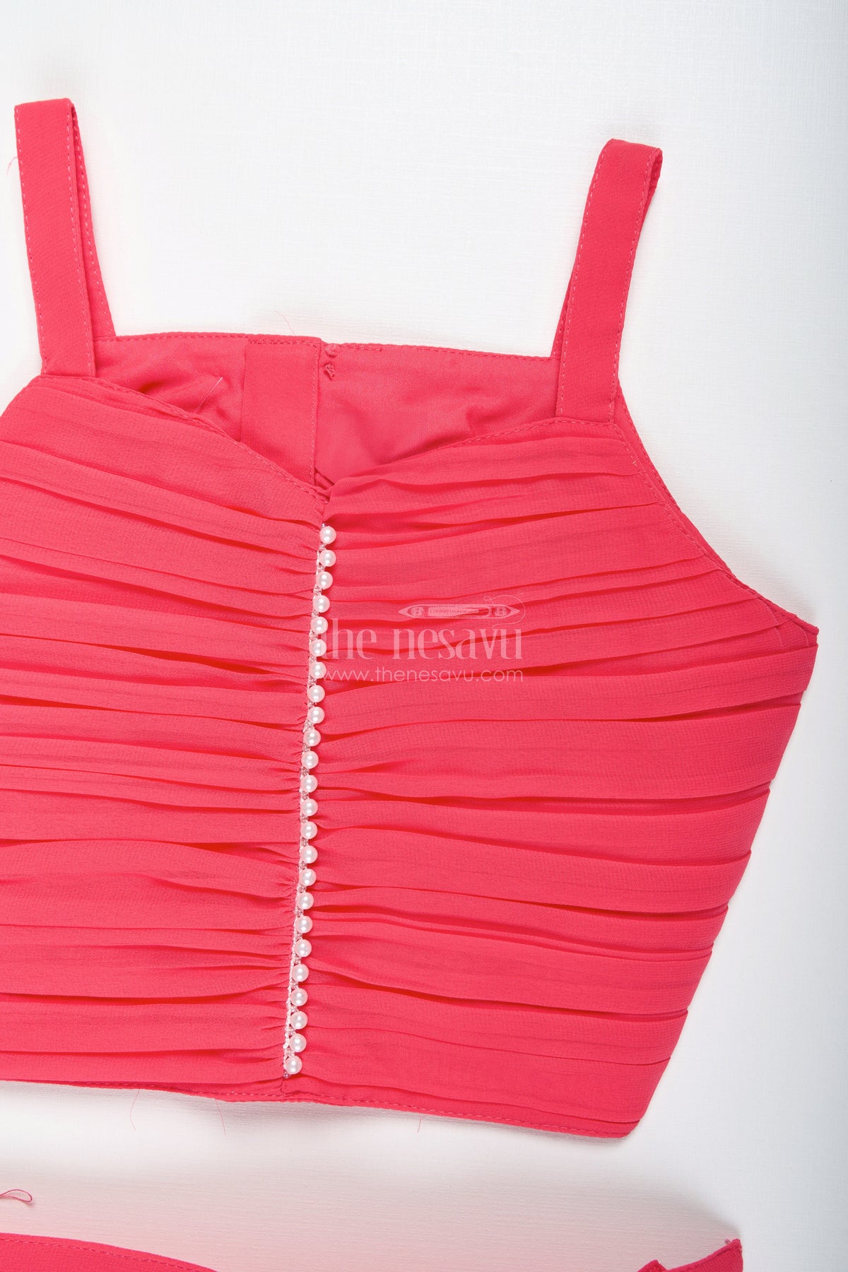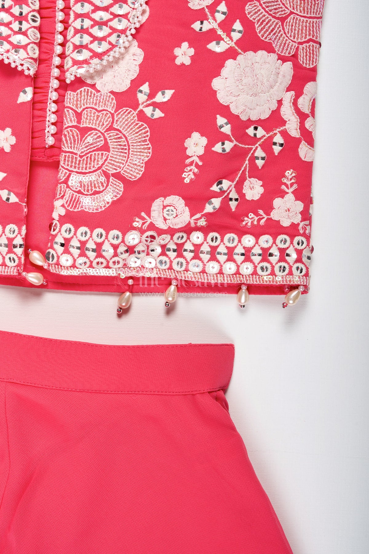 • This bright pink sharara set includes a stylish embroidered jacket, pleated crop top, and matching palazzo pants