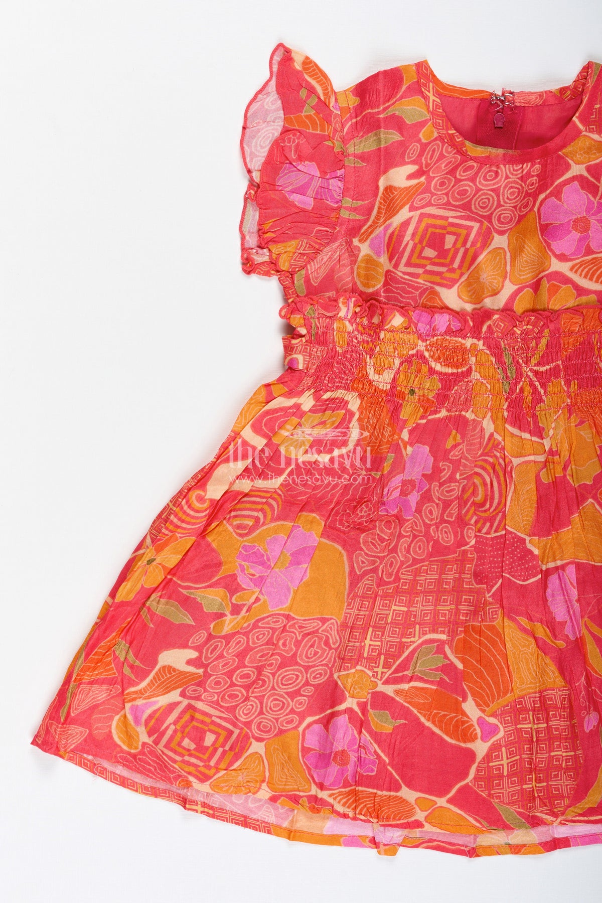 Baby girl occasion wear dress with bright colors is a showstopper that turns heads wherever your little one goes. This frock dazzles in a bold red and orange palette with playful abstract floral designs and geometric accents. The cotton fabric is soft yet structured, making it ideal for extended wear at family functions or festive days out. Featuring ruffled sleeves, a gathered waistband, and a flared silhouette, the dress offers both dramatic flair and comfortable flexibility. The vibrant patterns add a sense of joy and creativity, ideal for kids who love to shine. Easy to maintain and designed with a zip closure at the back, this frock is a smart choice for special occasions with a fun twist.