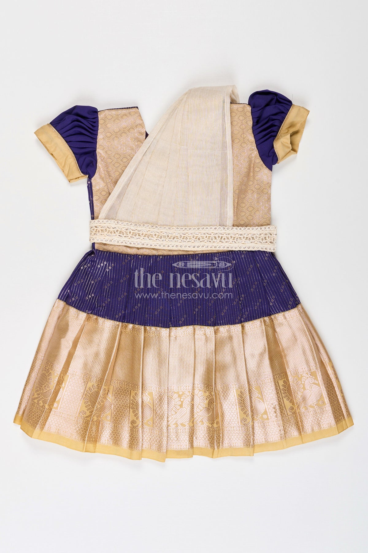 Blue dress silk is a staple for traditional events, and this girl frock brings the timeless appeal of Kanchivaram-style craftsmanship. Made from semi Kanchivaram silk, this outfit features a beautifully pleated skirt in golden weave patterns and a richly textured blue bodice. Delicate thread embroidery on the bodice and contrast golden sleeves elevate the overall look. An attached lace-embellished dupatta drapes elegantly across the shoulder, adding cultural flair to the ensemble. Perfect for festivals, temple visits, or family celebrations, this silk frock is designed for comfort and elegance, helping your little one stand out in heritage-inspired fashion.