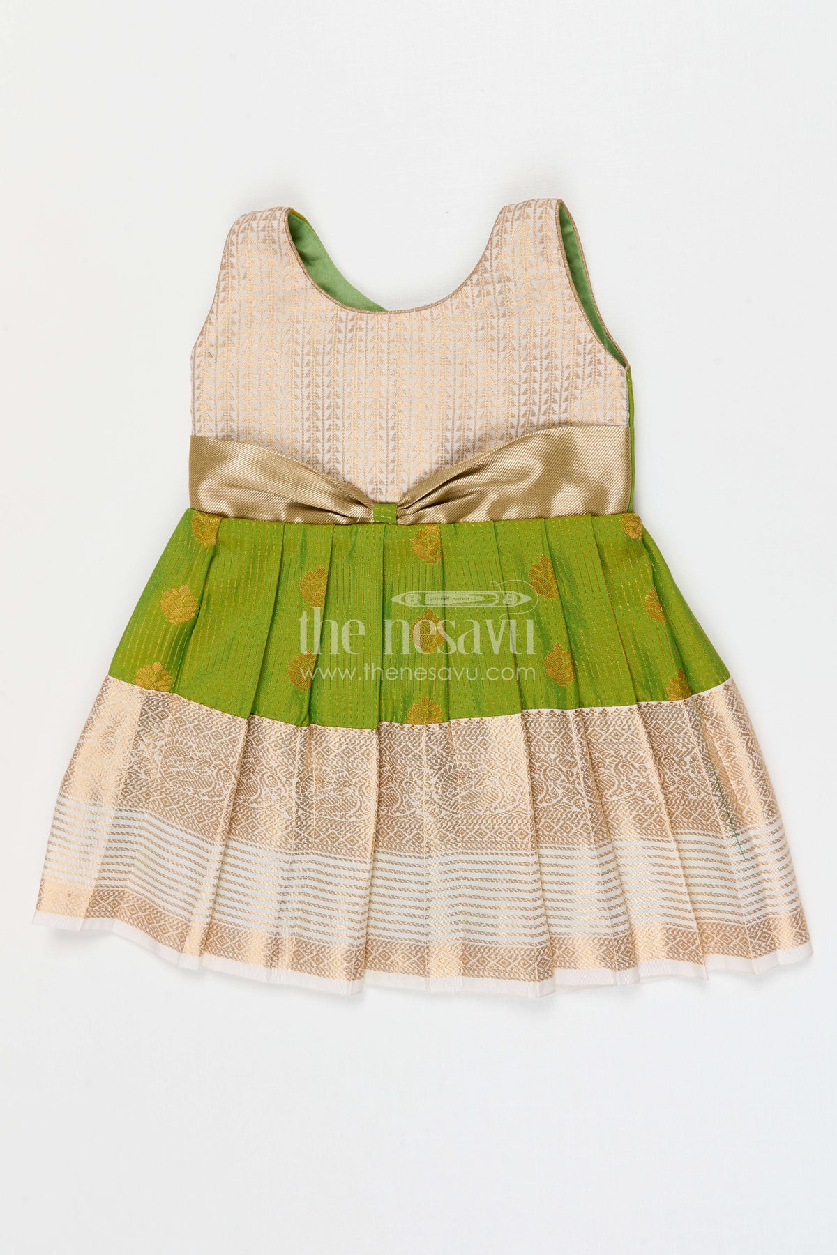 This girls designer silk frock for weddings is inspired by traditional kanchivaram saree styling, perfect for grand celebrations