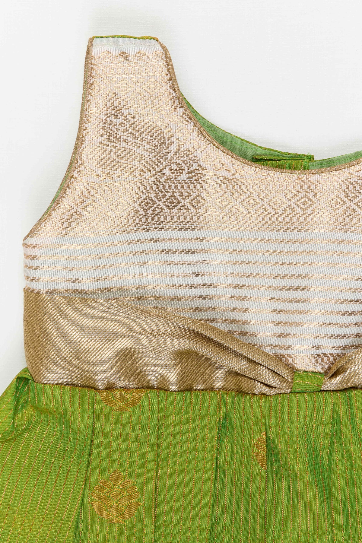The woven bodice features intricate traditional patterns that give it an elegant ethnic finish