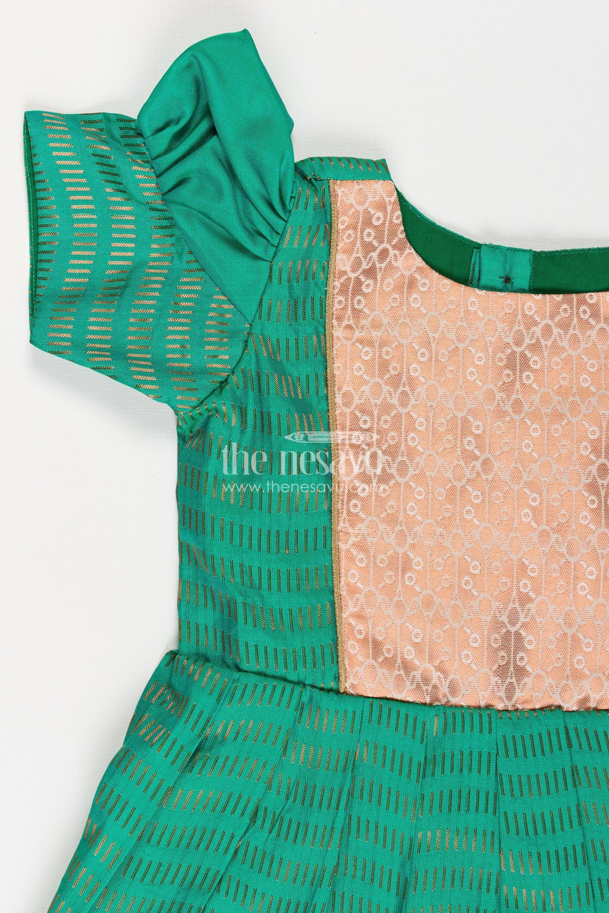 The silk green design of this traditional girls Kanchi silk frock is a charming fusion of vibrant elegance and kid-friendly comfort. Crafted from premium semi Kanchivaram silk, the frock features a rich green bodice paired with a golden zari-woven center panel and hem, lending it a regal South Indian aesthetic. The dress includes classic puff sleeves and a flared skirt that allows for easy movement—perfect for energetic little ones during family events or festive functions. The dual-tone silk gives off a beautiful sheen, while the structured yet breathable fabric ensures your child remains comfortable throughout the day. With its detailed traditional finish and contemporary cut, this frock is a graceful wardrobe essential that balances heritage with modern styling.
