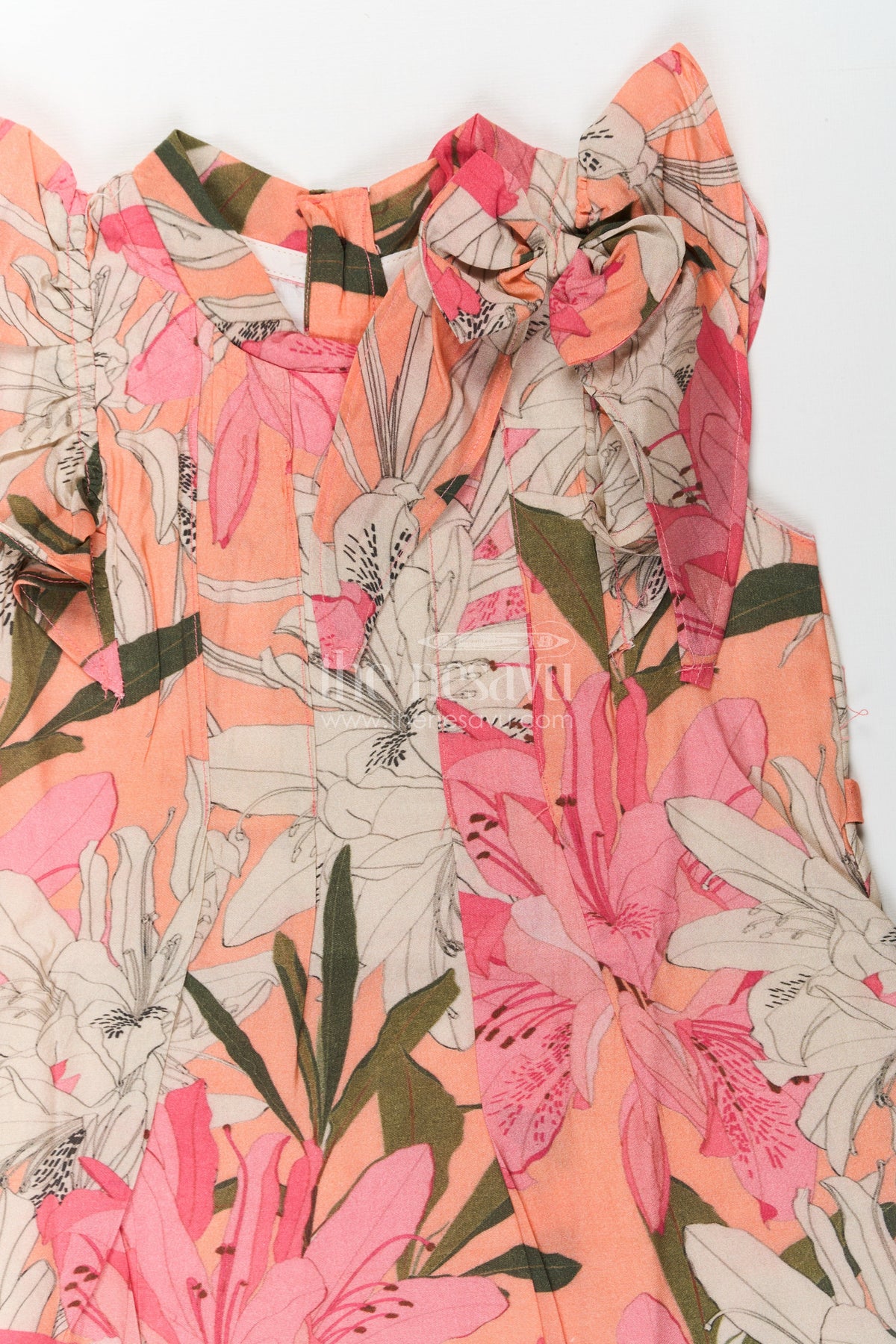 • Design: Floral digital print, bow neckline, pleated skirt