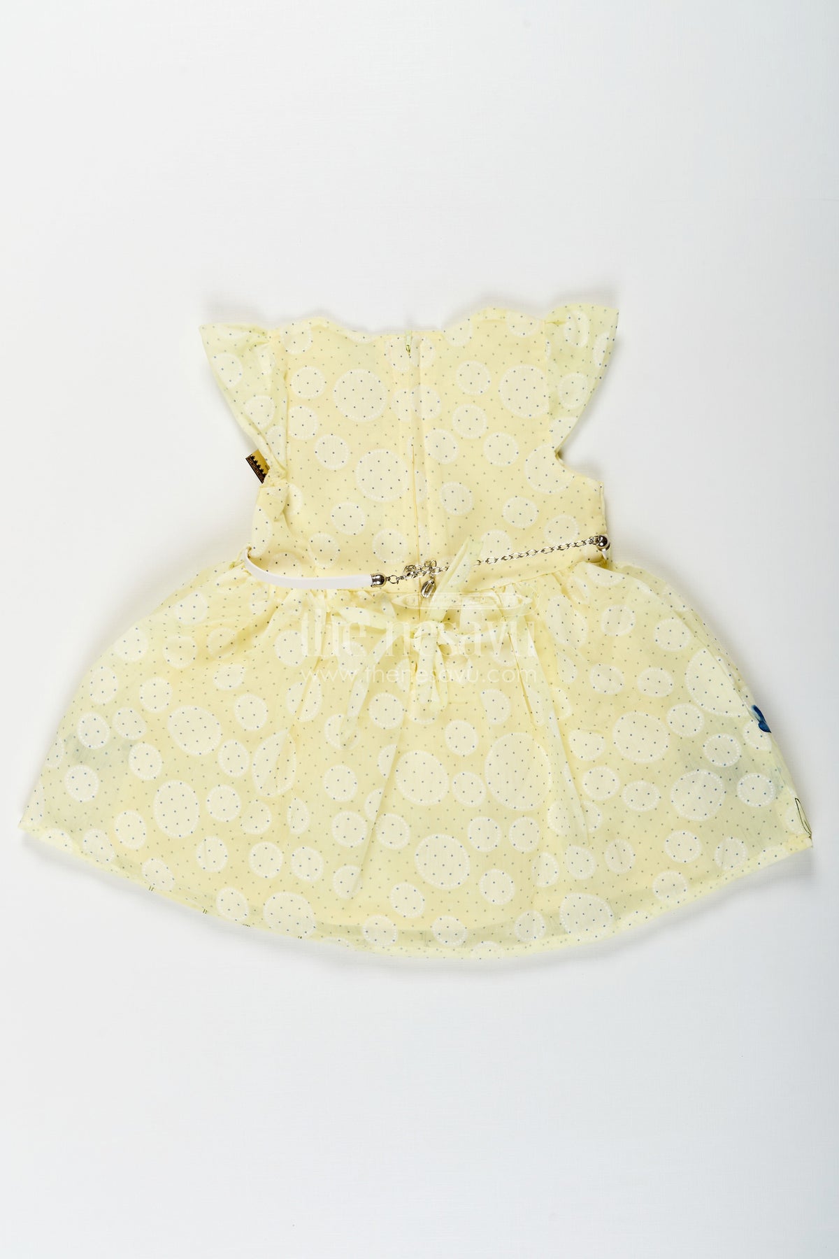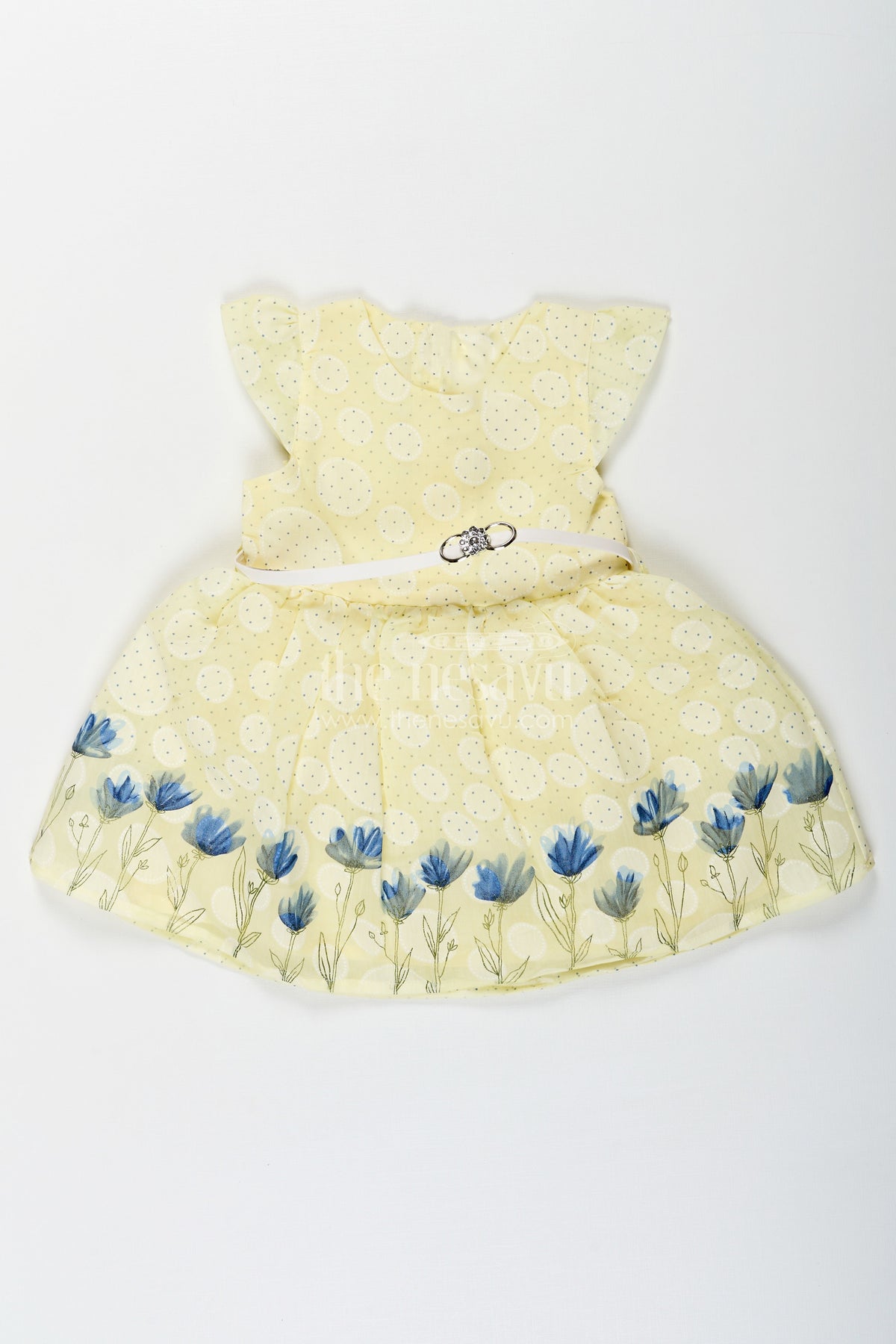 This adorable polka dot frock is a charming blend of cheerful color and playful design, ideal for baby girls who love to dress cute and comfortable. Made from a soft cotton blend with digital print, the frock features a lively yellow base scattered with delicate white polka dots and is finished with a digitally printed blue floral hem that brings a splash of natural beauty. Designed with flutter sleeves and a gently flared silhouette, this baby cotton frock ensures freedom of movement and breathability. The fabric is light and skin-friendly, perfect for sensitive baby skin. Whether it's for a family outing or a day at home, this frock balances everyday ease with a touch of flair. The included silver bangles add a little sparkle, making it a delightful choice for any day.