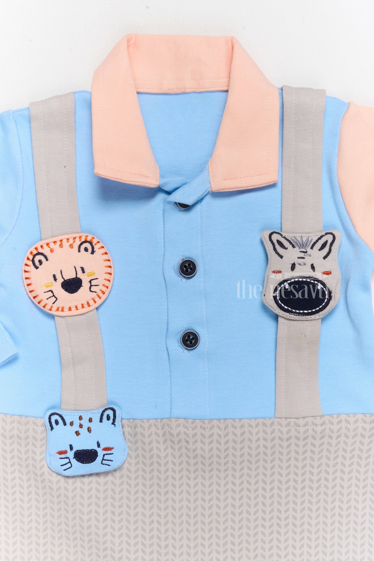 Let your child explore the world in these fun children’s dungarees, designed with whimsical animal prints that add a dash of playfulness. This two-tone outfit combines a pastel blue and peach shirt with gray textured dungarees, accented by adorable animal-shaped patches on the suspenders. Made from breathable cotton, this outfit ensures your child stays comfortable during active days. The snap-button closure makes dressing quick and easy, while the overall design exudes an irresistible charm. Perfect for casual outings or lively playdates, this outfit will keep your child stylish and cozy.