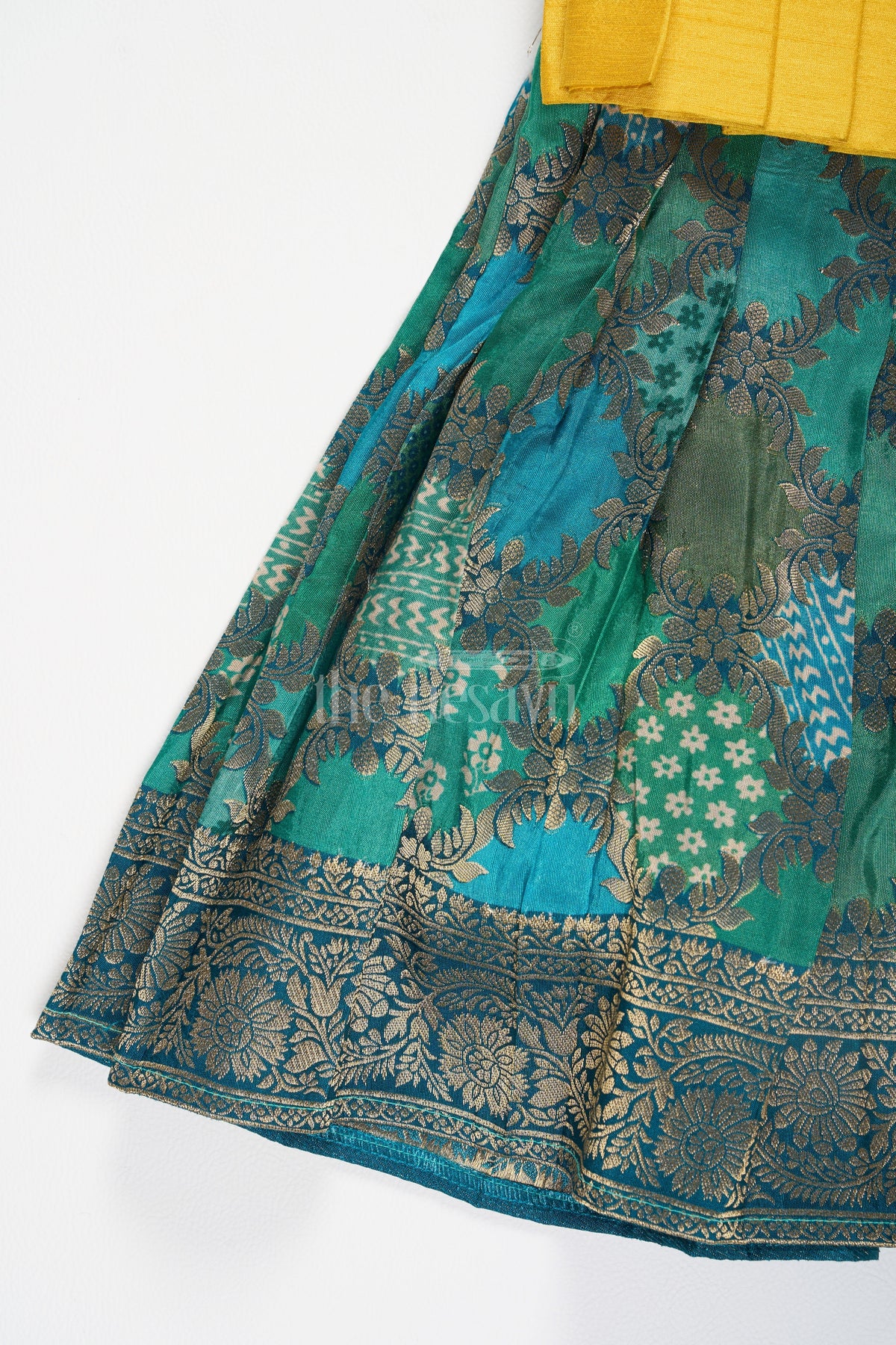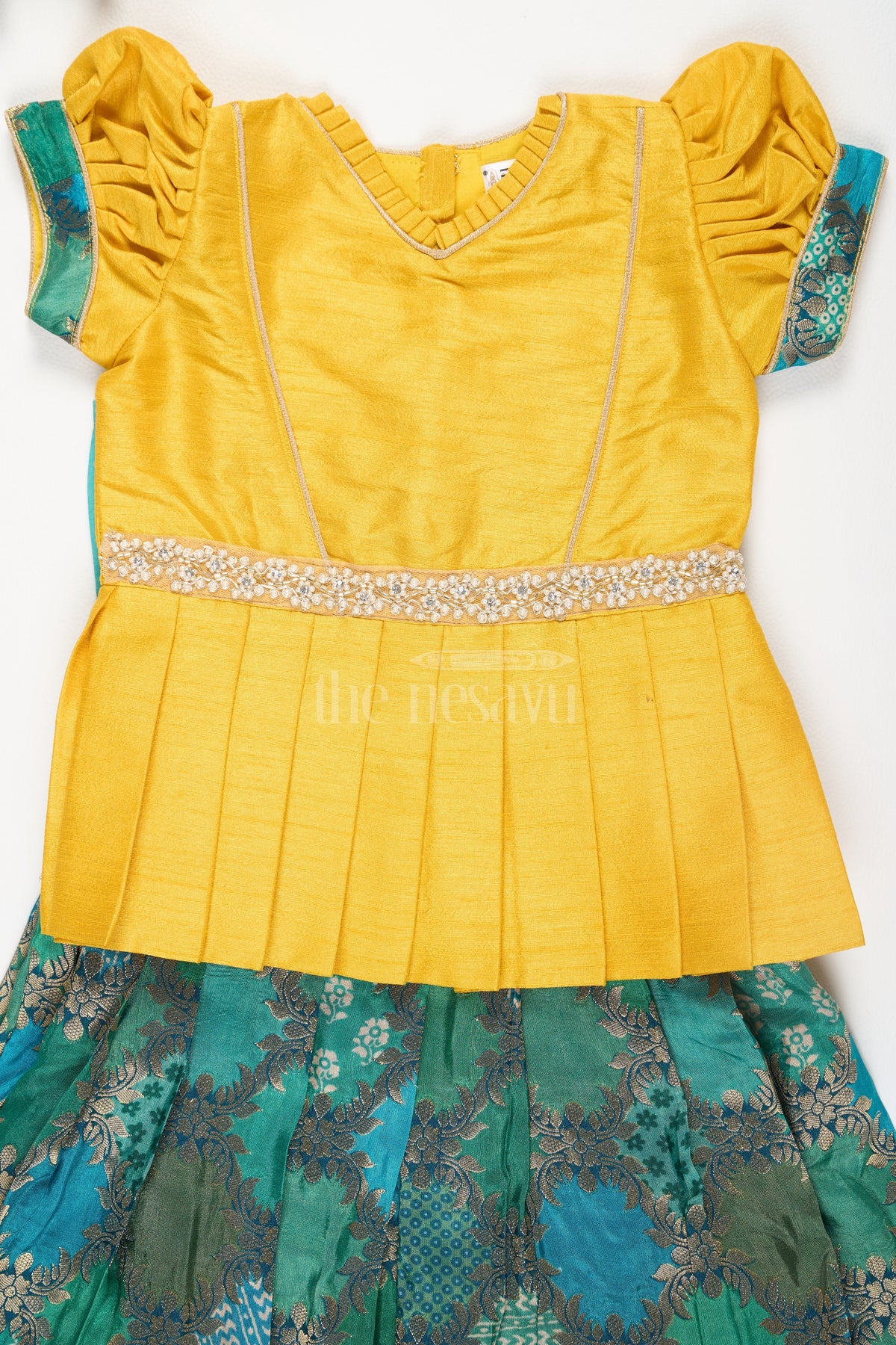 This vibrant pattu pavadai set features a bright yellow blouse with pleated detailing at the waist and puff sleeves for a traditional touch. The blouse is accented with a beaded waistline embellishment, adding a festive sparkle to the design. The green skirt, crafted from rich brocade fabric, showcases intricate floral and geometric patterns in gold, creating a stunning contrast with the blouse. This ensemble perfectly blends traditional Indian design with a playful and modern color palette, making it an ideal choice for festive occasions such as weddings and family gatherings.