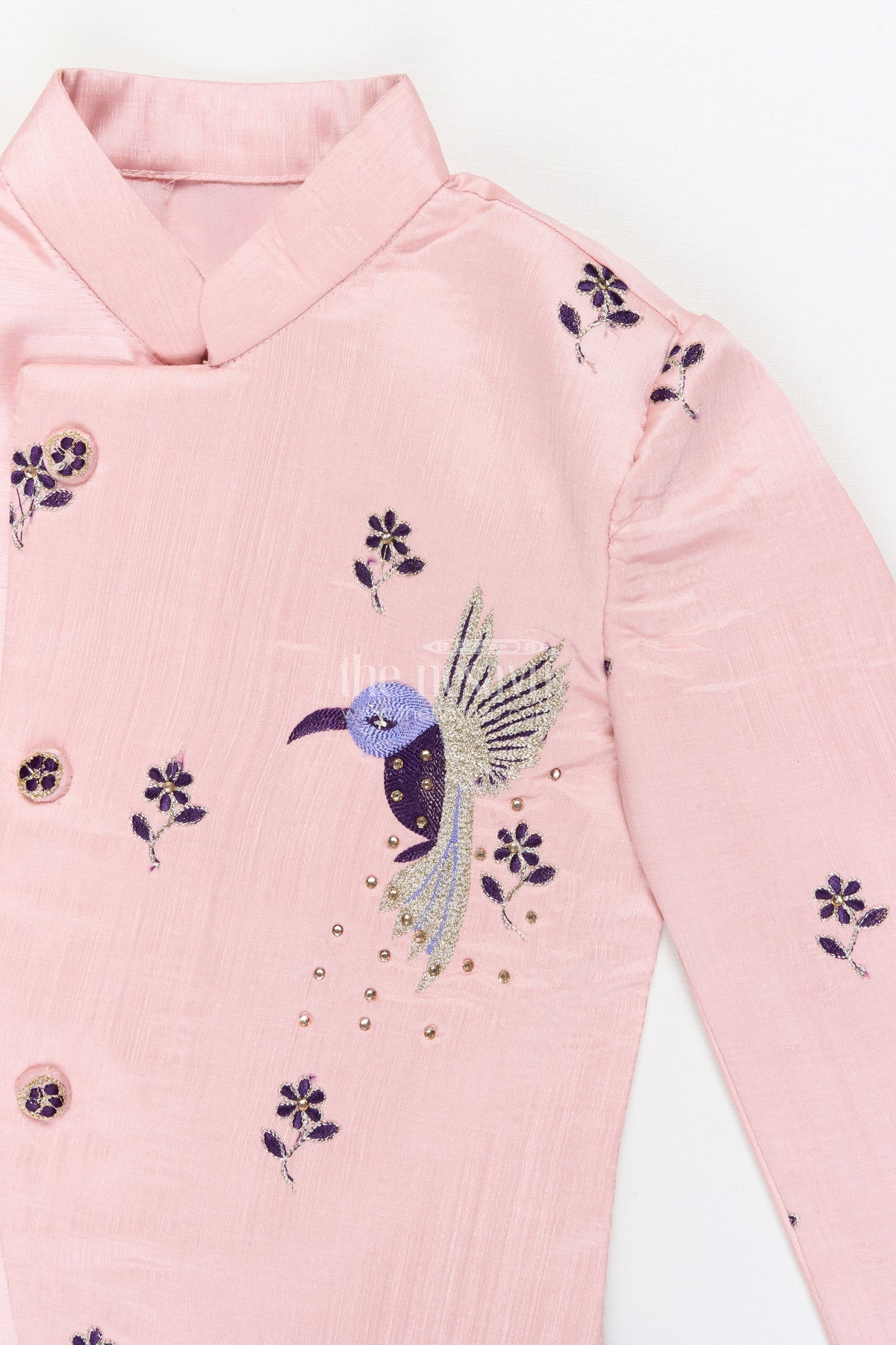 • Features an asymmetrical buttoned kurta with mandarin collar and peacock motif embroidery