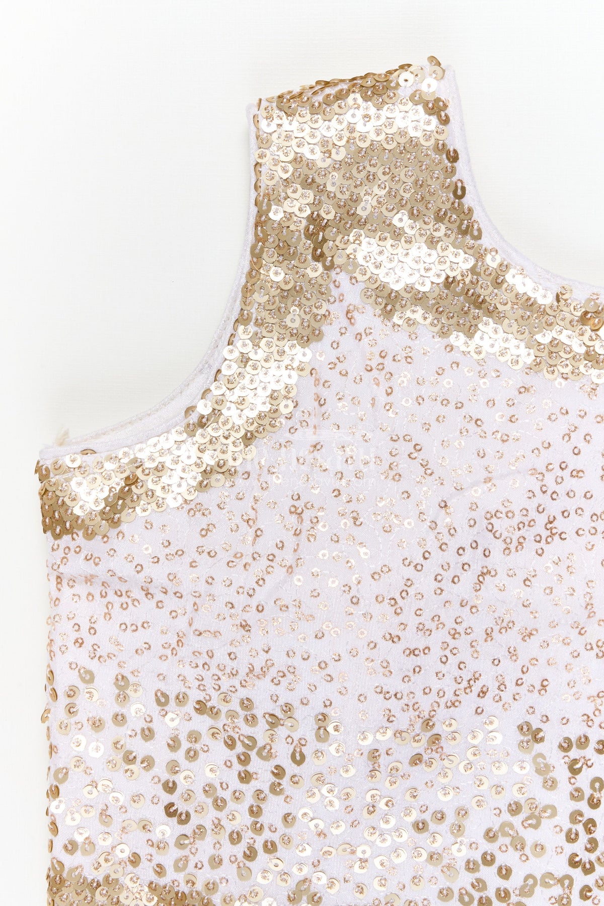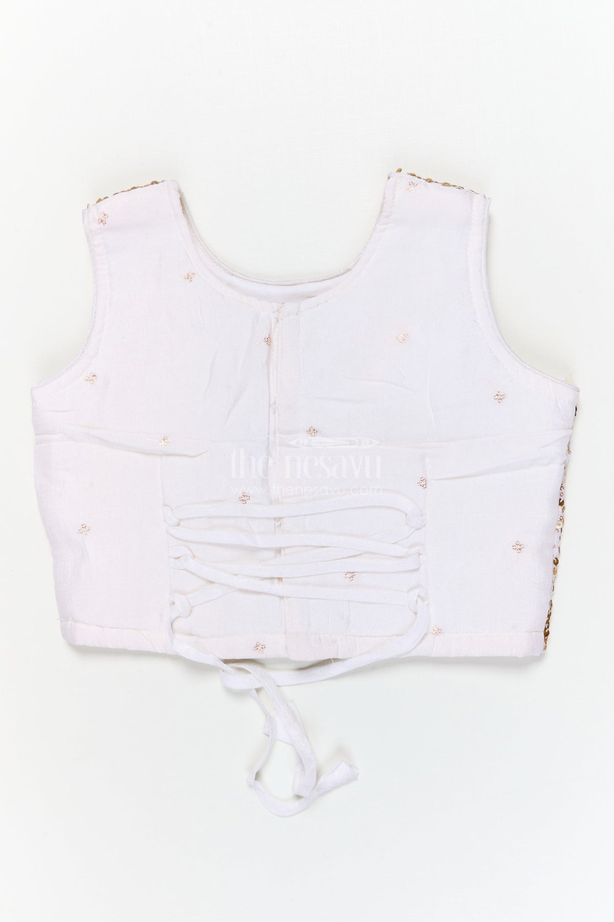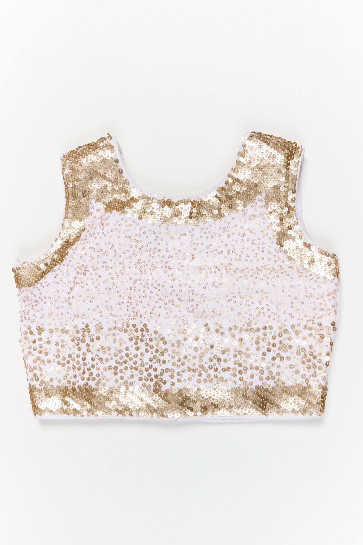 The sleeveless blouse features intricate sequin and threadwork that sparkles in every light