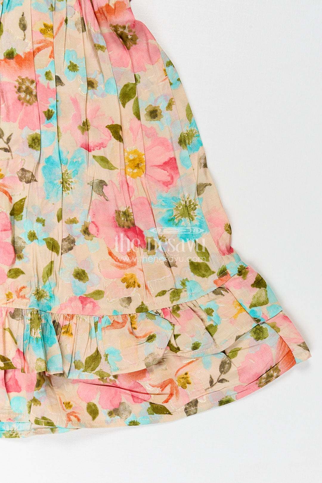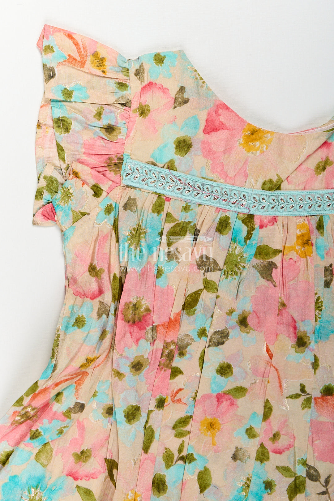 New style frock from Nesavu is a floral fantasy brought to life with soft modal silk and delightful digital prints. This dress features a pastel base adorned with pink, yellow, and blue flowers, offering a vibrant and cheerful look. The flutter sleeves and gently pleated yoke enhance the flowy silhouette, while the ruffle hem adds a playful twist. Lightweight and breathable, it’s ideal for day-to-day wear, playdates, or relaxed family outings—keeping your little one comfy and stylish all day long.