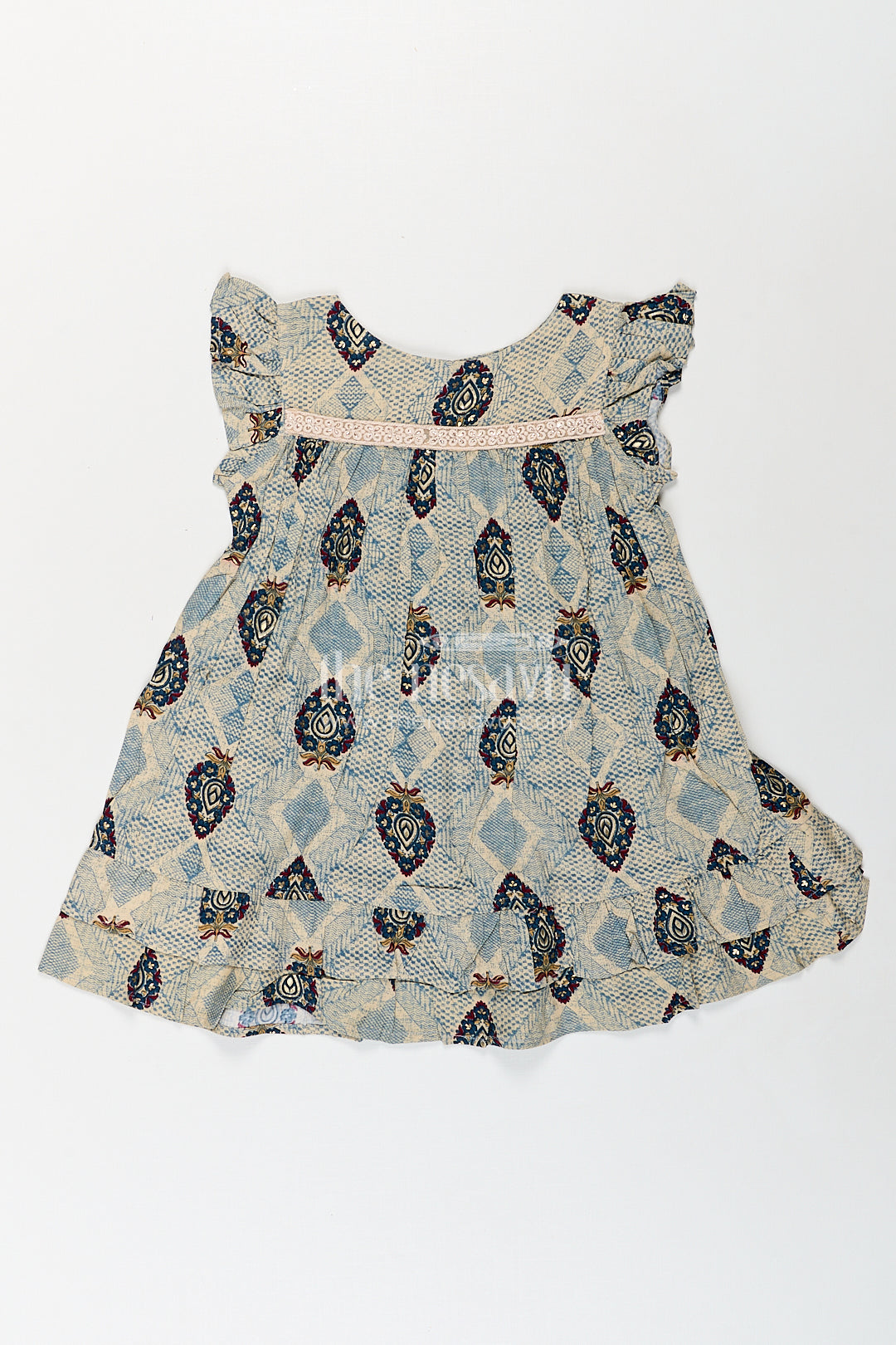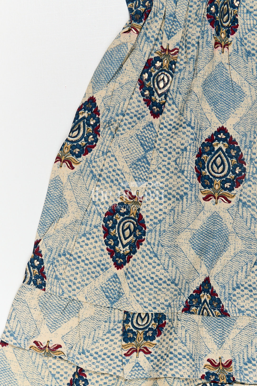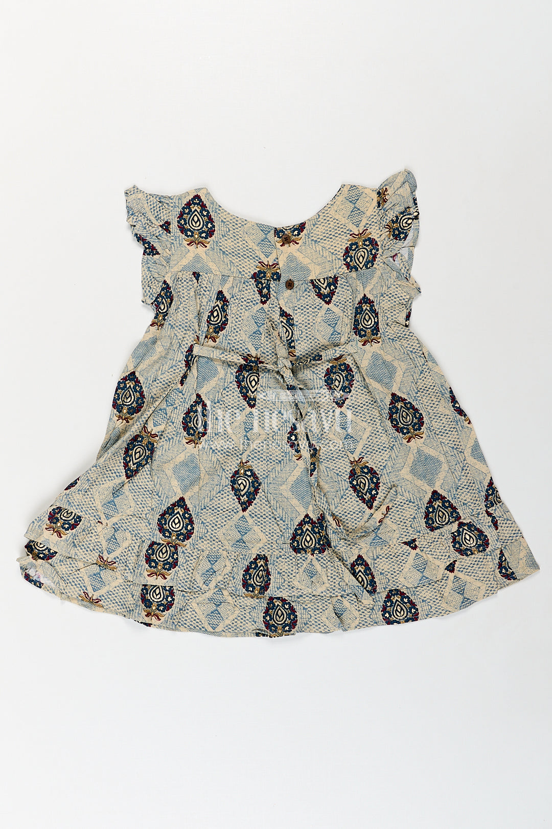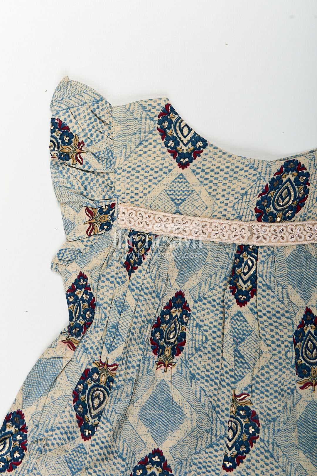 One piece frock online from Nesavu blends a graceful look with everyday comfort. Crafted in soft rayon, this frock features muted green tones layered with ornate digital prints for a refined ethnic vibe. Lightweight and breathable, it comes with ruffled sleeves and pleated detailing below the yoke, making it both functional and fashionable. The ruffle trim at the hem brings a playful finish, making this frock suitable for daily styling and weekend fun.