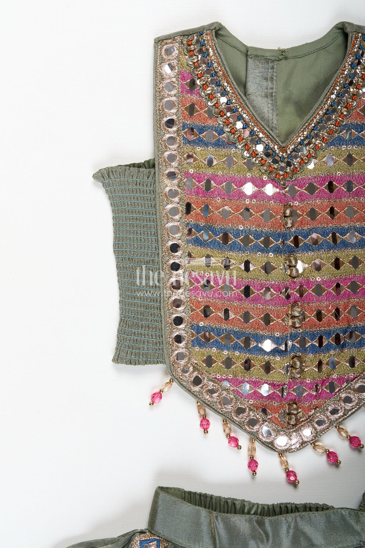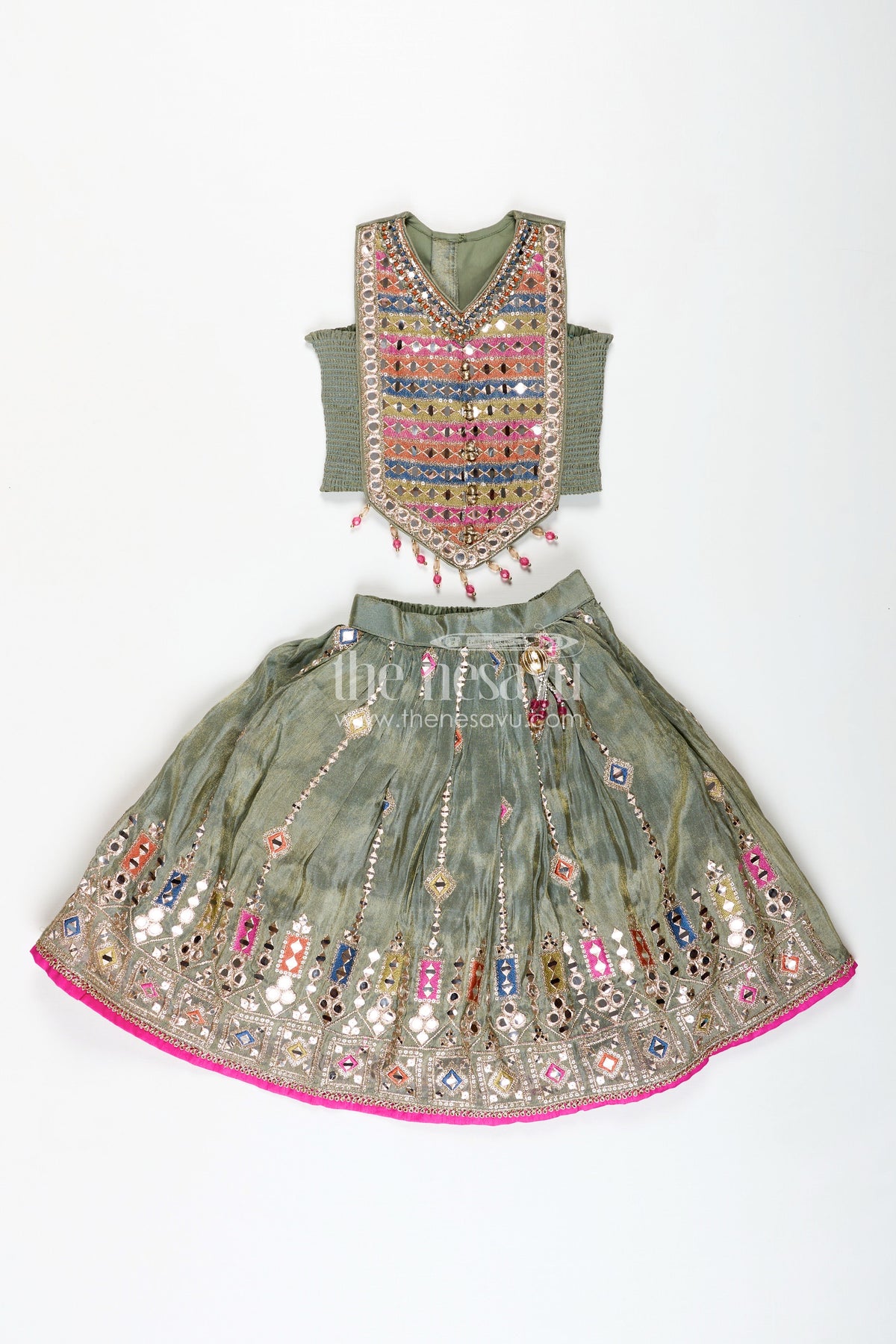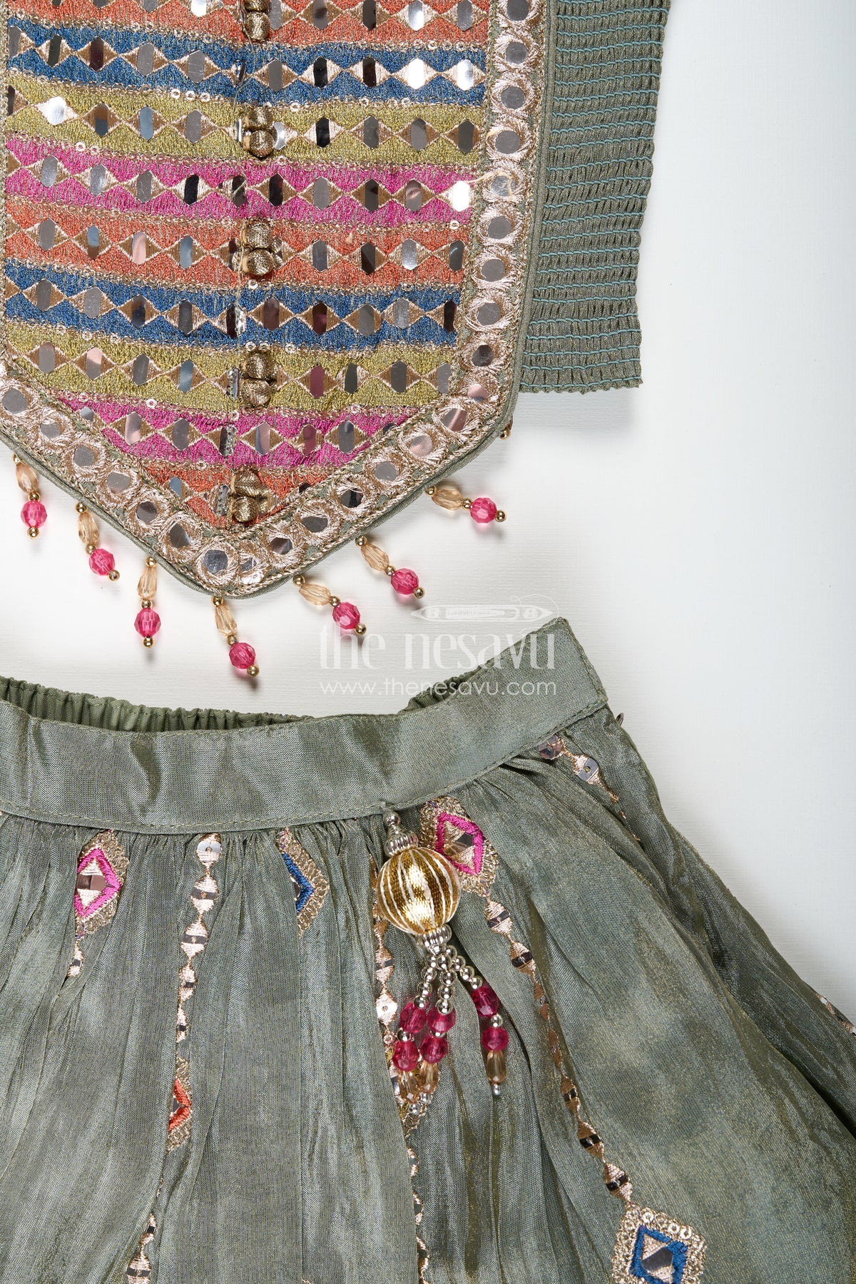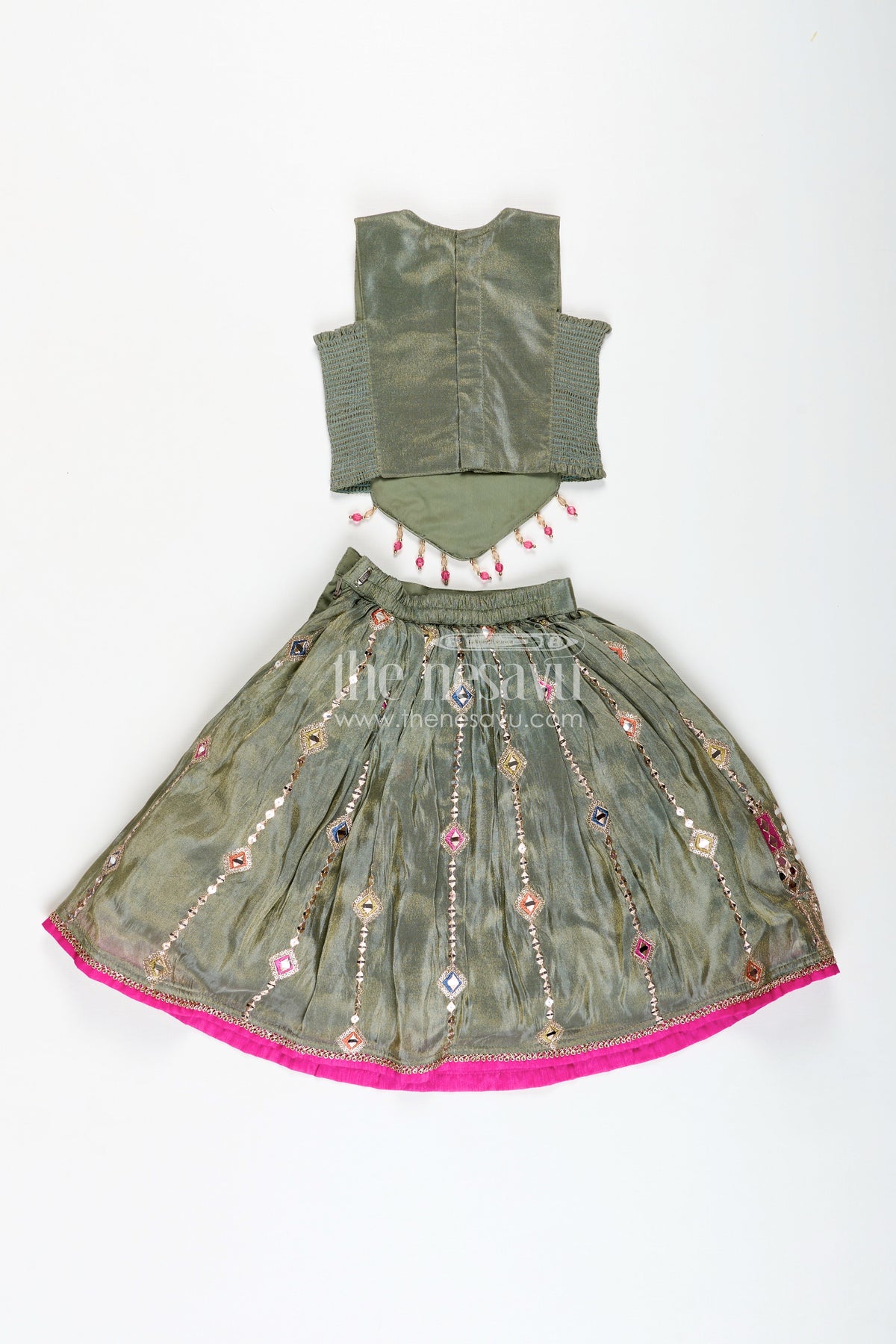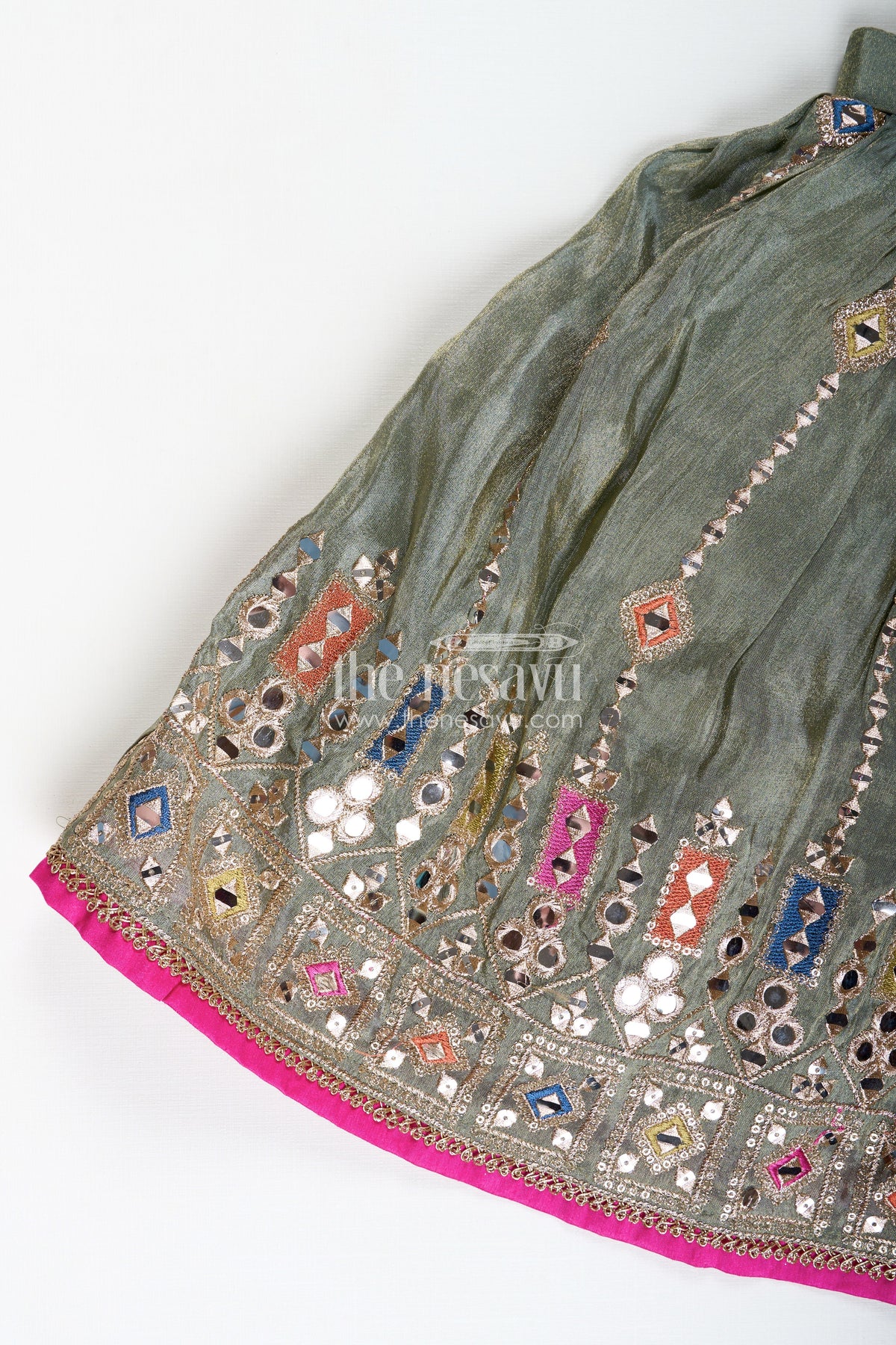 dark olive green lehenga redefines festive elegance with this stunning lehenga choli set crafted in pure tissue viscose silk. This three-piece set features an elaborately embroidered blouse with mirror work, a full flared skirt adorned with traditional motifs, and a matching net dupatta finished with gold border detailing. The deep olive hue enhances the rich embellishments, making it ideal for weddings, cultural events, or special family occasions. Despite its regal appearance, the soft fabric ensures comfort and ease of movement. A true standout in any celebration, this lehenga set is where heritage meets high style.