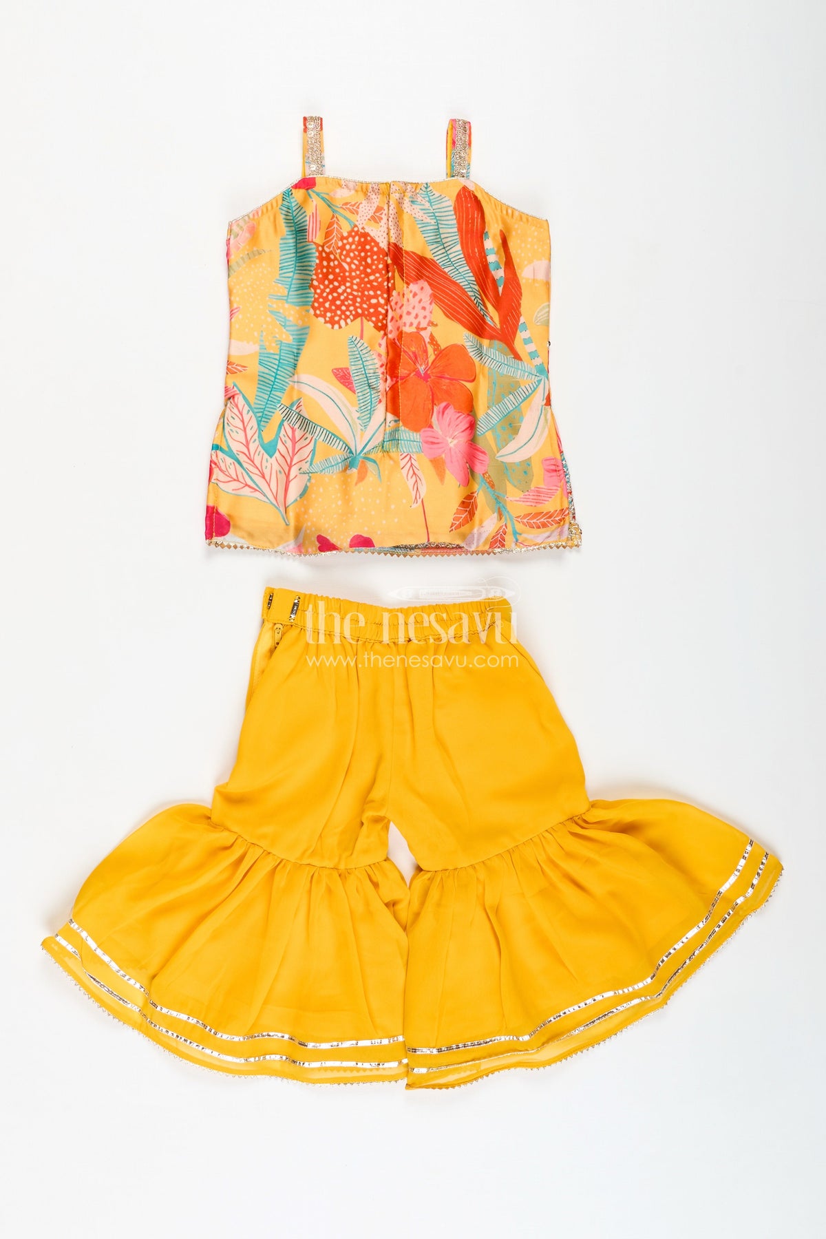 Girls Designer Sharara Suit in vibrant yellow is a statement piece that blends tradition with bold style. The digital printed chinon top is adorned with multicolor floral motifs and mirror-style embellishments, while the ruffled sharara pants bring volume and movement. A matching dupatta completes the coordinated look. This set offers breathable comfort and vivid appeal, making it an excellent option for cultural events, school performances, and festive days. The elastic waistband provides flexibility and ease, and the soft chinon fabric allows free movement without compromising elegance. It's a beautiful mix of tradition and flair designed for young fashionistas who love to stand out.