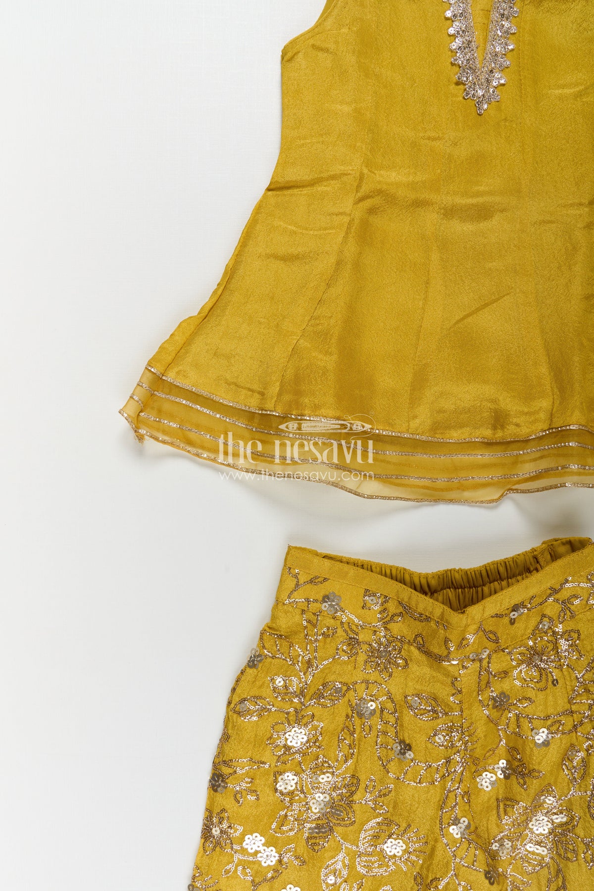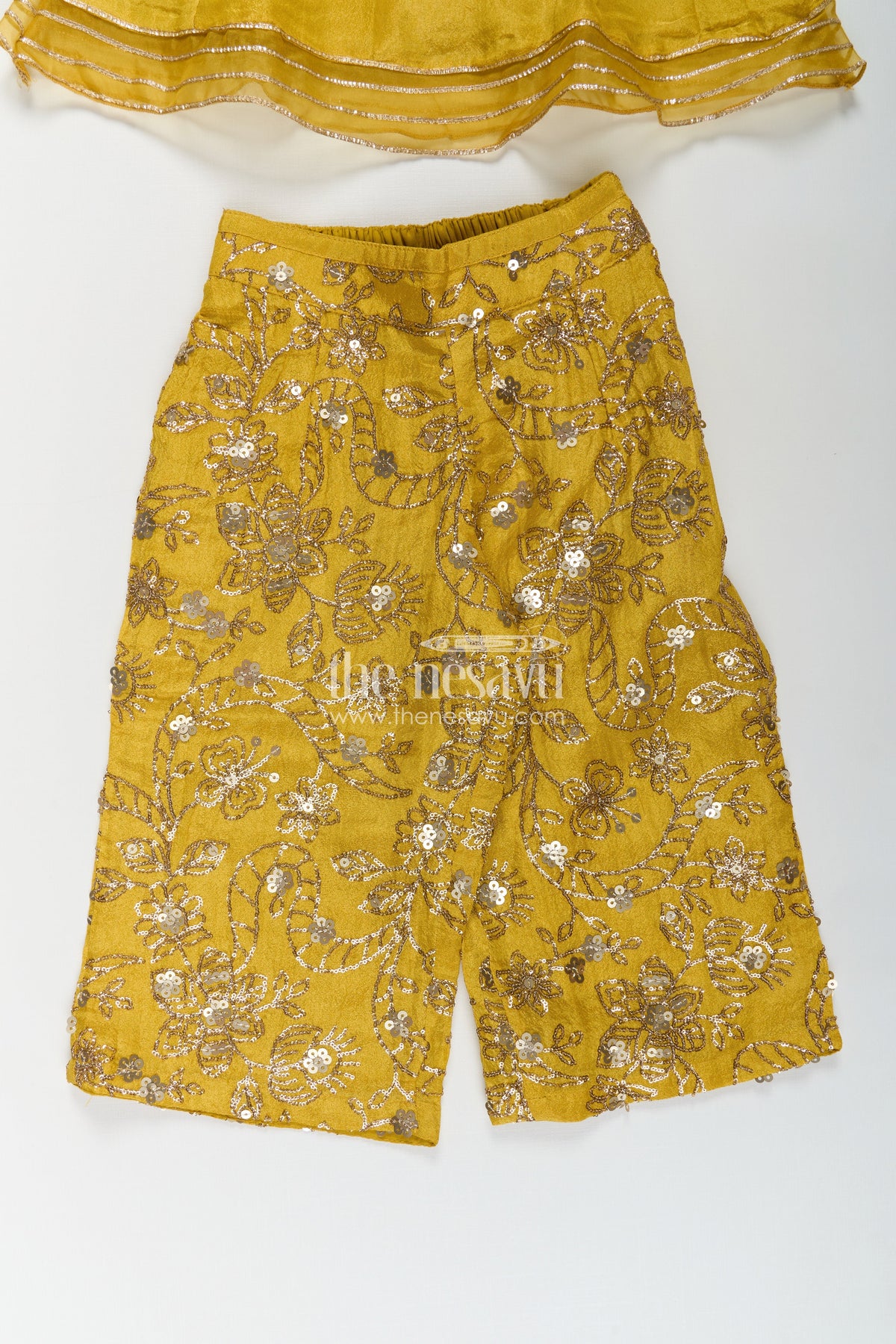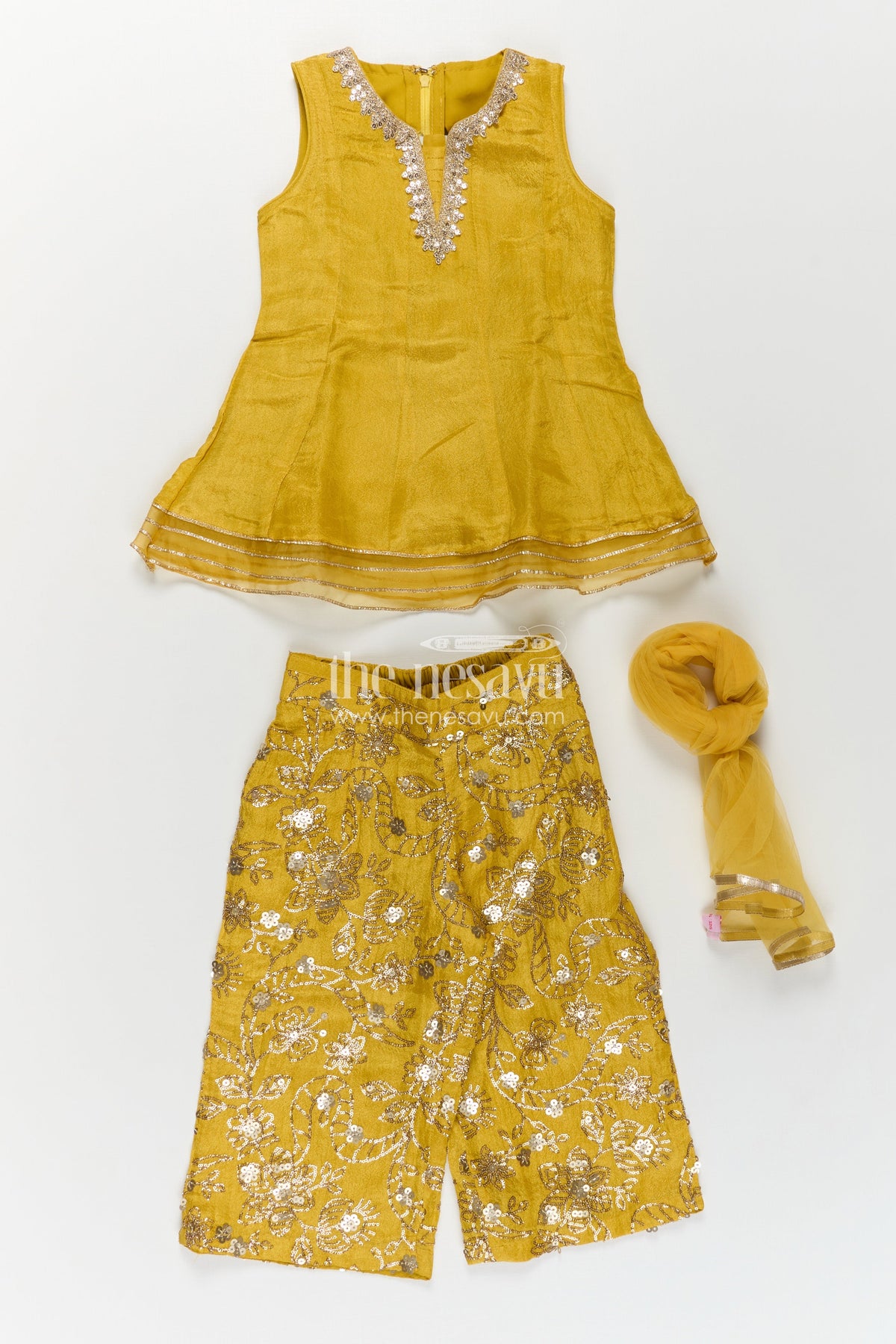 Dress of sharara is beautifully reimagined in this mustard yellow outfit designed for girls who love ethnic fashion. The vibrant peplum top, made of lustrous viscose tissue, is paired with flared sharara pants that feature intricate sequin embroidery in floral patterns. This outfit includes a sheer dupatta and matching sleeves, creating a coordinated traditional ensemble that is easy to wear and move in. The fabric’s breathable nature and lightweight feel make it perfect for extended wear, whether it's a family gathering or school event. With its lively color and thoughtful details, this sharara dress strikes the right balance between festive glamour and child-friendly comfort.