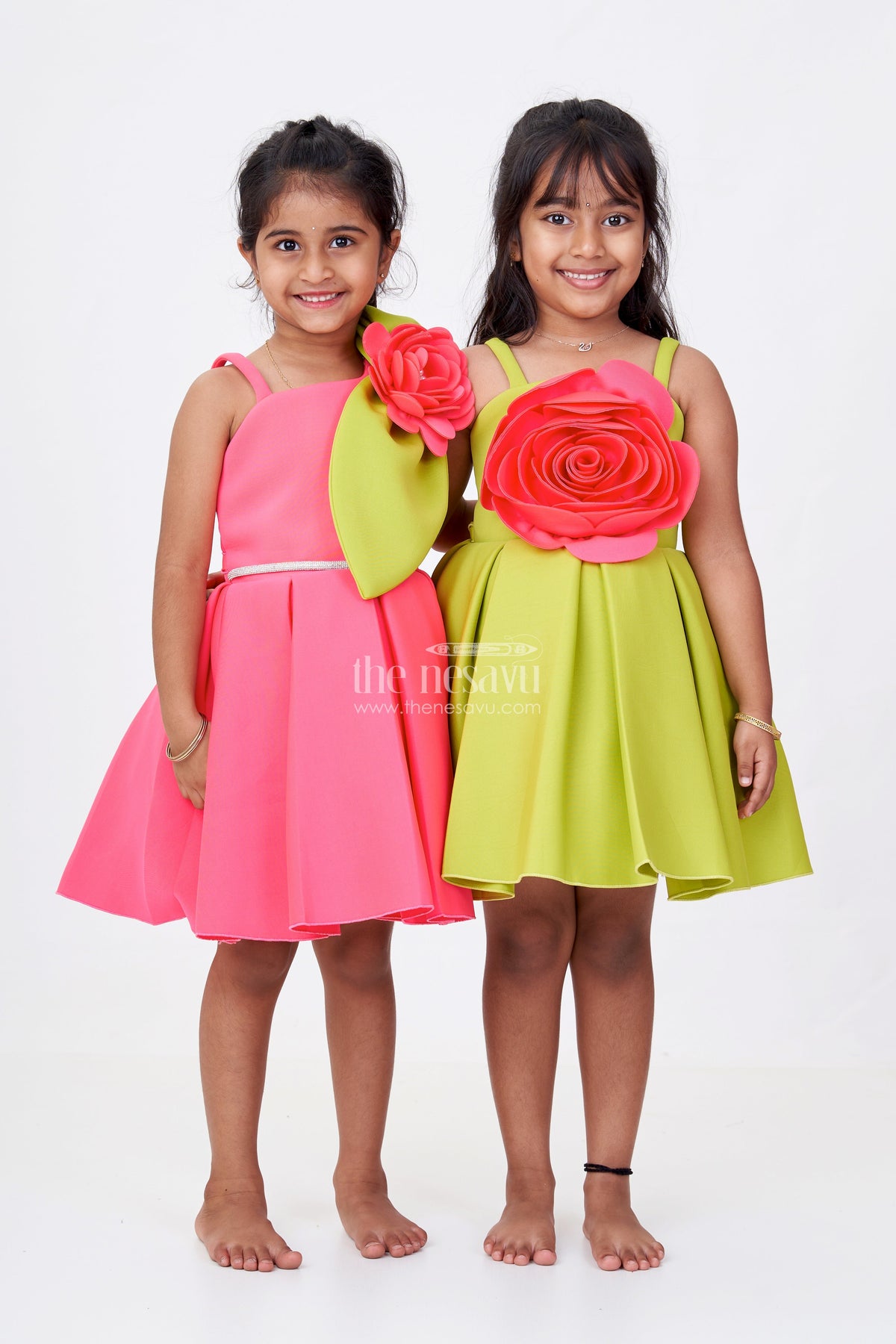 The Nesavu Girls Fancy Party Frock Girls Red Frock Party Wear in Pink Scuba Fabric with Floral Appliqué and Dramatic Green Leaf Accent Nesavu 16 (1Y) / Pink PF211A-16 Girls Red Frock Party Wear Pink Scuba Floral Appliqu Green Leaf Accent Flared Skirt | The Nesavu