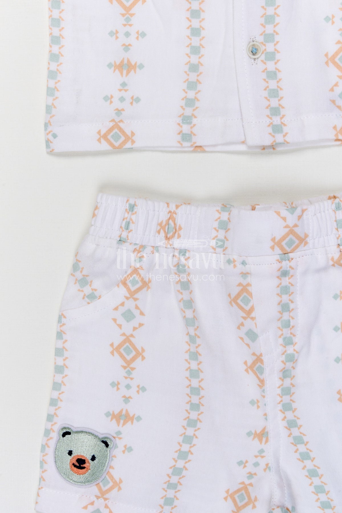 - Design: Printed shirt with collar and matching shorts with patch detail