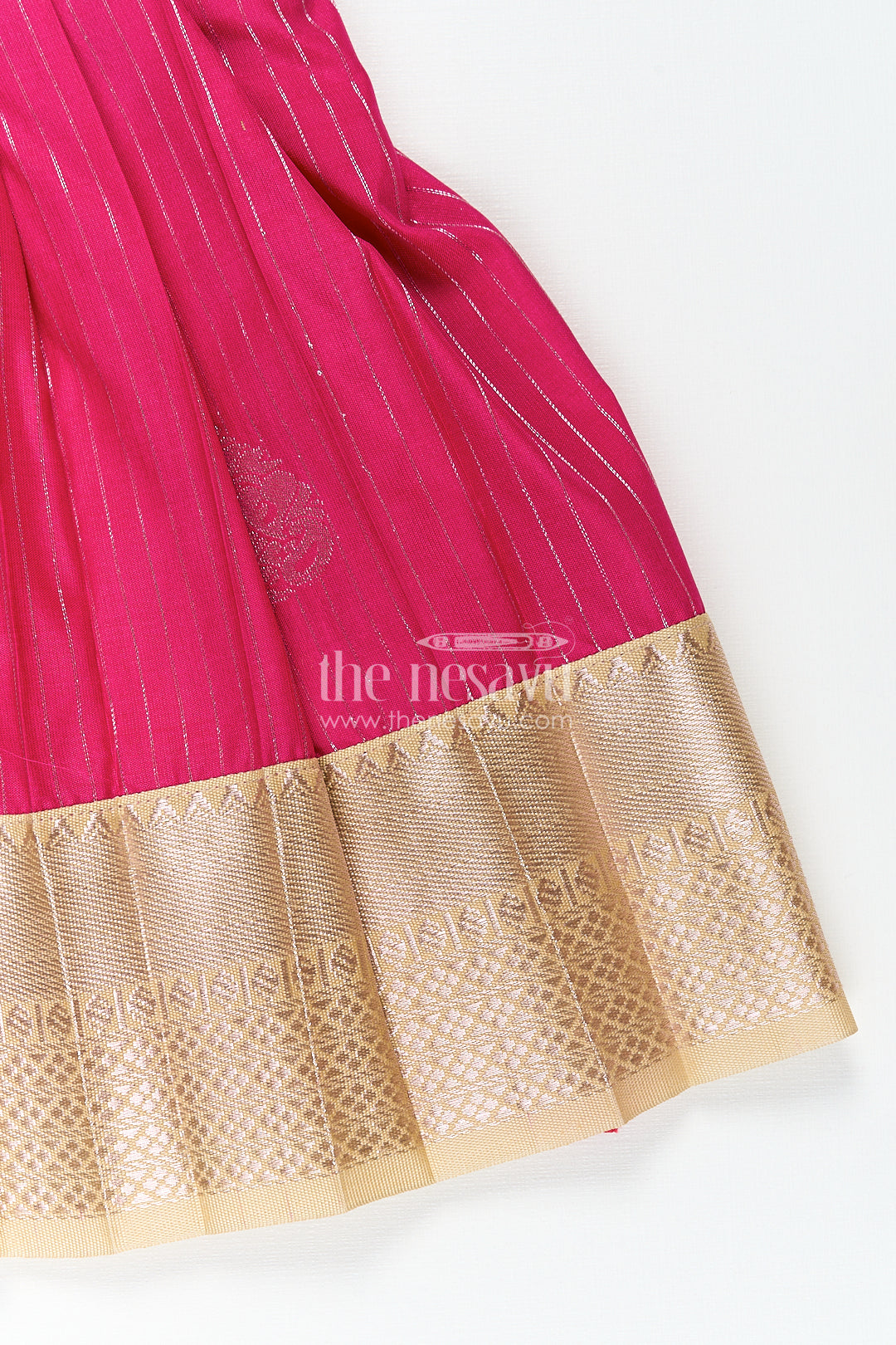 The big border long frocks collection brings you this regal piece designed to add a statement look to your girl's festive wardrobe. This frock is crafted from luxurious semi kanchivaram silk, adorned with a shimmering golden weave that exudes tradition and elegance. The standout feature is its wide, ornate border along the skirt, which offers grandeur with every twirl. The bodice is accentuated with pintuck detailing and lace embellishments, along with a central sequin panel that adds a festive sparkle. The deep red waistband contrasts beautifully with the gold-toned base, enhancing the overall richness of the ensemble. Made for comfort as much as style, this sleeveless frock features a soft inner lining and a breathable fit for ease of wear. The structured pleats and traditional patterning make this big border long frock a showstopper for weddings, festivals, or family occasions. Easy to maintain and wear, it's the ideal blend of classic silk charm and contemporary comfort.