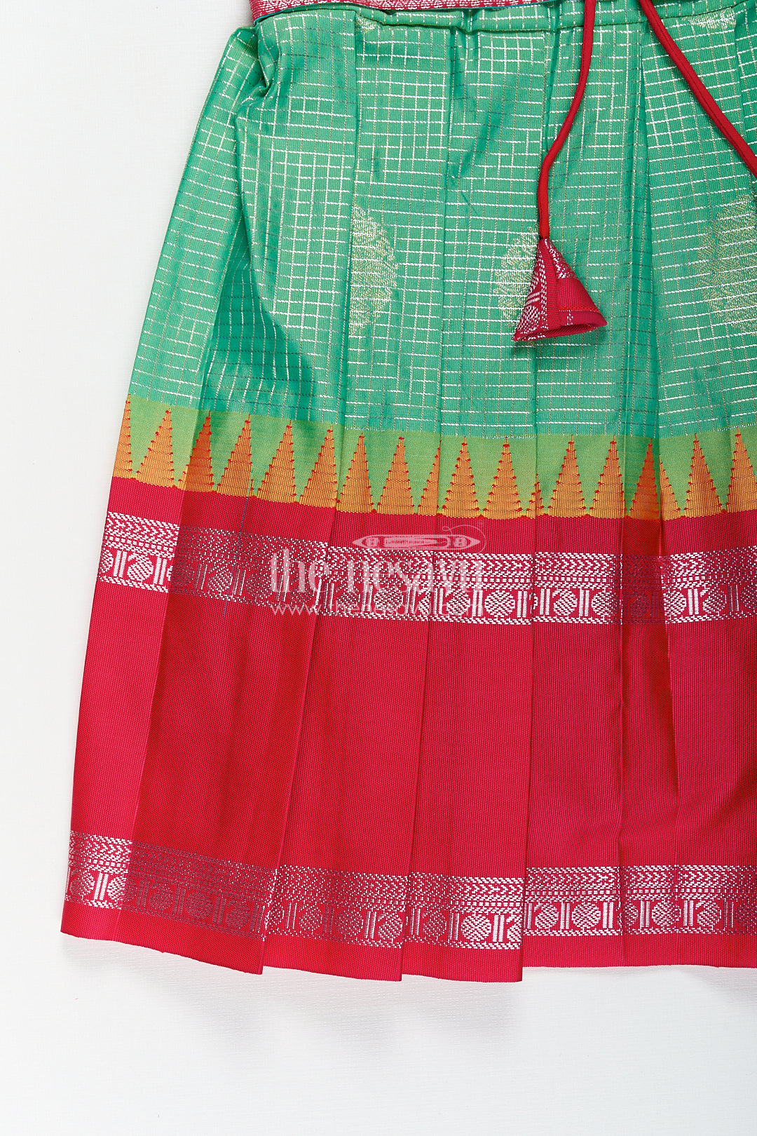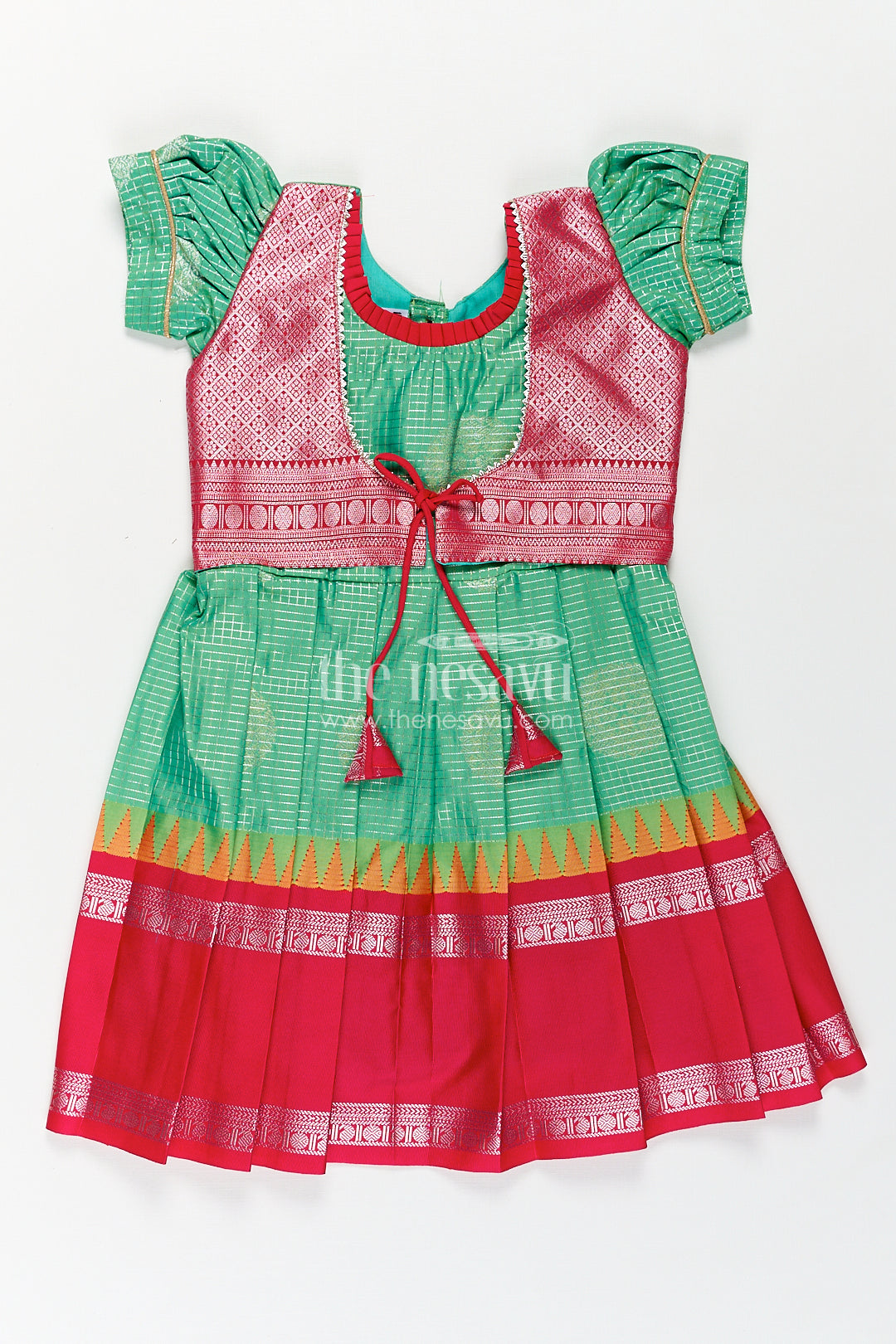 The Nesavu Silk Frock Girls Silk Material Frock Design in Semi Kanchivaram with Green Pleated Skirt and Pink Brocade Yoke Nesavu Nesavu Girls Semi Kanchivaram Silk Material Frock Design Green Body Pink Brocade Yoke Detailing