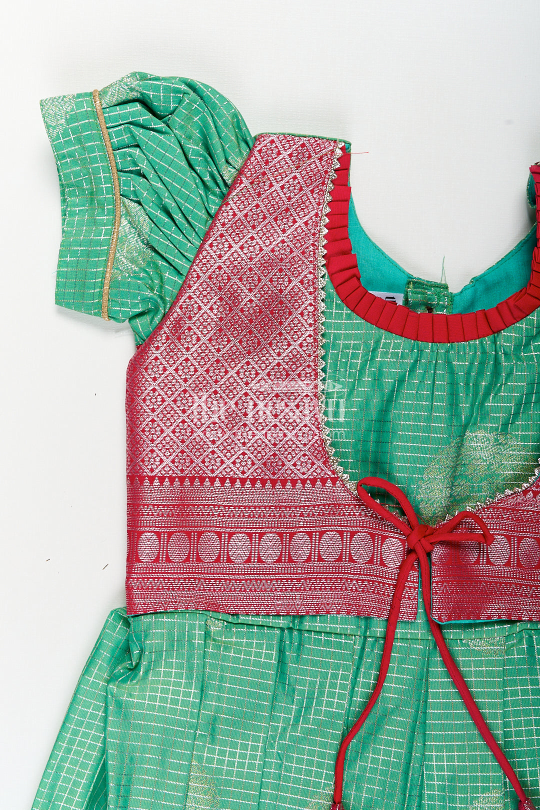 Silk material frock design meets traditional elegance in this delightful girls frock made from semi Kanchivaram silk. Showcasing a vibrant green base with subtle zari motifs, the frock transitions into a bright pink pleated skirt with striking silver zari borders and geometric temple-inspired patterns. The pink brocade yoke with delicate lace trim adds sophistication, while the mock front tie detail adds a playful finish. The puffed sleeves in matching green feature pleated accents for added volume and charm. Perfectly tailored for comfort, this dress includes a soft inner lining and a secure back zip closure, ensuring your little one feels great all day long. Ideal for cultural celebrations or family functions, this piece offers a beautiful balance between heritage styling and child-friendly design. Lightweight and breathable, this frock allows for effortless movement while keeping your child looking festive and fabulous.