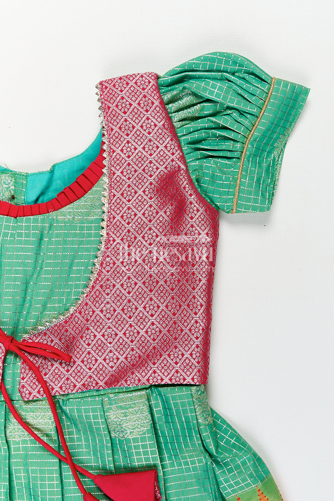 The Nesavu Silk Frock Girls Silk Material Frock Design in Semi Kanchivaram with Green Pleated Skirt and Pink Brocade Yoke Nesavu 14 (6M) / Green / Style 2 SF857BB-14 Nesavu Girls Semi Kanchivaram Silk Material Frock Design Green Body Pink Brocade Yoke Detailing