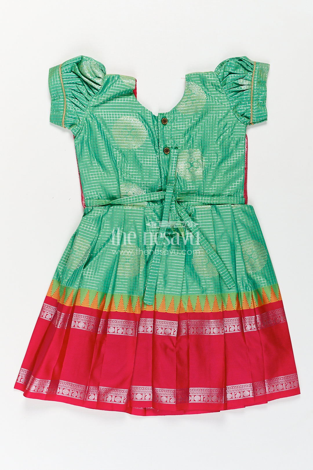The Nesavu Silk Frock Girls Silk Material Frock Design in Semi Kanchivaram with Green Pleated Skirt and Pink Brocade Yoke Nesavu 14 (6M) / Green / Style 1 SF857BA-14 Nesavu Girls Semi Kanchivaram Silk Material Frock Design Green Body Pink Brocade Yoke Detailing
