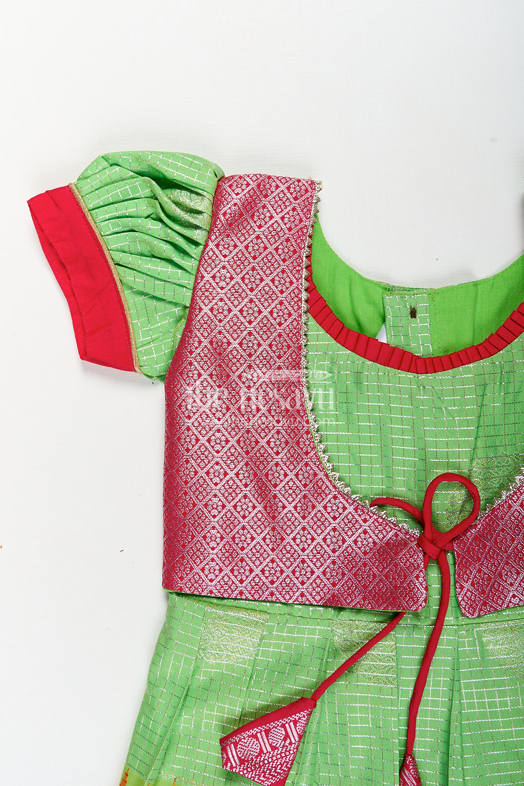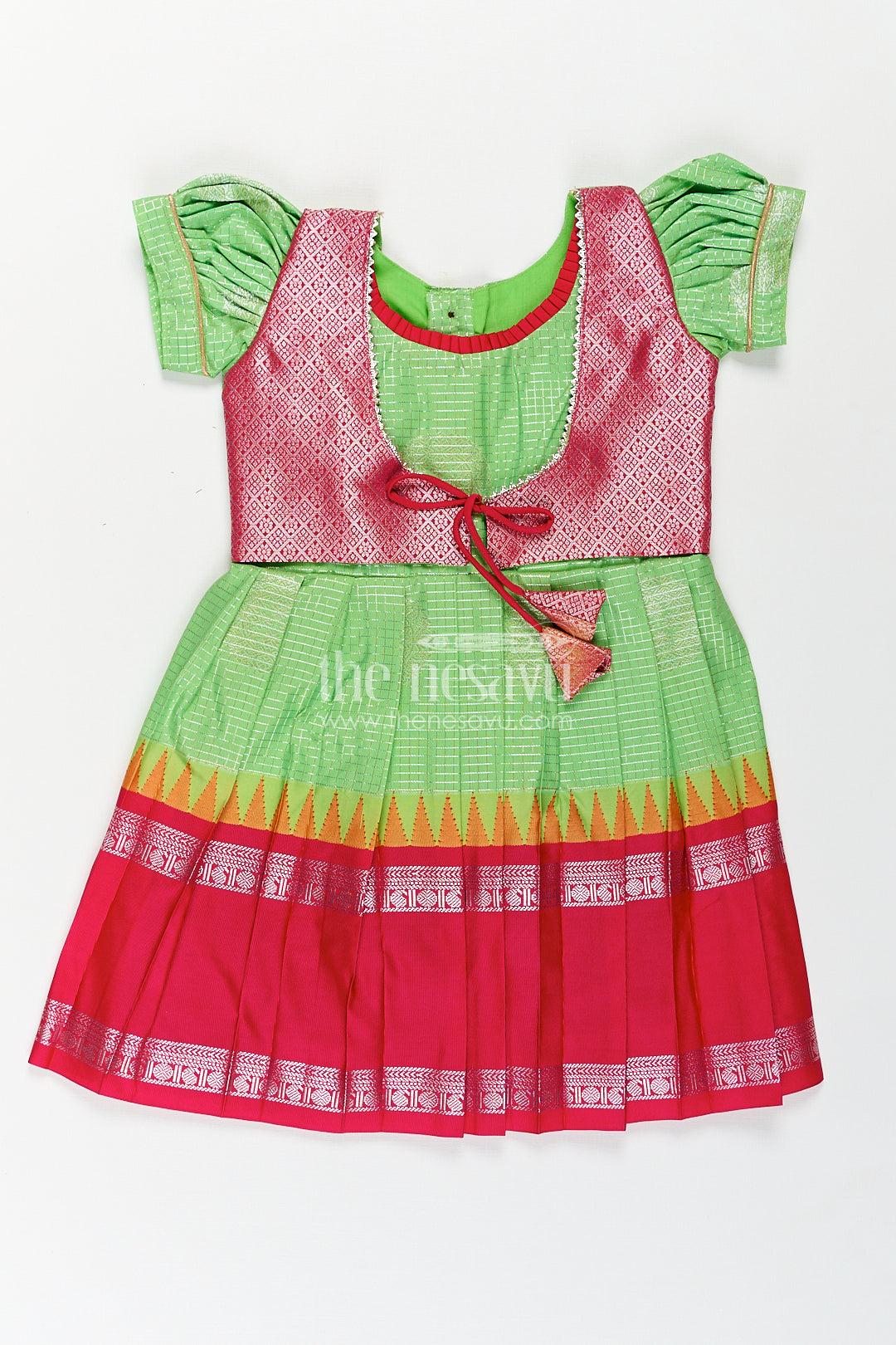 The Nesavu Silk Frock Girls Silky Long Frock in Semi Kanchivaram with Rich Pink Zari Pleats and Green Patterned Bodice Nesavu 14 (6M) / Green / Style 2 SF857DB-14 Nesavu Girls Silky Long Frock Semi Kanchivaram Green Bodice Pink Zari Border Pleated Skirt
