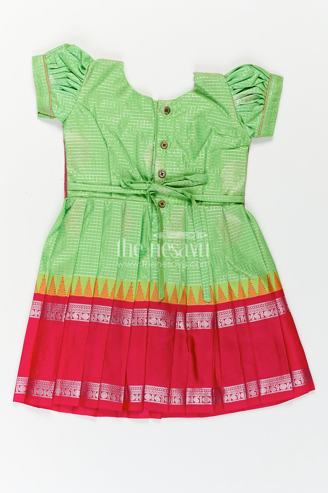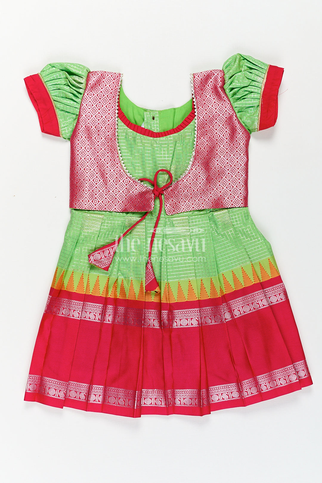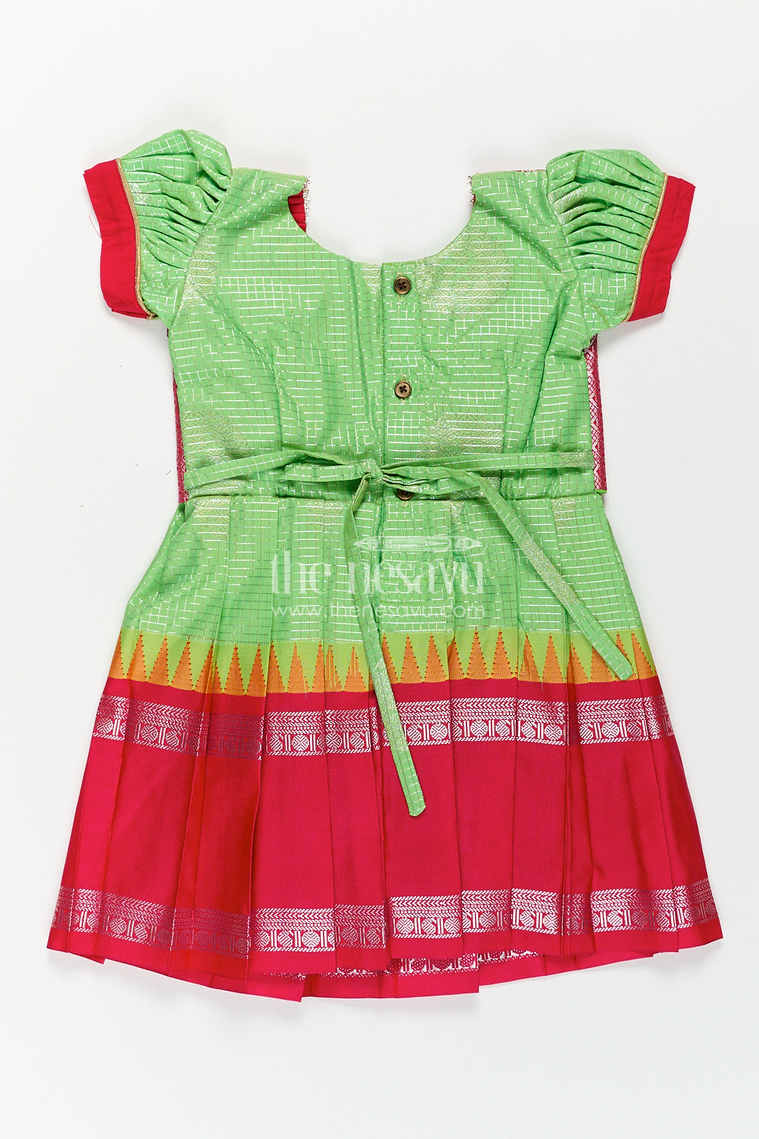 The Nesavu Silk Frock Girls Silky Long Frock in Semi Kanchivaram with Rich Pink Zari Pleats and Green Patterned Bodice Nesavu 14 (6M) / Green / Style 3 SF857DC-14 Nesavu Girls Silky Long Frock Semi Kanchivaram Green Bodice Pink Zari Border Pleated Skirt