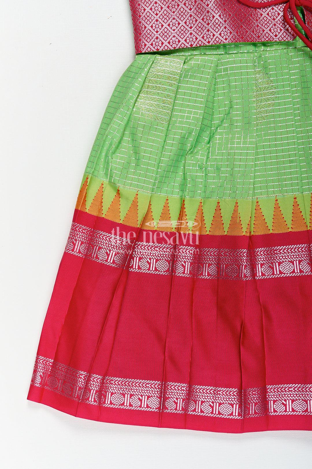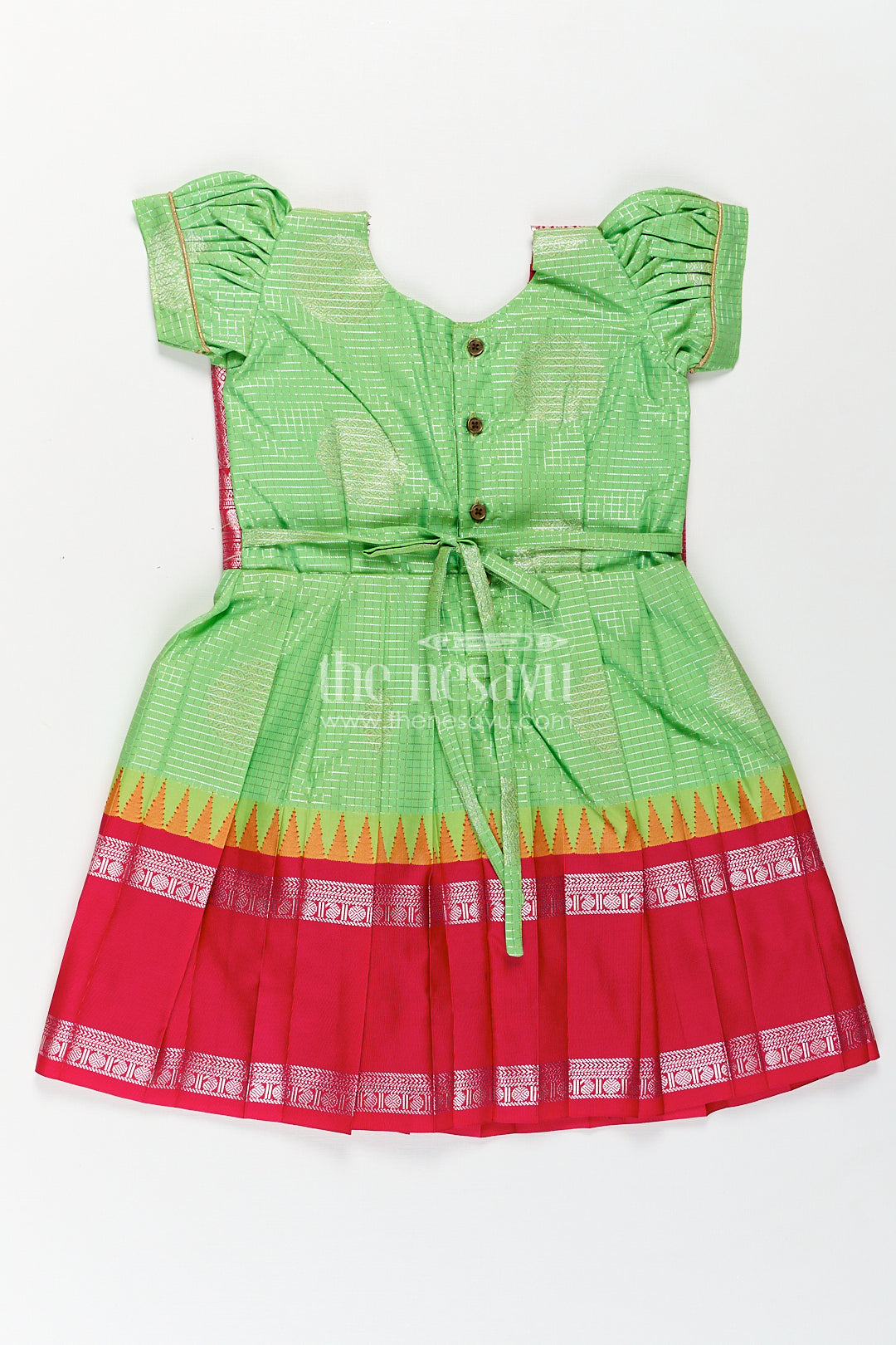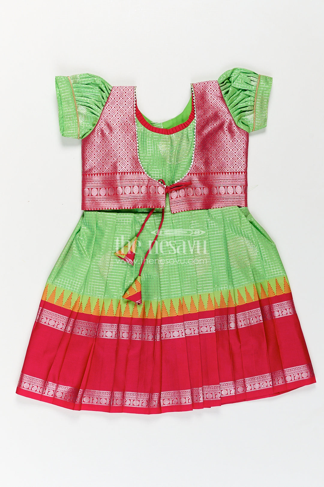 The Nesavu Silk Frock Girls Silky Long Frock in Semi Kanchivaram with Rich Pink Zari Pleats and Green Patterned Bodice Nesavu 14 (6M) / Green / Style 3 SF857DC-14 Nesavu Girls Silky Long Frock Semi Kanchivaram Green Bodice Pink Zari Border Pleated Skirt
