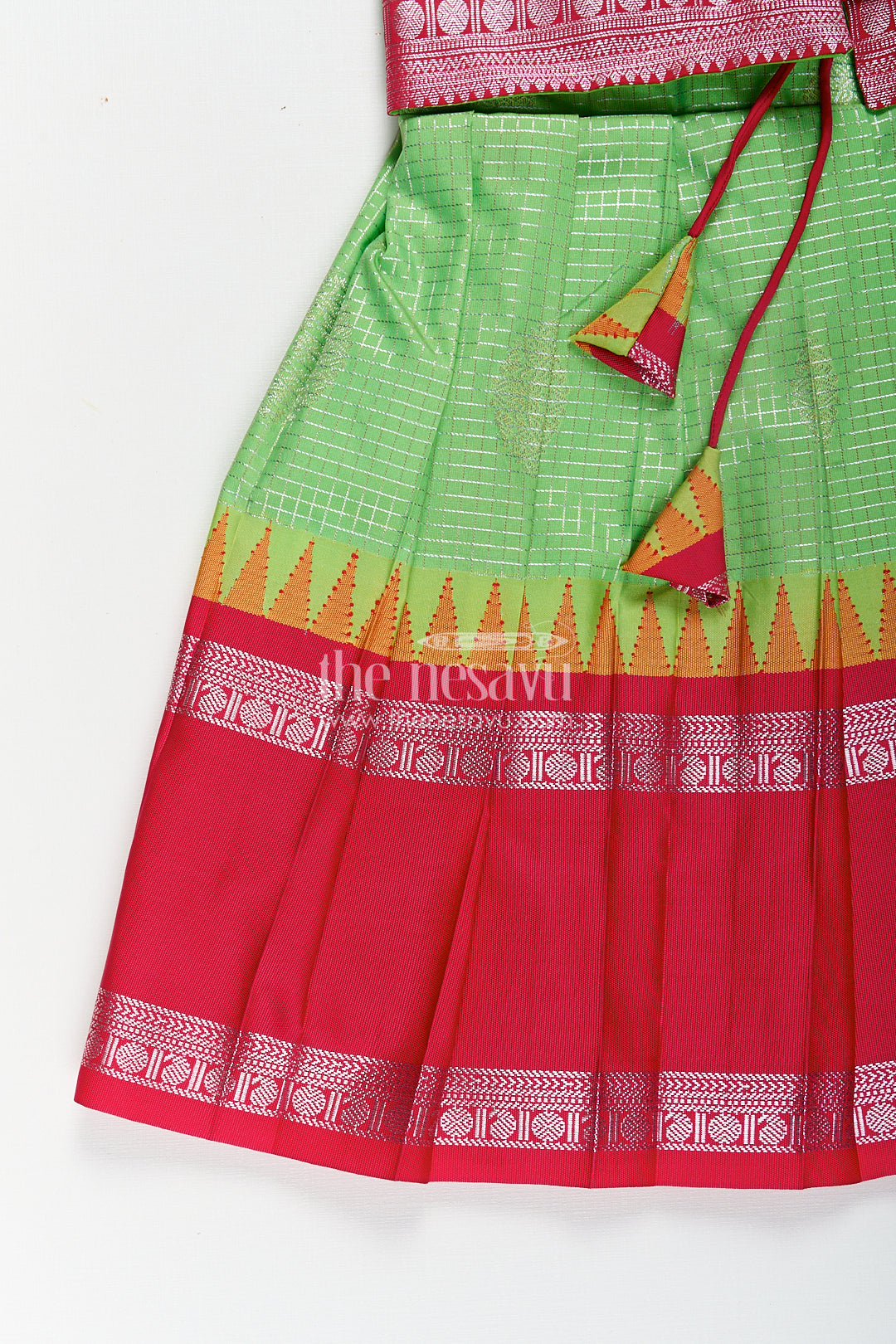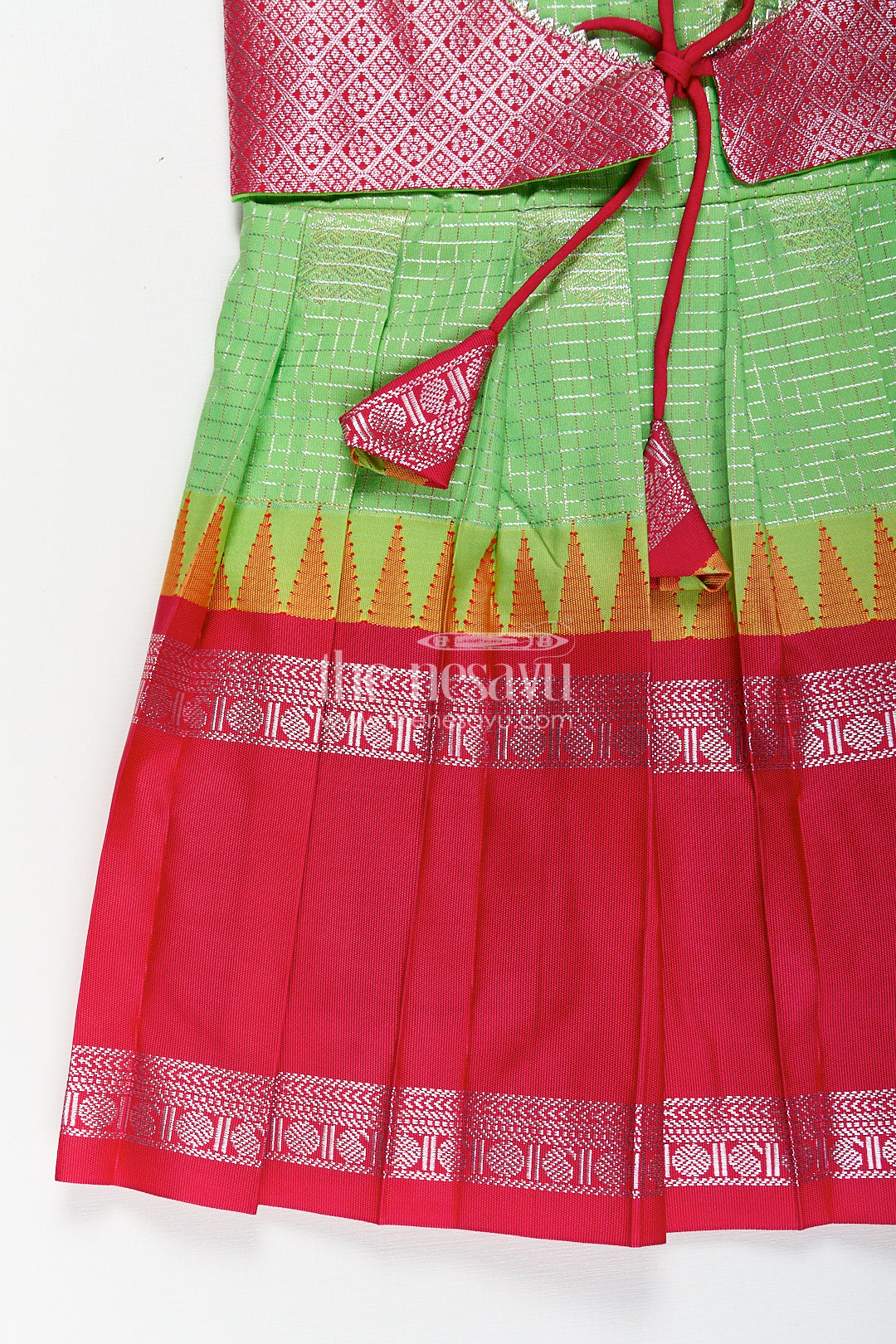 The Nesavu Silk Frock Girls Silky Long Frock in Semi Kanchivaram with Rich Pink Zari Pleats and Green Patterned Bodice Nesavu Nesavu Girls Silky Long Frock Semi Kanchivaram Green Bodice Pink Zari Border Pleated Skirt