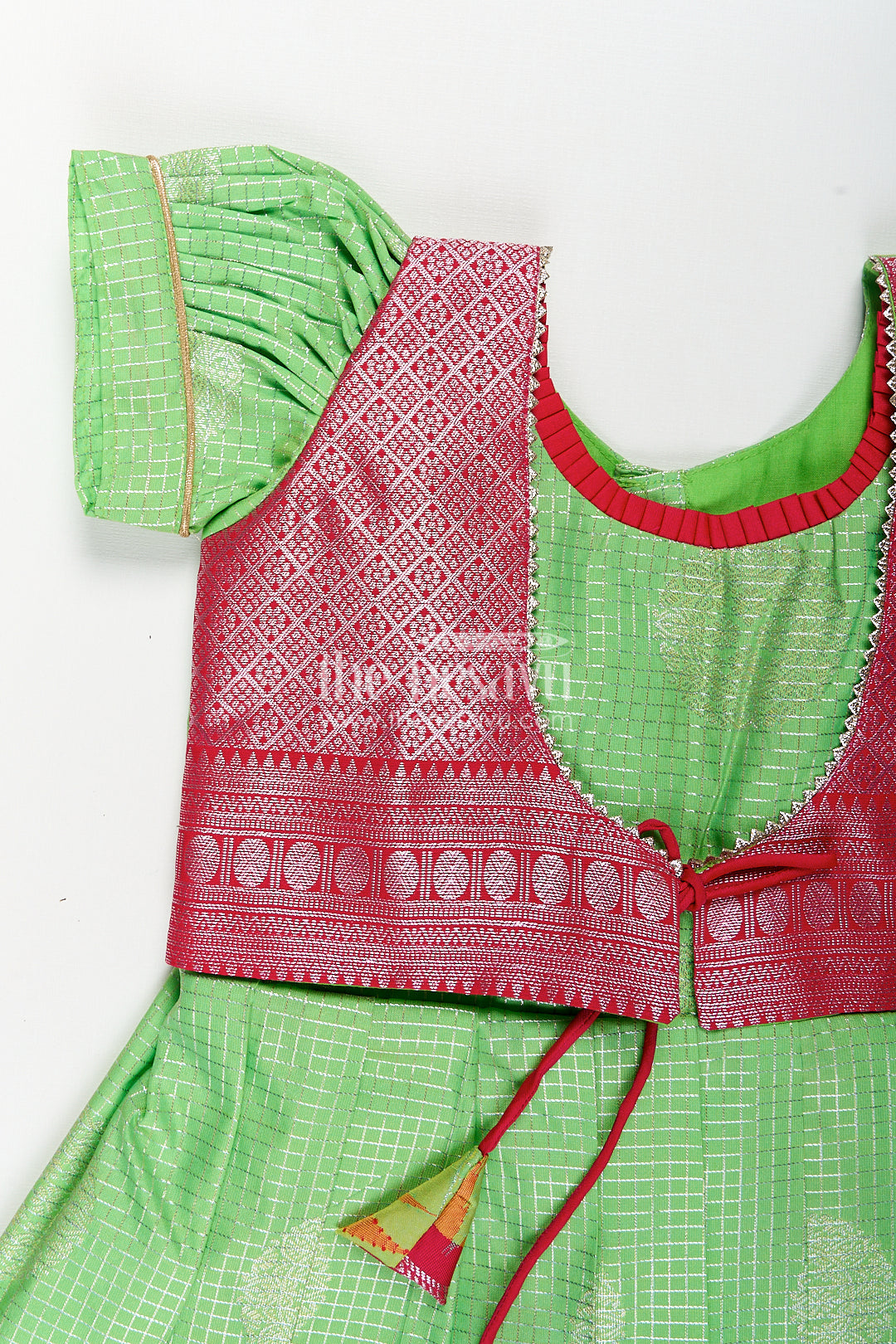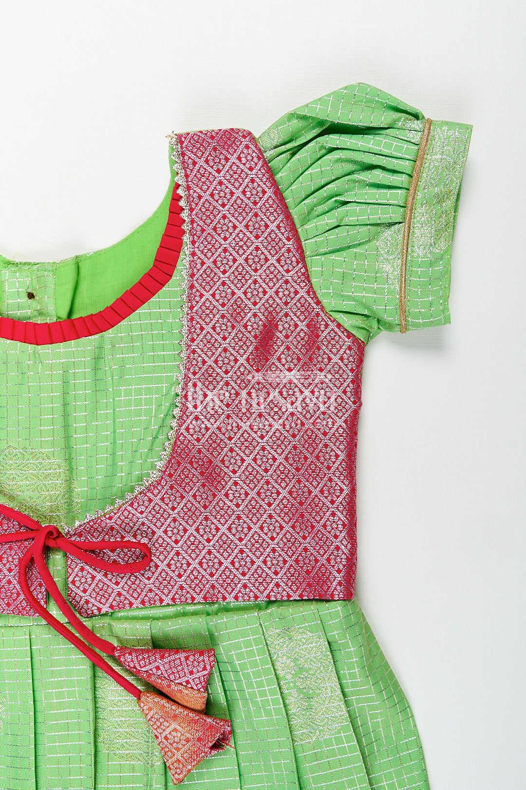 Silky long frock styles reach new heights with this captivating girls frock made from premium semi Kanchivaram silk. The vivid green upper body features subtle grid patterns and shimmering zari accents, beautifully complemented by the deep pink pleated skirt finished with intricate zari borders. A pink brocade yoke with dainty lace trim and a mock tie detail adds an extra layer of charm and refinement to the piece. The puffed sleeves in matching green enhance the traditional aesthetic while ensuring comfort for young wearers. This frock blends elegance and functionality, making it perfect for cultural festivities or formal family gatherings. With its soft lining, breathable fabric, and easy back zip closure, the dress provides all-day wearability without compromising on style. Whether she’s twirling at a celebration or sitting for photos, your little one will feel comfortable and look regal in this timeless design.