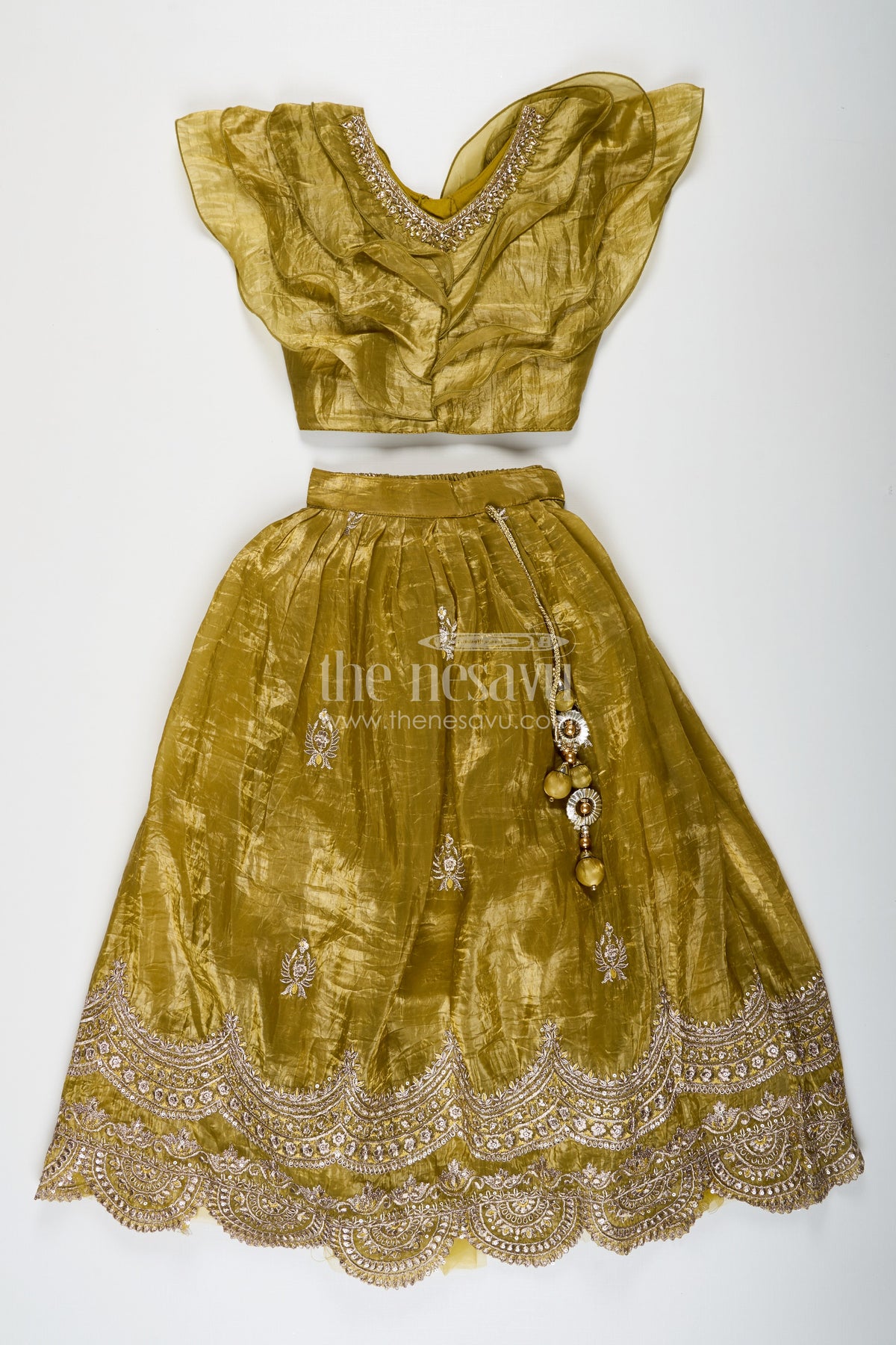 The Nesavu Girls Lehenga Choli Girls Indian Traditional Wear in Olive Green Organza with Zari Embroidered Lehenga and Ruffle Top Nesavu Nesavu Girls Indian Traditional Wear with Olive Green Zari Embroidered Organza Lehenga and Ruffle Top