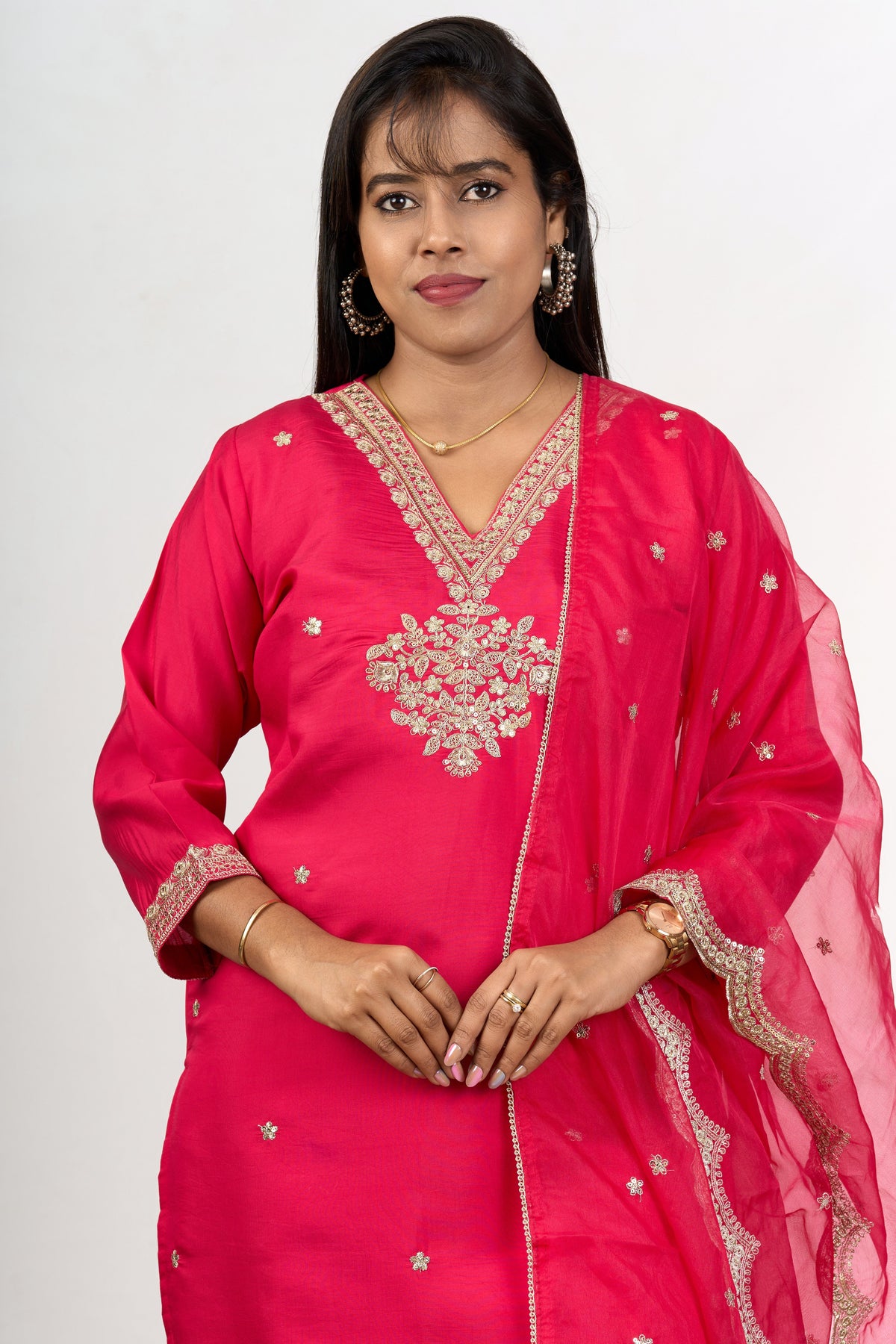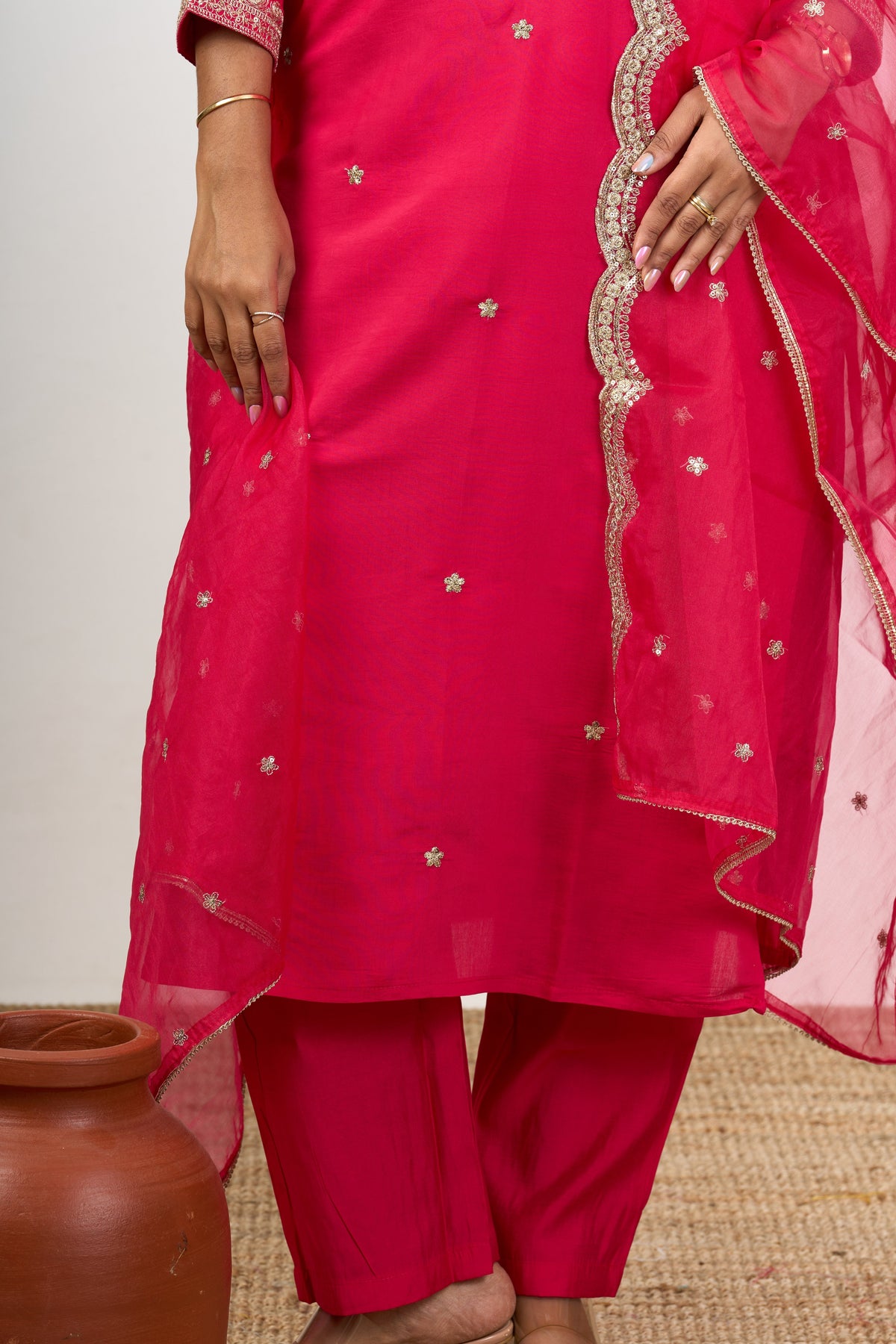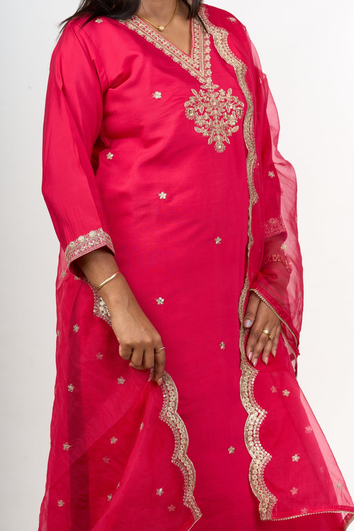Make a bold statement at Lohri celebrations with this stunning red suit set. Designed with luxurious blend silk fabric, the kurta features detailed gold zari embroidery along the neckline, hem, and sleeves. The sheer red dupatta is adorned with elegant gold scalloped borders that exude grandeur. Paired with comfortable straight-cut pants, this ensemble blends traditional craftsmanship with modern comfort. Perfect for festive gatherings, family functions, and cultural celebrations, this outfit radiates elegance and class.