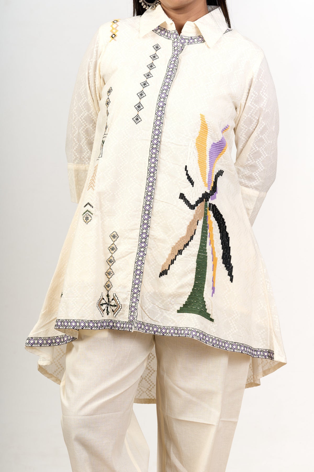 Redefine elegance with this knitted co-ord trouser set for women, crafted from soft, breathable cotton fabric. The ensemble showcases a modern design with straight trousers and an asymmetrical shirt top adorned with delicate geometric patterns and embroidered details. This outfit offers an impeccable fit, making it a versatile addition to your collection. The neutral tones combined with intricate embroidery create a timeless look that suits any formal gathering, office setting, or casual outing. Experience all-day comfort while exuding grace and sophistication.