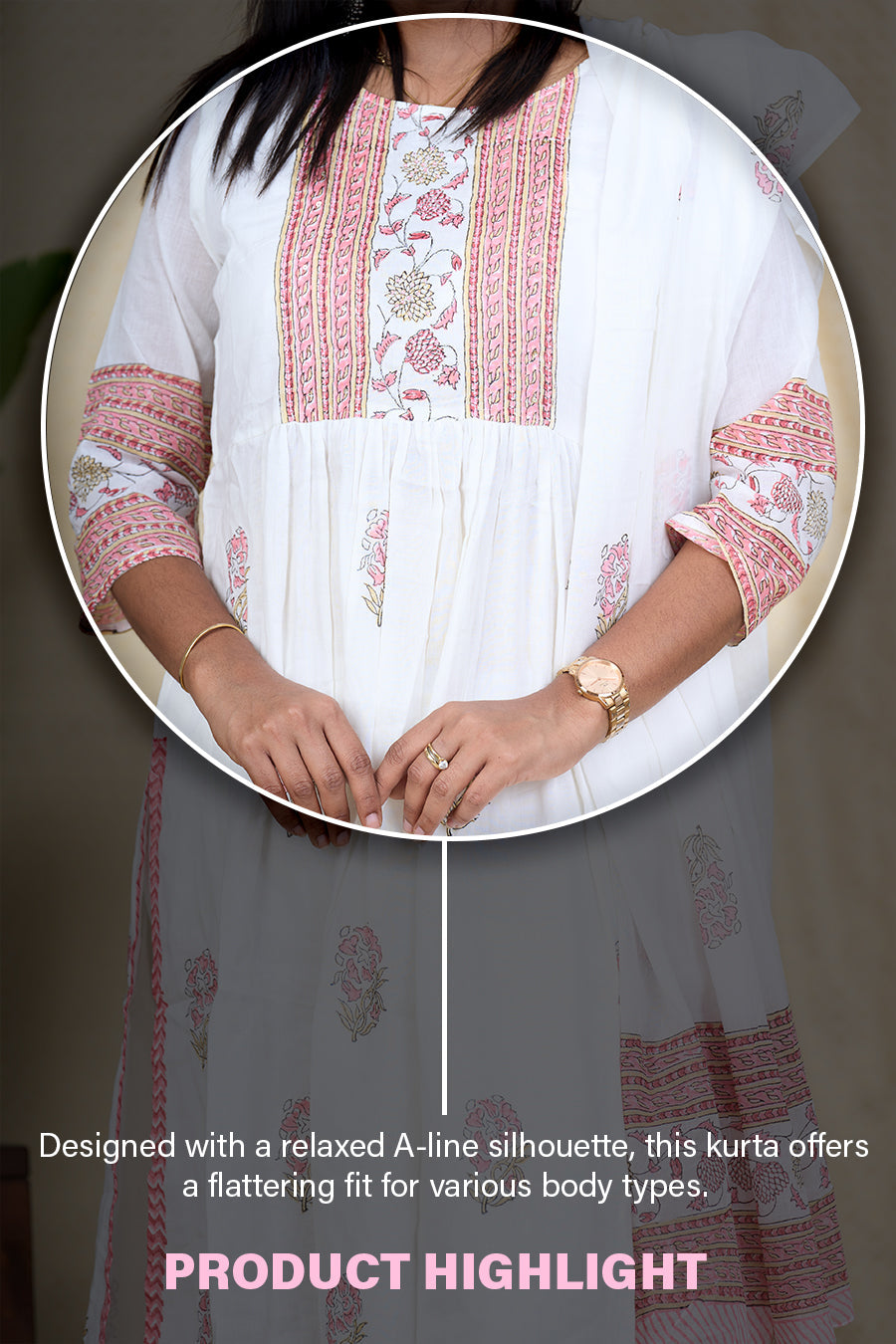Enhance your ethnic wardrobe with this elegant three-piece salwar suit set, crafted from 100% pure soft cotton. Featuring intricate hand block printing, this set includes a kurta with a sequence-embroidered U-neckline and Aari embroidery, straight-cut pants, and a matching Mul cotton dupatta. The kurta is adorned with delicate floral motifs and 3/4 sleeves, making it a perfect choice for both casual and festive occasions.