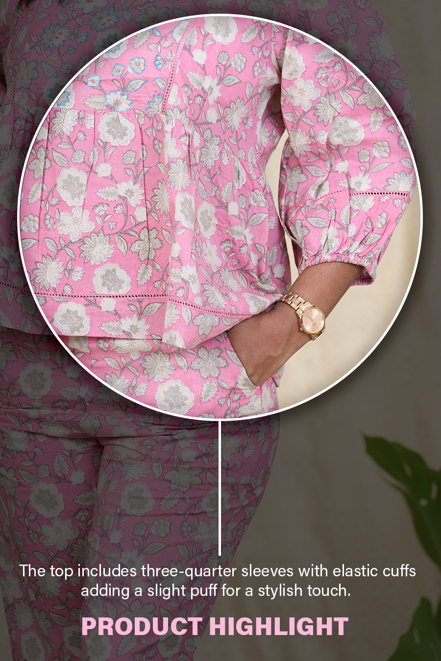 Elevate your Indo Western wardrobe with this trendy cotton co-ord set for women. Featuring a stylish peplum top with a flattering V-neck and 3/4 sleeves, this outfit effortlessly combines comfort and fashion. The straight-cut pants add a modern touch, making this set perfect for both casual outings and semi-formal events. Crafted from high-quality cotton, this co-ord set is designed to keep you cool and comfortable throughout the day. The delicate floral print enhances its feminine appeal, making it a must-have addition to your collection.