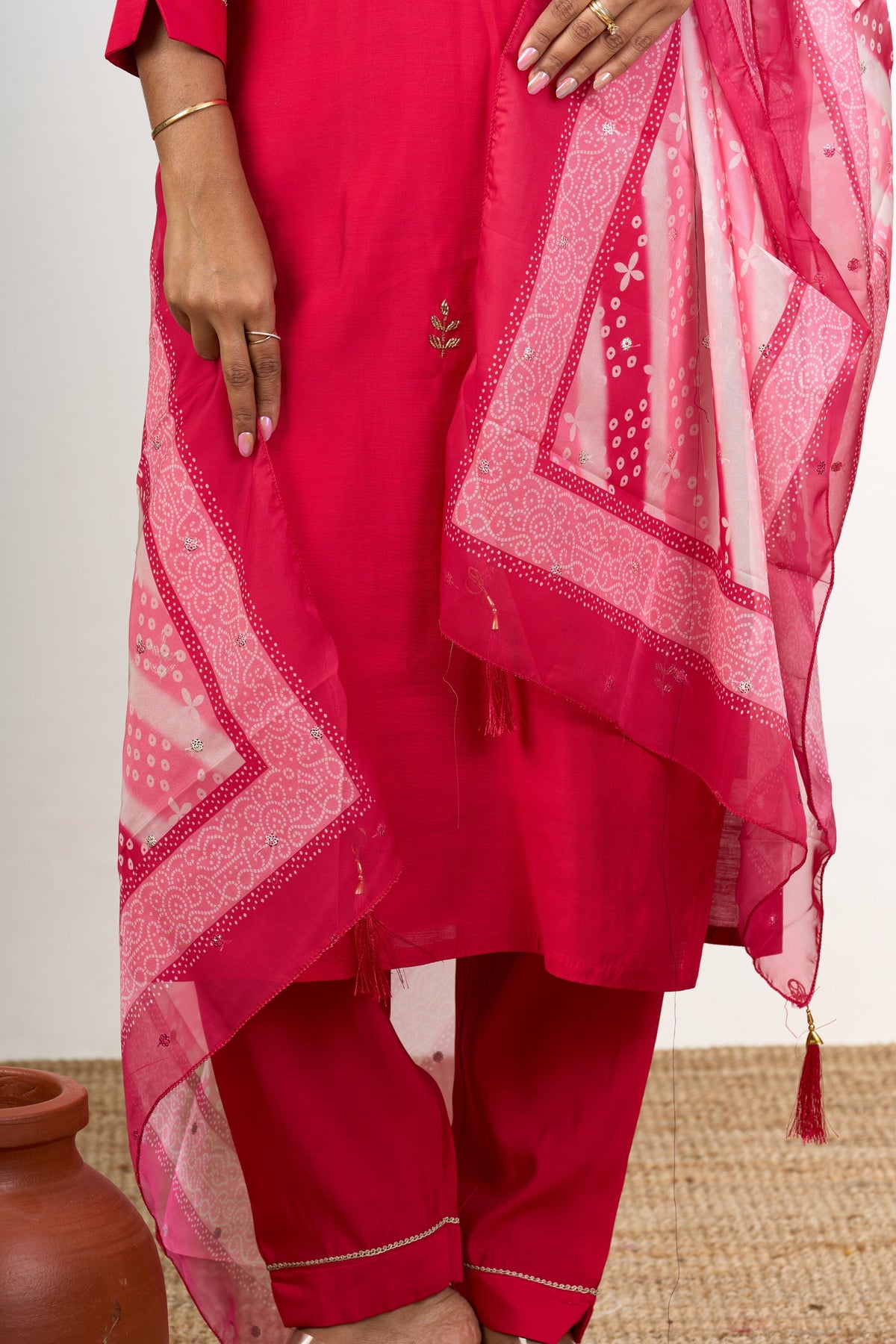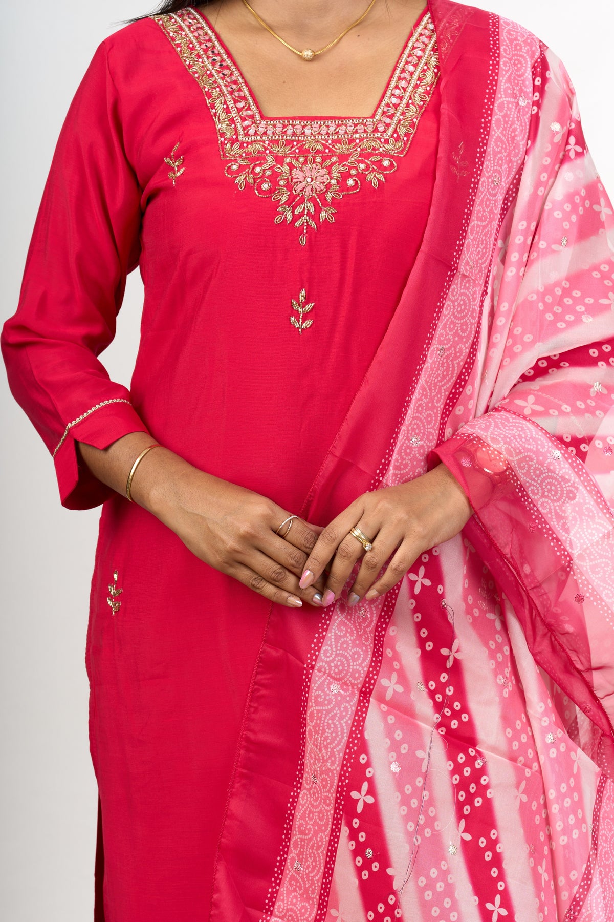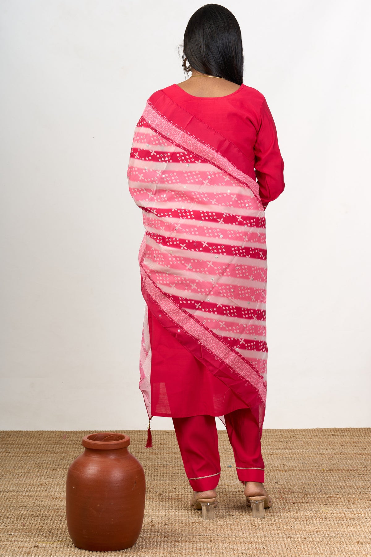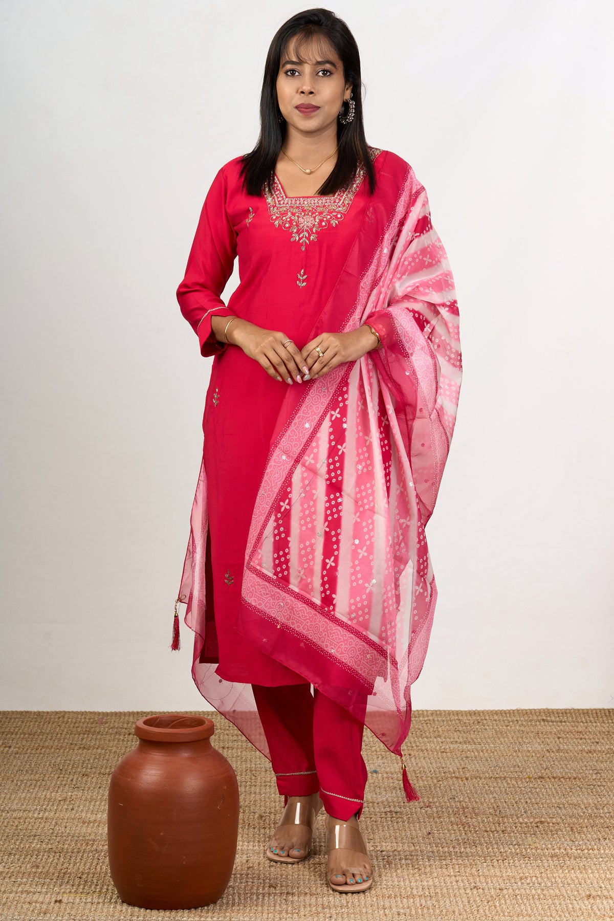 Embrace tradition with this gorgeous pant kurti dupatta set, designed in a rich red blend silk fabric. The kurti features exquisite gold embroidery on the neckline and sleeves, adding a regal touch to the outfit. Tailored pants ensure a comfortable fit, while the printed dupatta showcases bold patterns that beautifully complement the kurti. Perfect for Pongal celebrations or a formal holiday gathering, this outfit is a harmonious blend of elegance and practicality. The premium fabric offers breathable comfort, making it an excellent choice for day-long wear during festive occasions.