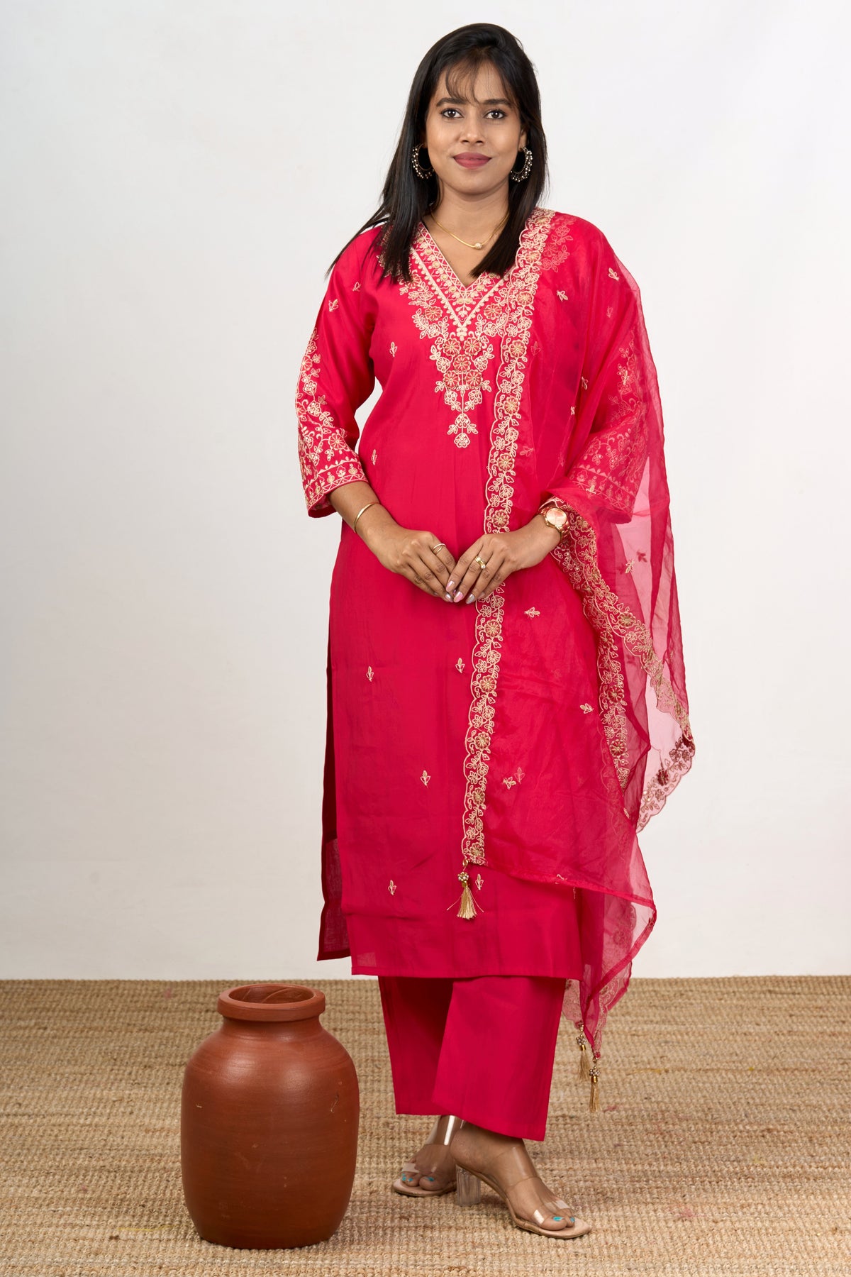 Experience effortless elegance with this blend silk kurtis set for women, crafted with traditional design elements and contemporary style. The bright red kurta features intricate gold embroidery along the neckline and throughout the bodice, adding a touch of luxury to its design. The lightweight and flowy dupatta, adorned with matching embroidery, enhances the outfit's festive appeal. Perfect for family gatherings, traditional celebrations, or special functions, this kurta set promises a comfortable fit and timeless elegance.